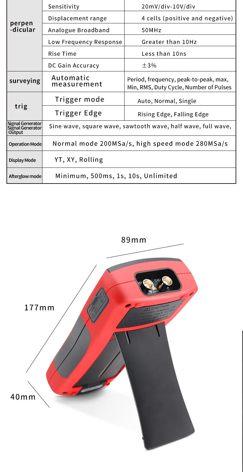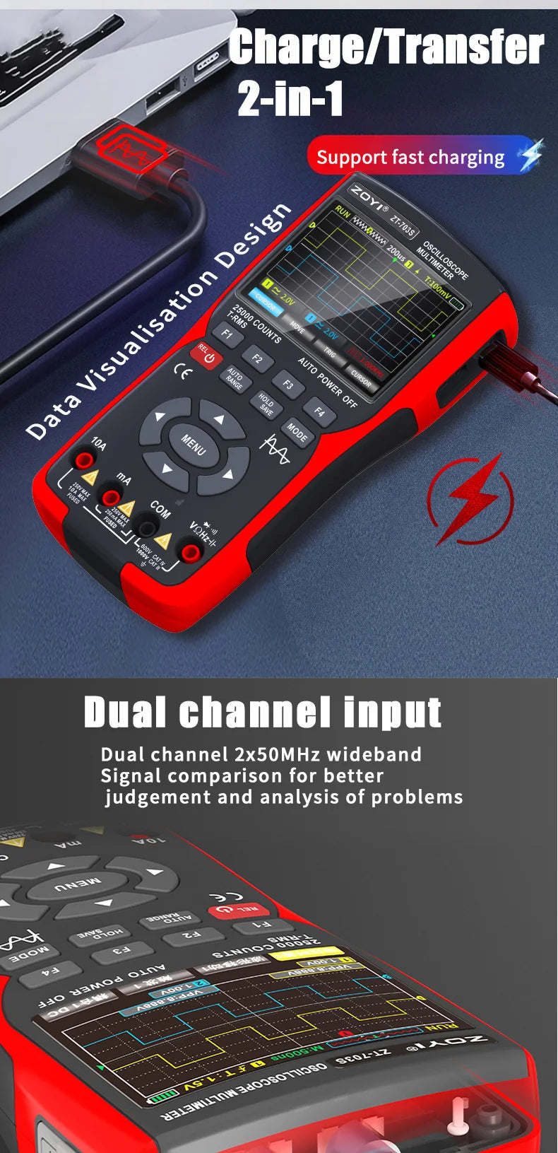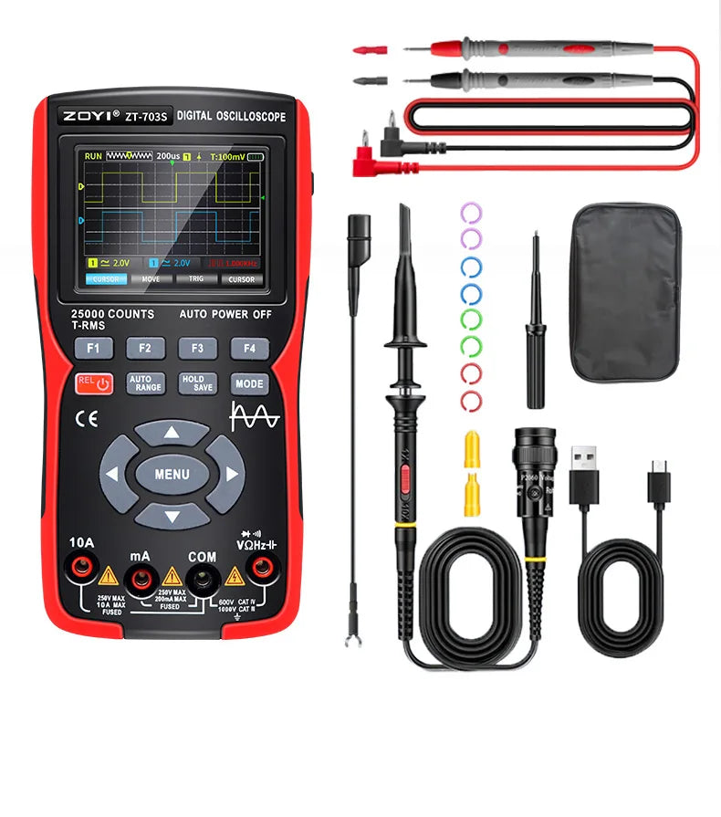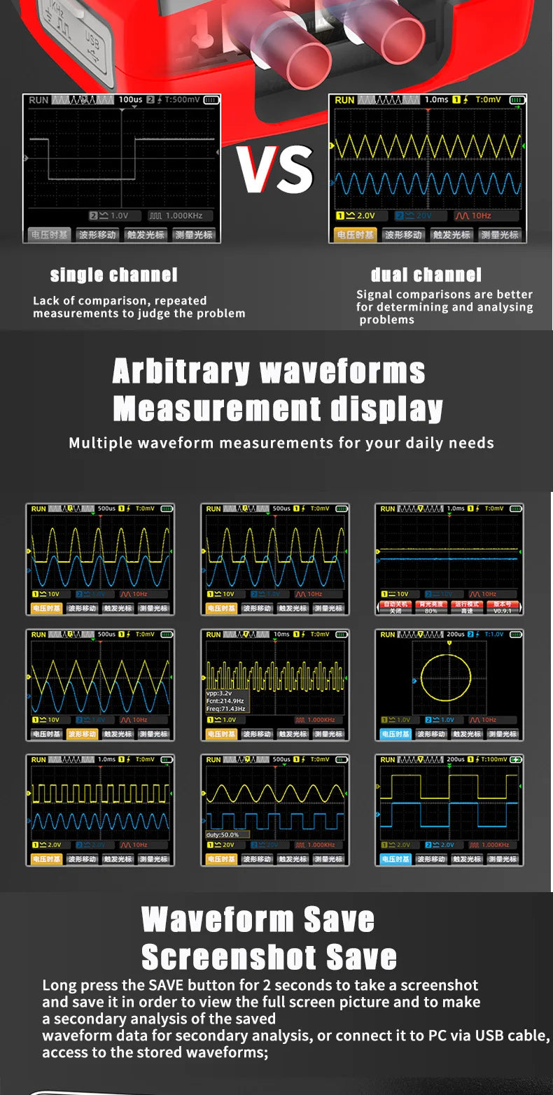 Introducing our versatile and efficient dual-channel oscilloscope, digital multimeter, and signal generator. Designed for both professionals and DIY enthusiasts, this compact device offers precise measurements and advanced features all in one. With a digital display and an intuitive auto-range operating mode, it ensures easy use in various electrical applications.