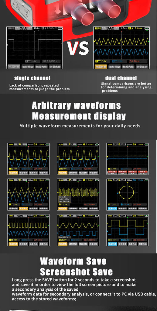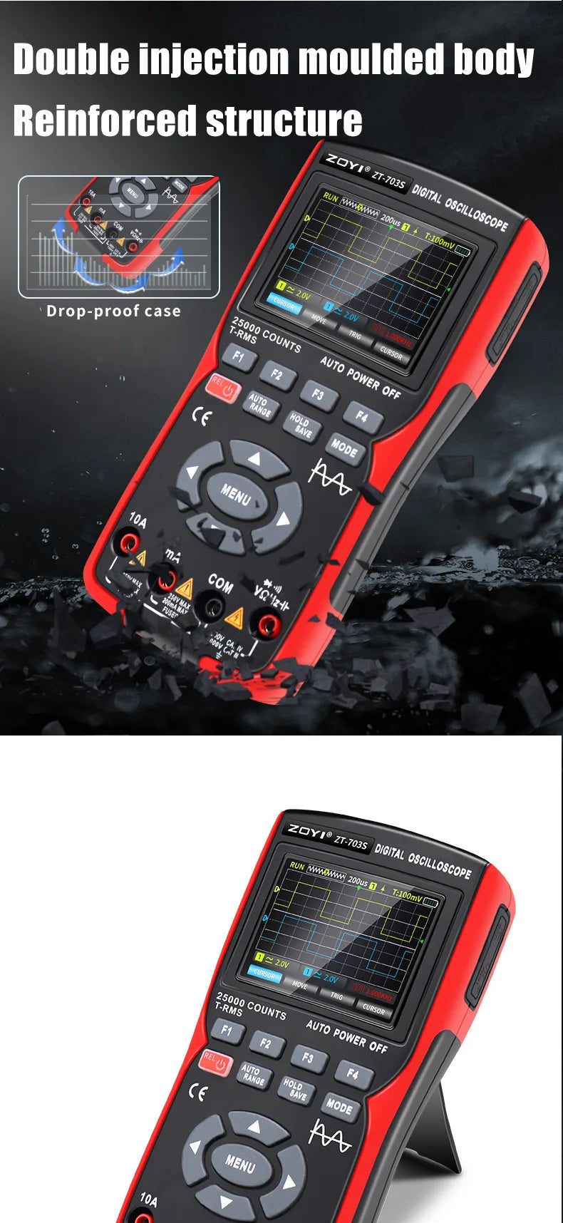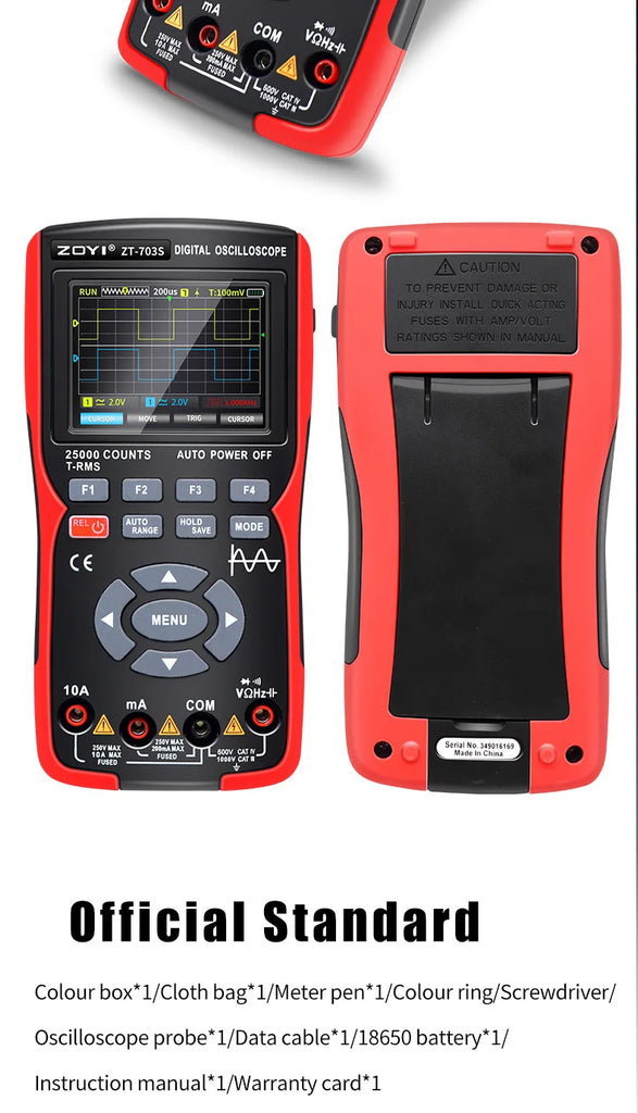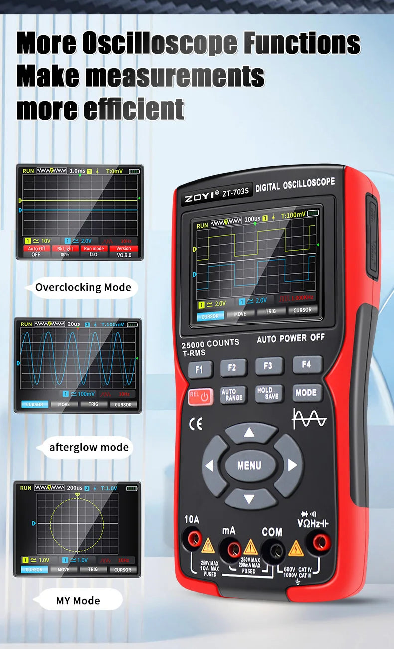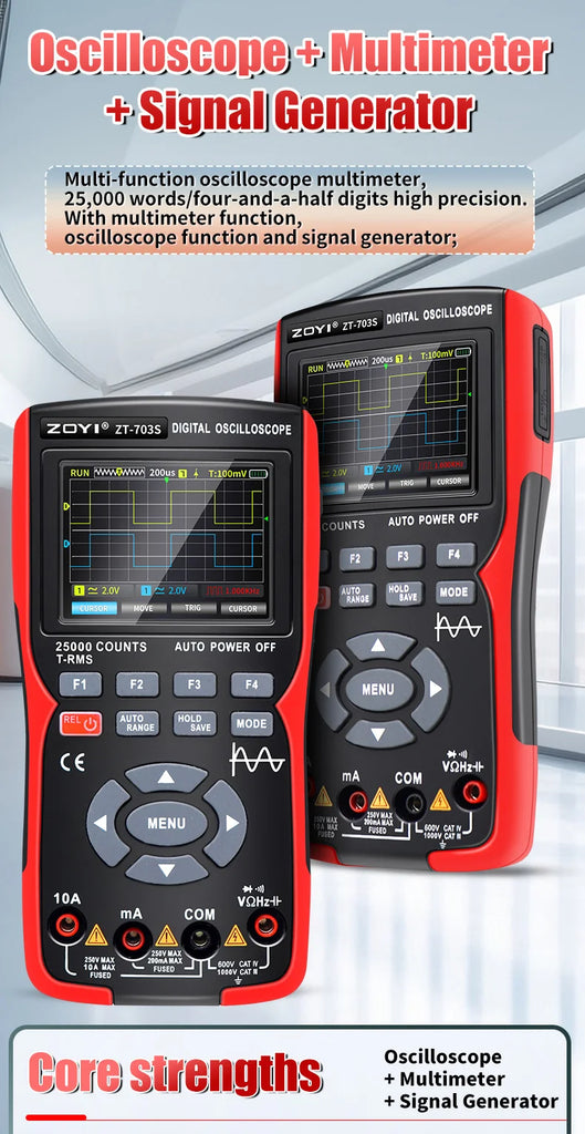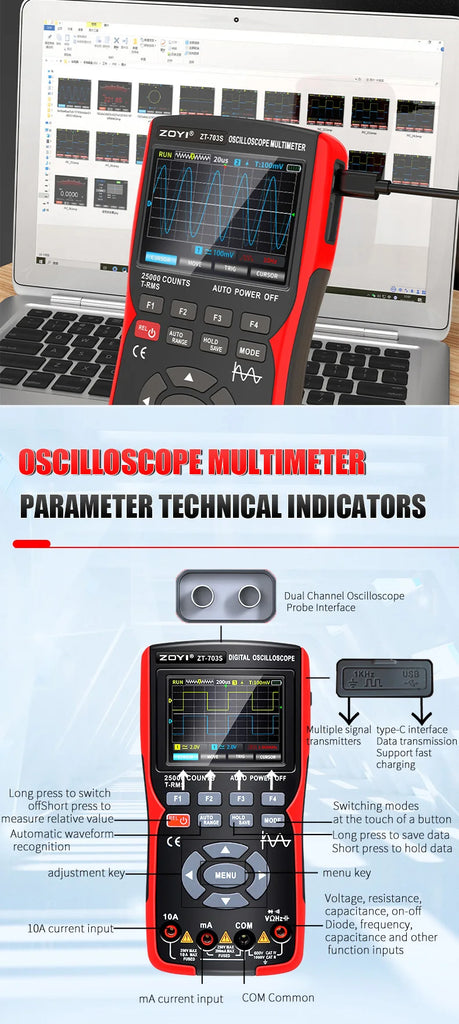 Introducing our versatile and efficient dual-channel oscilloscope, digital multimeter, and signal generator. Designed for both professionals and DIY enthusiasts, this compact device offers precise measurements and advanced features all in one. With a digital display and an intuitive auto-range operating mode, it ensures easy use in various electrical applications.