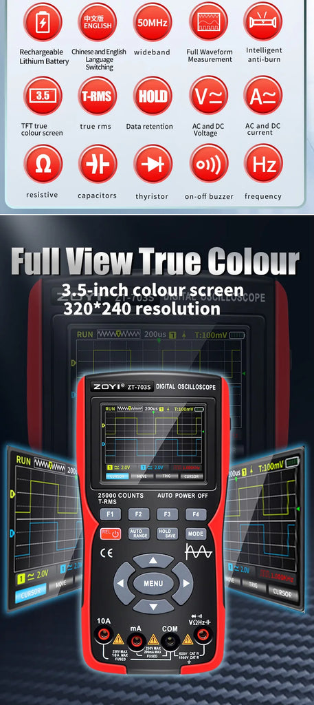 Digital Oscilloscope Multimeter Transistor Tester 50MHz Bandwidth 280ms Sampling Rate Waveform Storage