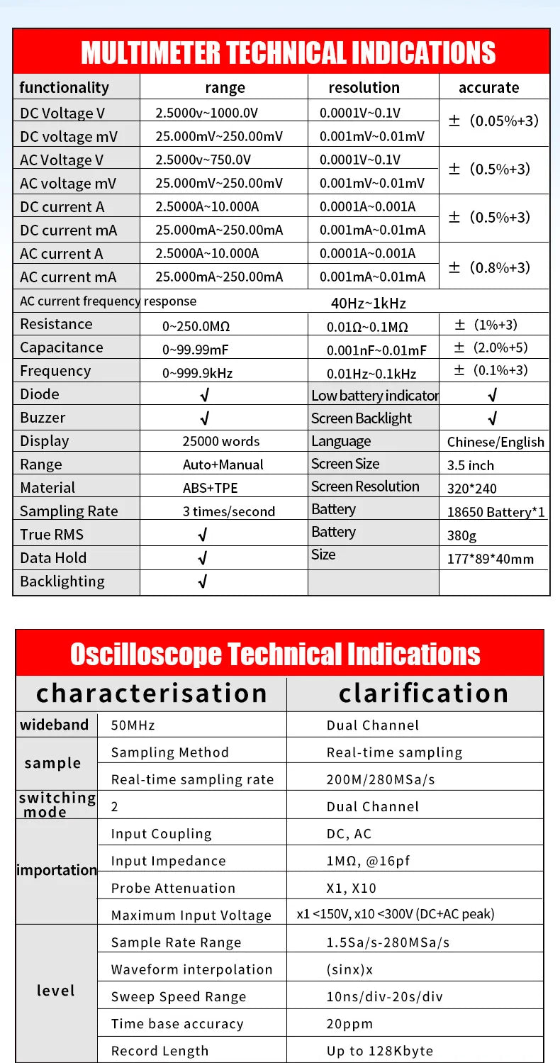 The oscilloscope function provides real-time sampling rates ranging from 1.5Sa/s to 280MSa/s, with bandwidth options of 10MHz and 50MHz, depending on the model. The digital multimeter features reliable measurement capabilities for AC and DC currents, voltages, resistance, and capacitance, allowing for comprehensive testing and diagnostics.