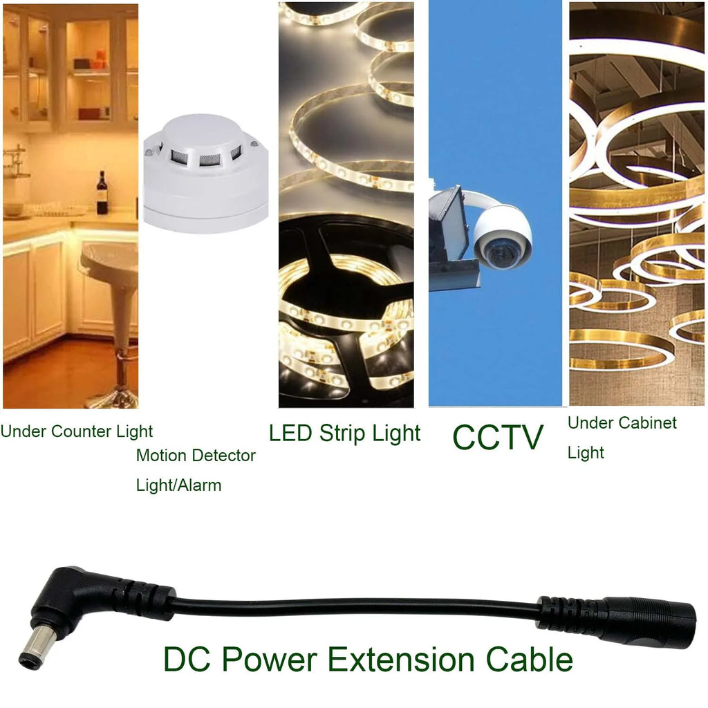 Introducing our versatile DC power extension cable, designed to meet a variety of low-voltage connectivity needs. This 5.5mm x 2.5mm male to 5.5mm x 2.1mm female short cable is perfect for applications such as IP cameras, CCTV, security systems, LED light strips, routers, and more. Constructed with a high-quality 20AWG pure copper core, it ensures efficient power transfer and durability. The cable features a right-angle male connector, minimizing cable strain and providing a neat setup. Measuring 15 centimeters (5.9 inches) in length, it offers ample reach for various setups without excess slack.