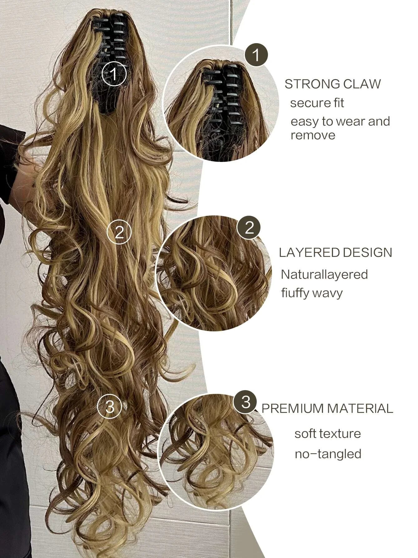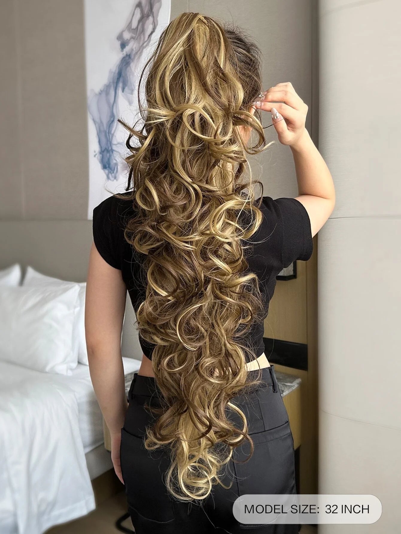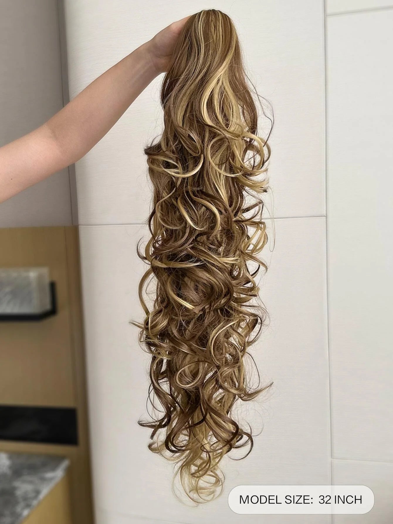 32" Long Body Wave Claw Ponytail Hair Extension, Heat Resistant Synthetic Curly Wavy Hairpiece for Women, Blonde