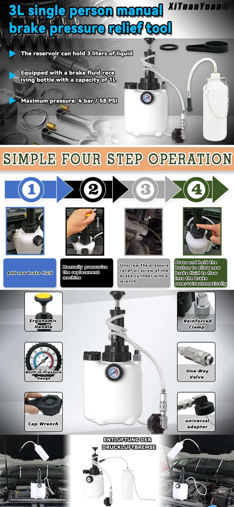- Brake Fluid Trap: Reduces spills and maintains cleanliness.
