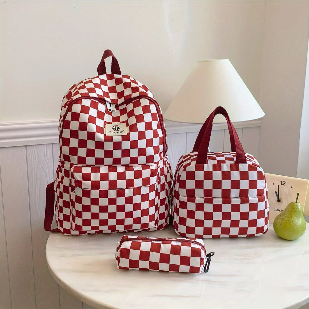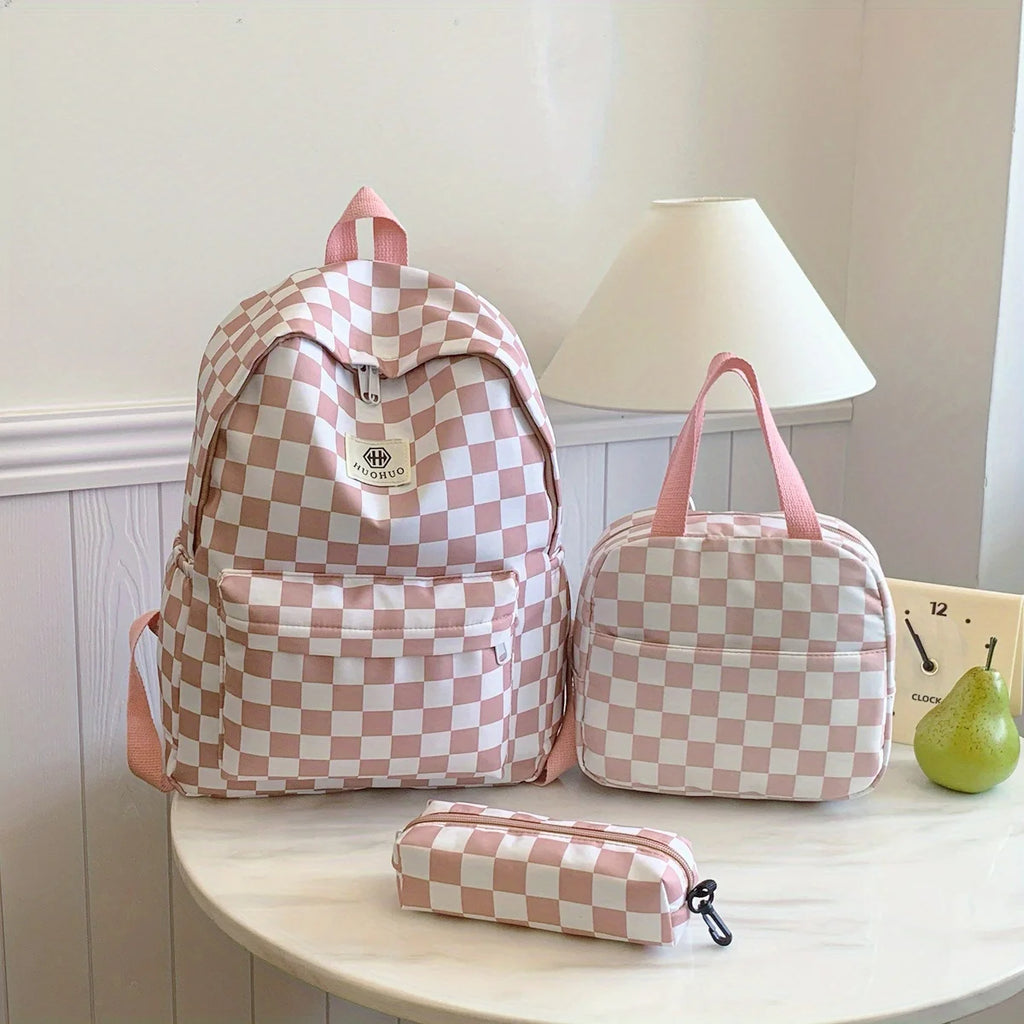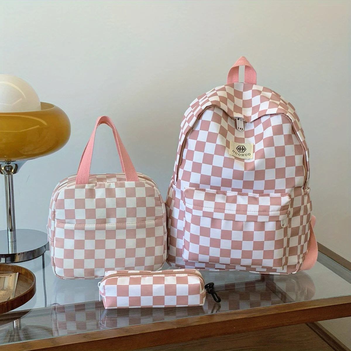 3pcs Nylon Plaid Backpack Set for Women - Large Capacity Schoolbag, Student Casual Bags for Commute