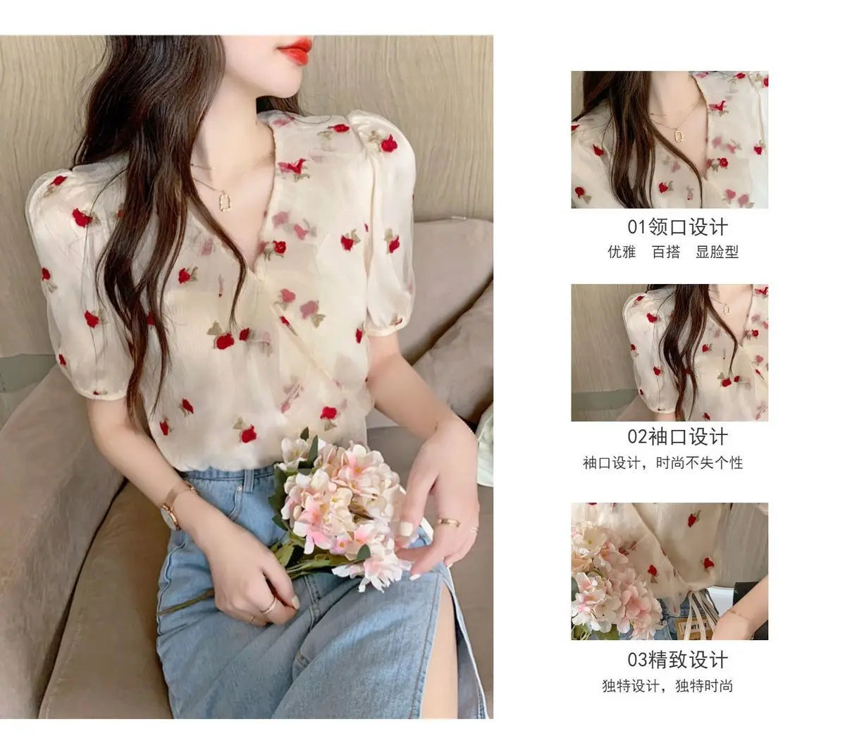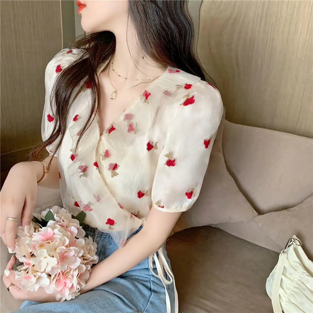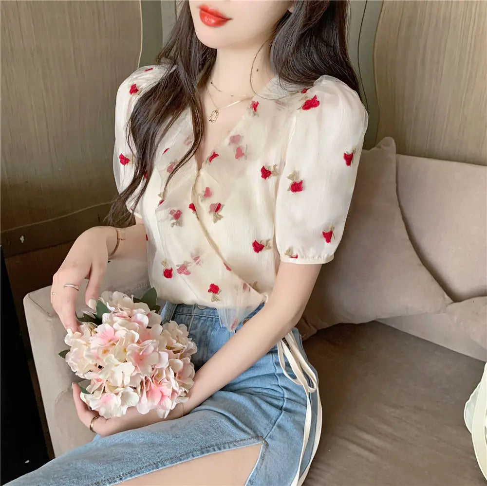 Home / Elegant Floral French Style Blouses for Women - Sweet Bandage Design, Soft & Chic Office Fashion for Young Ladies