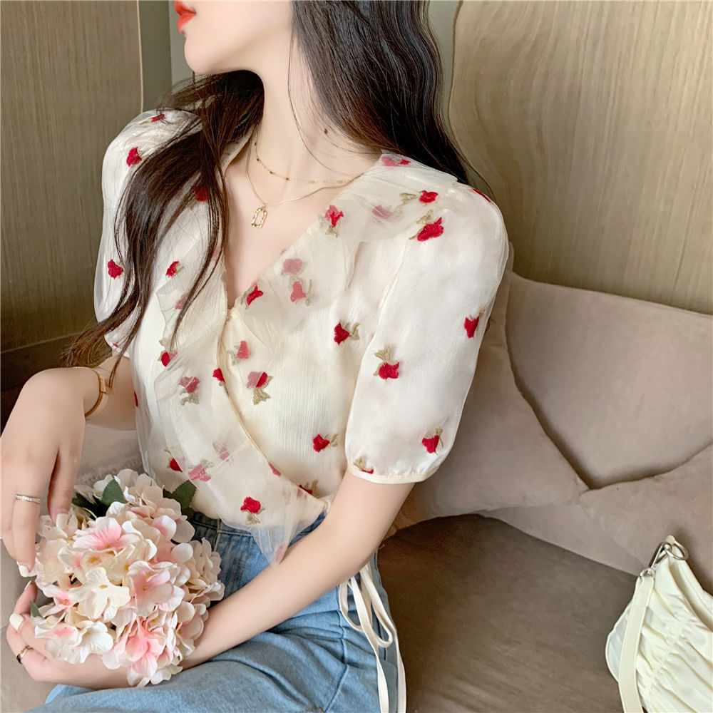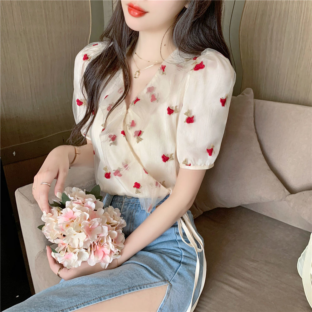 Elevate your wardrobe with this stylish V-neck floral blouse, perfect for the modern woman. Crafted from a blend of polyester and cotton, the garment offers a slight stretch for comfort while maintaining a slim fit. The chiffon fabric and casual French style create an effortlessly chic look. This short-sleeved, pullover blouse features a charming bandage decoration, making it ideal for daily wear in spring and summer. Available in various sizes, its trendy, simple, and leisure appeal ensures it can be dressed up or down for any occasion.