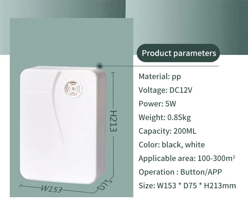 Introducing our sleek and efficient 200ML Scent Diffuser, designed to elevate your space with soothing aromas. Perfectly balancing style and functionality, this diffuser comes in a modern black or white finish and features a durable PP material build. Its compact dimensions (W153*D75*H213mm) make it a perfect fit for any room, while the convenient button and app operation allow for easy control.