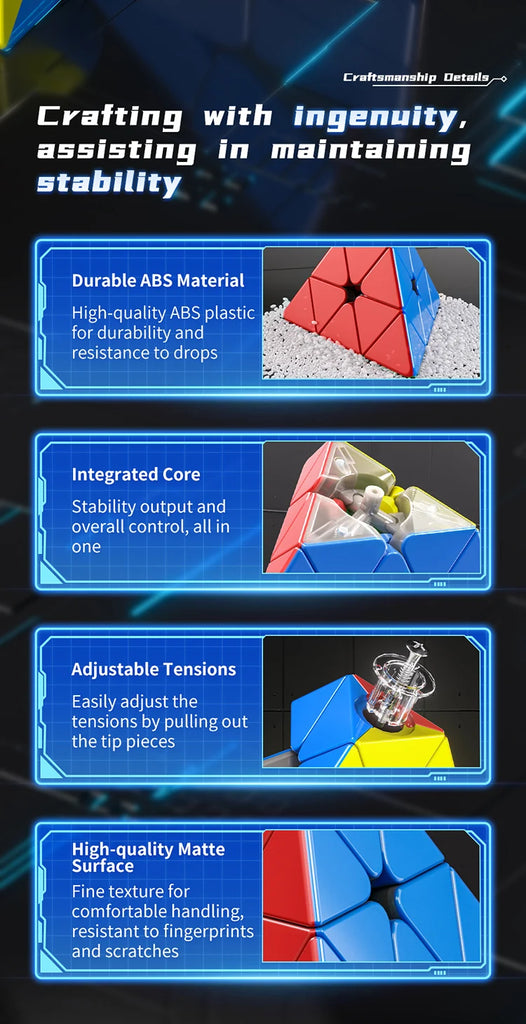 Discover the perfect fusion of innovation and challenge with our cutting-edge puzzle cube, thoughtfully designed for solvers of all skill levels. Its durable, sticker-free finish ensures a premium solving experience that lasts. The integrated magnetic system enhances performance, providing smoother and more stable solving to boost your accuracy. Available in three versions—3x3x3, 2x2x2, and Pyraminx—each cube is crafted from non-toxic materials, making it safe for ages 6 and up. Its compact packaging makes it an ideal gift for both budding and experienced puzzlers alike.