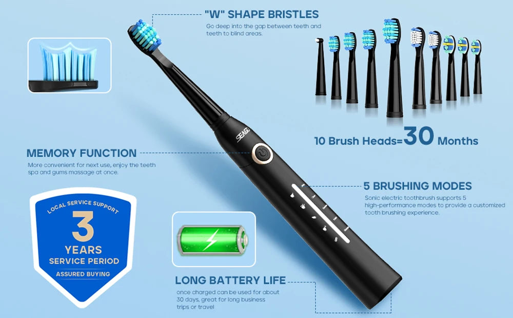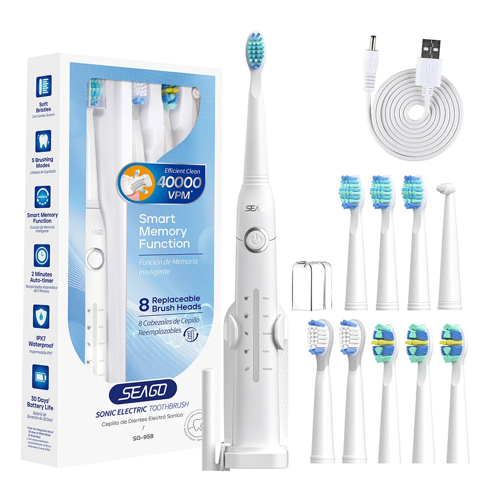 Introducing our advanced electric toothbrush, designed for optimal oral hygiene for adults. This sleek, rechargeable toothbrush features 5 distinct acoustic wave cleaning modes, ranging from deep cleaning to a gentle massage for gum care. With a powerful motor that delivers 30,000 to 50,000 movements per minute, it's engineered to provide a thorough clean every time.