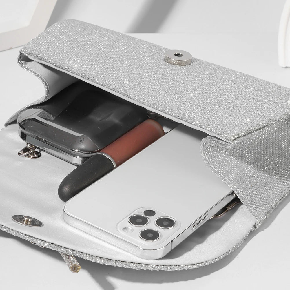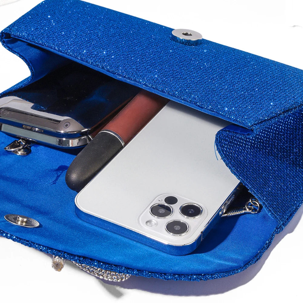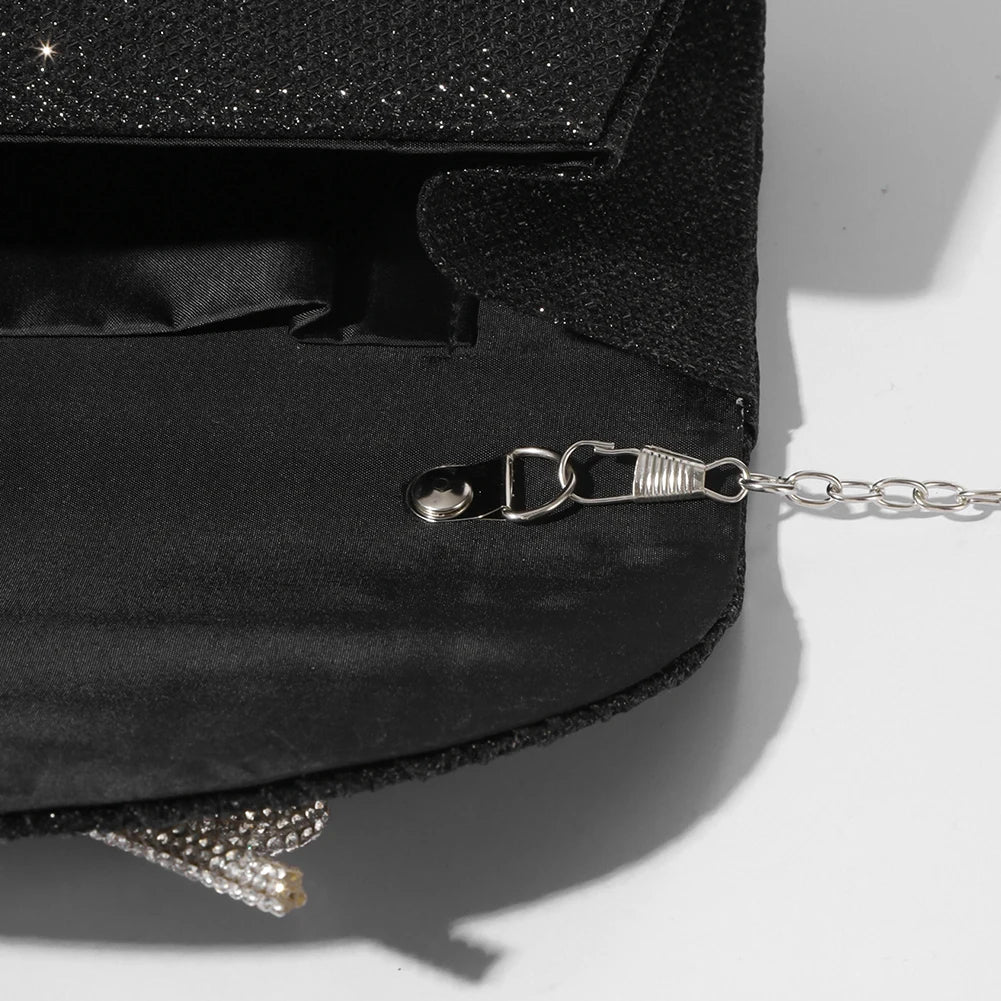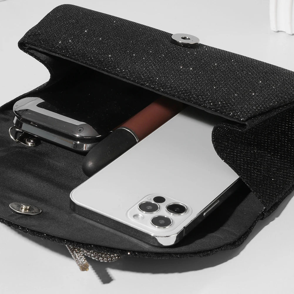 The thoughtful design ensures easy access to your belongings while maintaining a chic appearance. Adorned with rhinestones, this versatile clutch can be worn as a shoulder or evening bag, effortlessly complementing various styles.