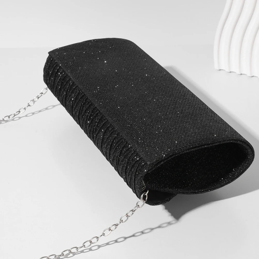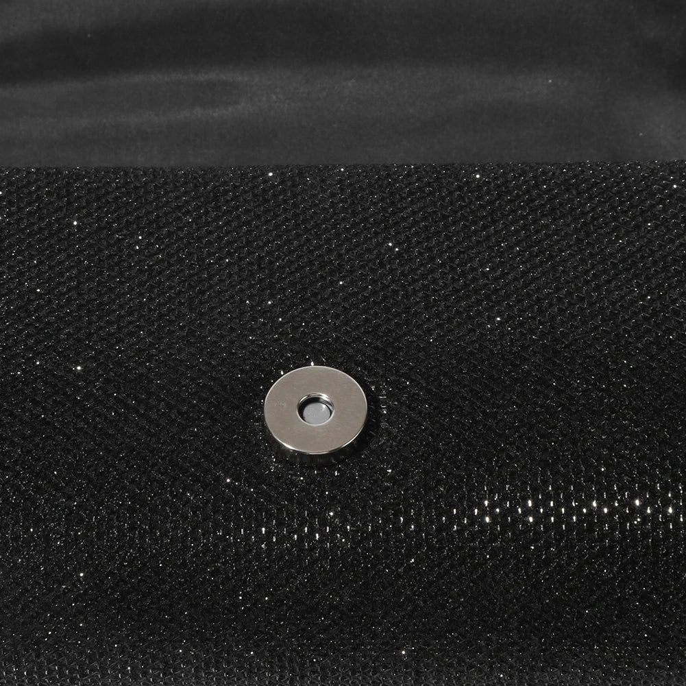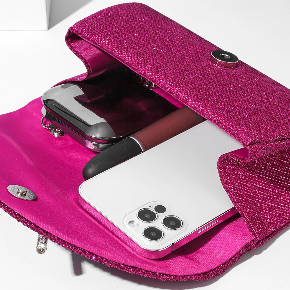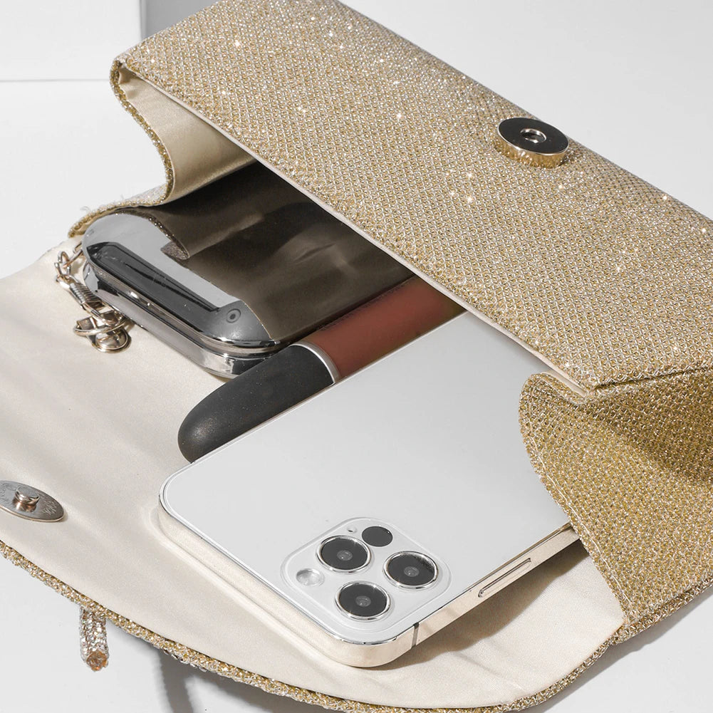 The thoughtful design ensures easy access to your belongings while maintaining a chic appearance. Adorned with rhinestones, this versatile clutch can be worn as a shoulder or evening bag, effortlessly complementing various styles.