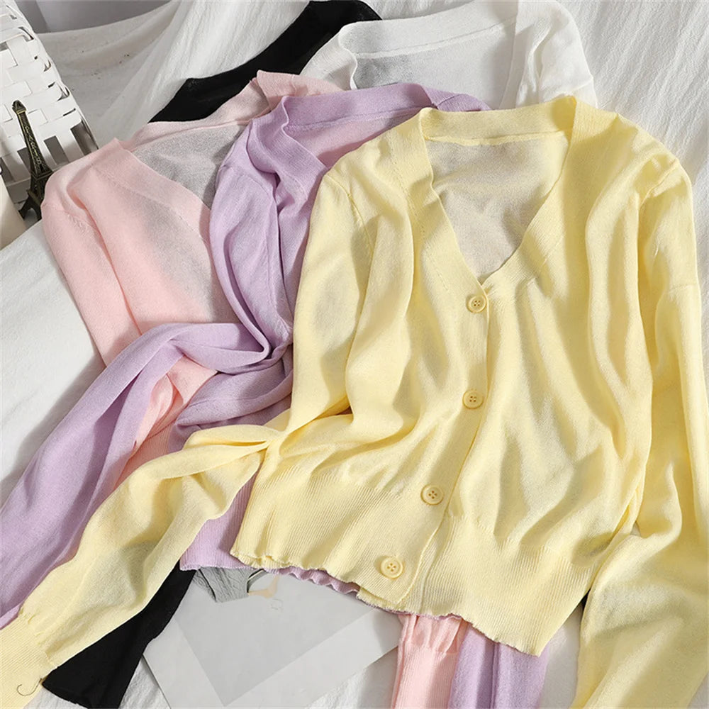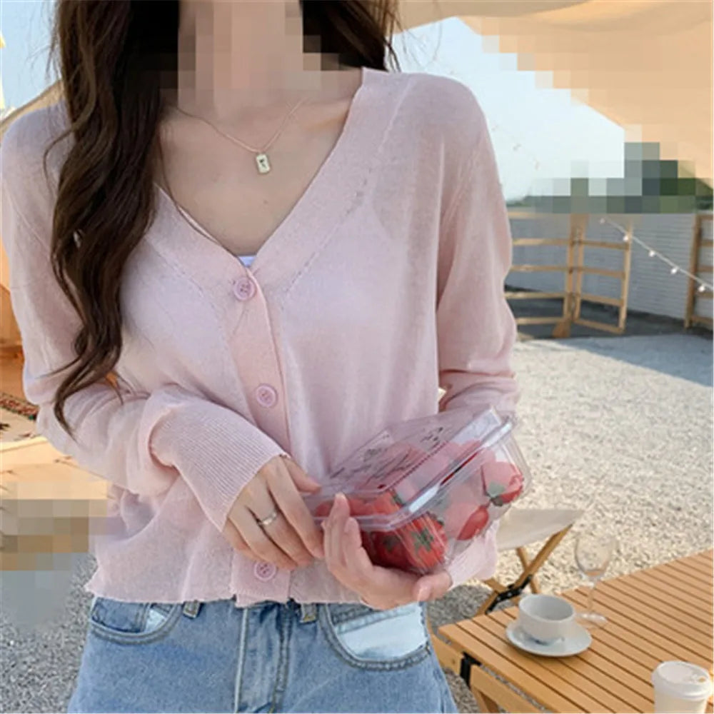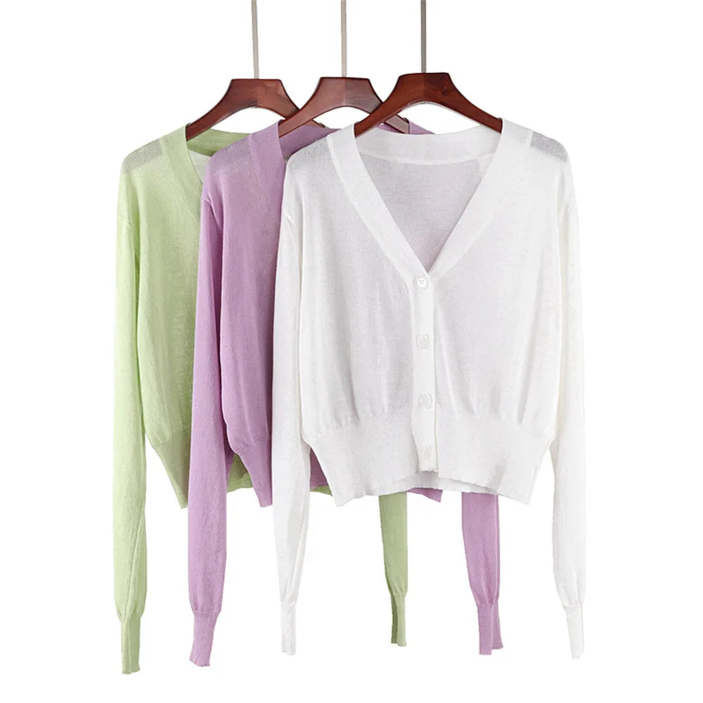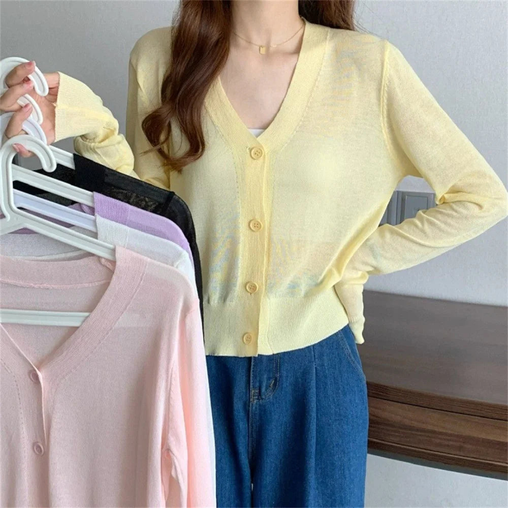2024 Summer V Neck Women's Sheer Cardigan Sweater Casual Light Crop Top for Ladies