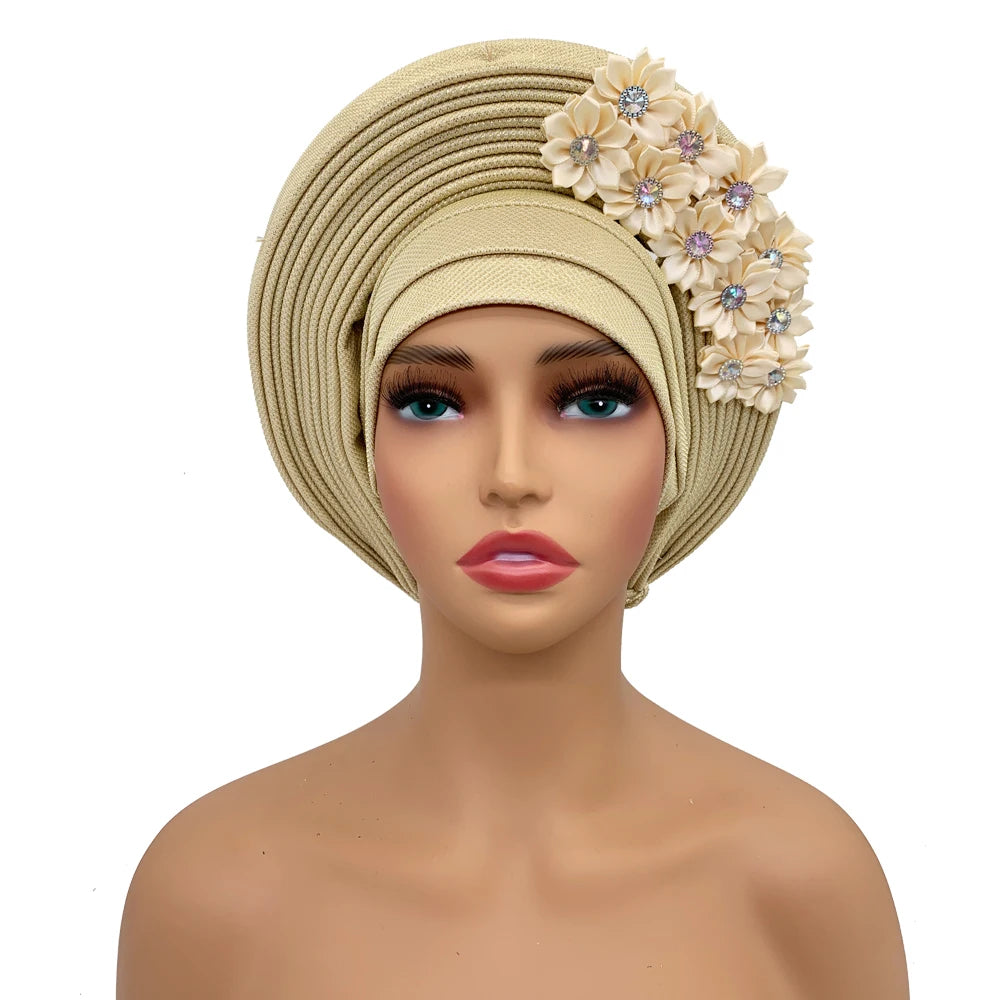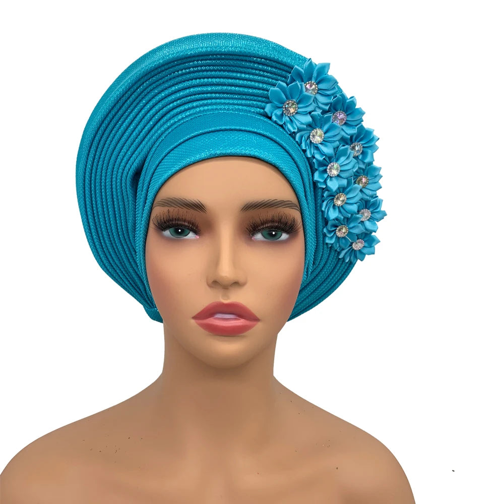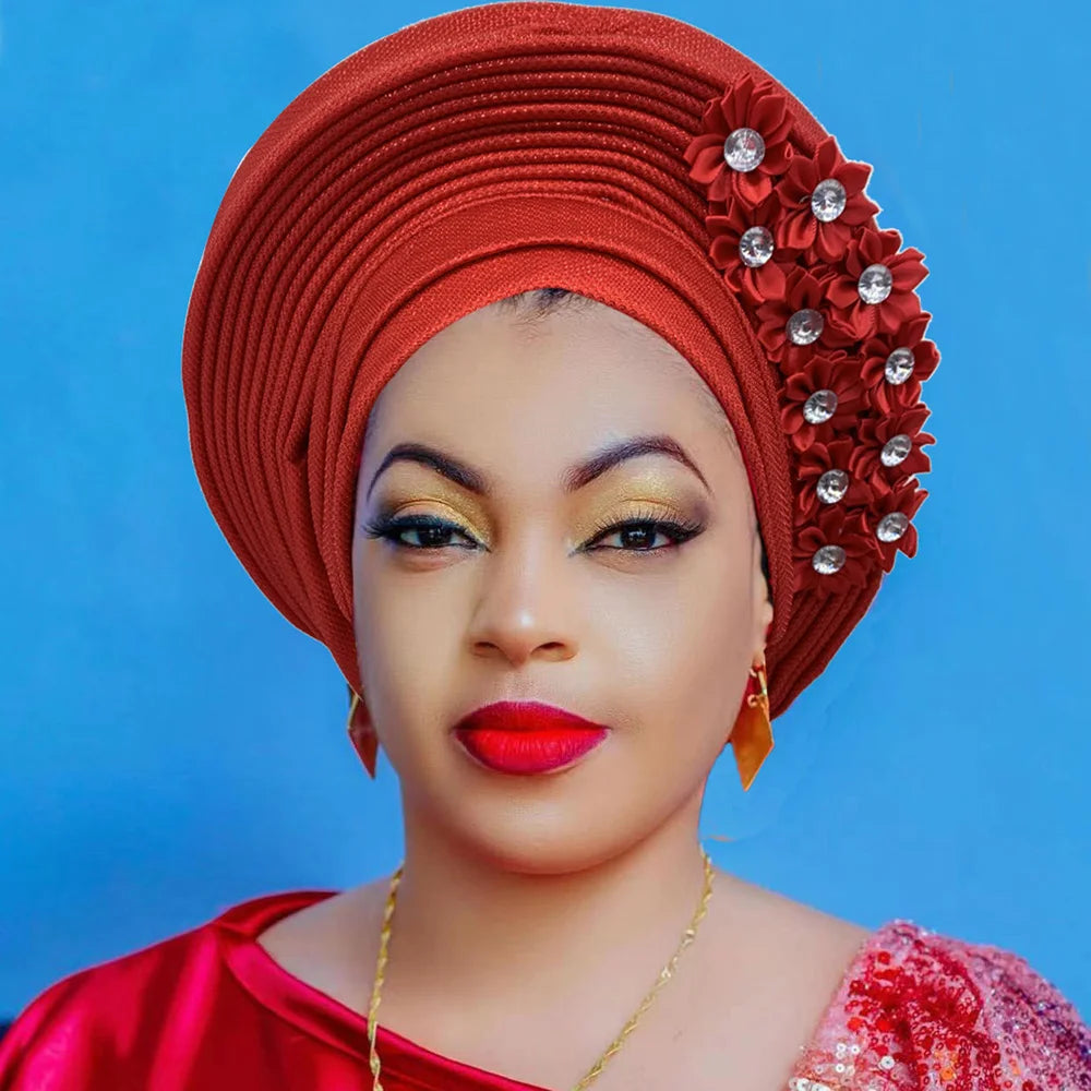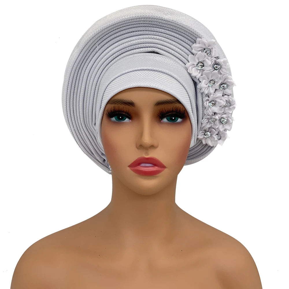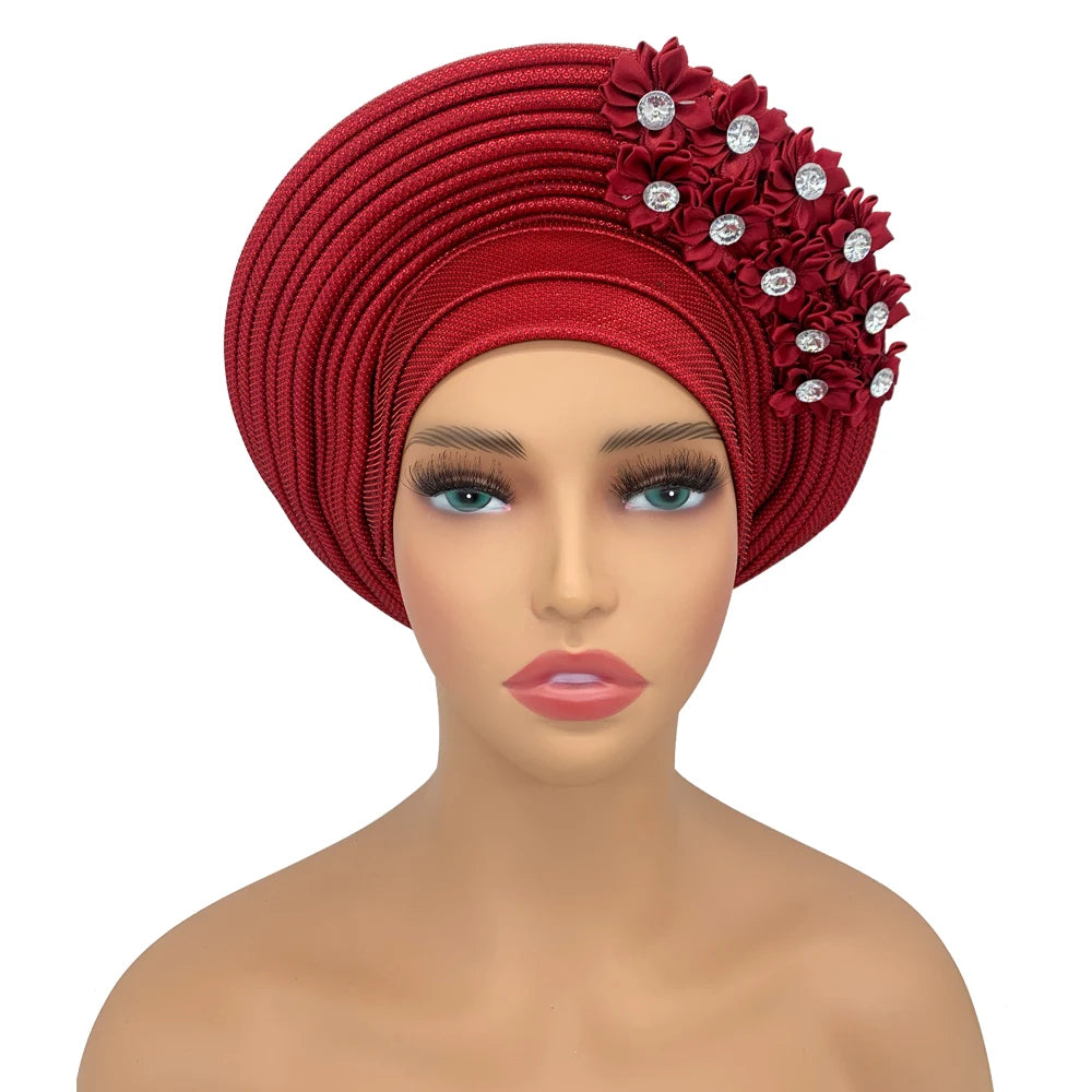 2024 African Auto Gele Headtie Turban with Flowers for Women Wedding Party