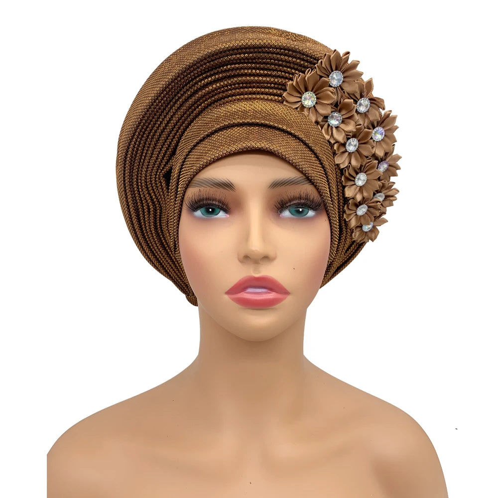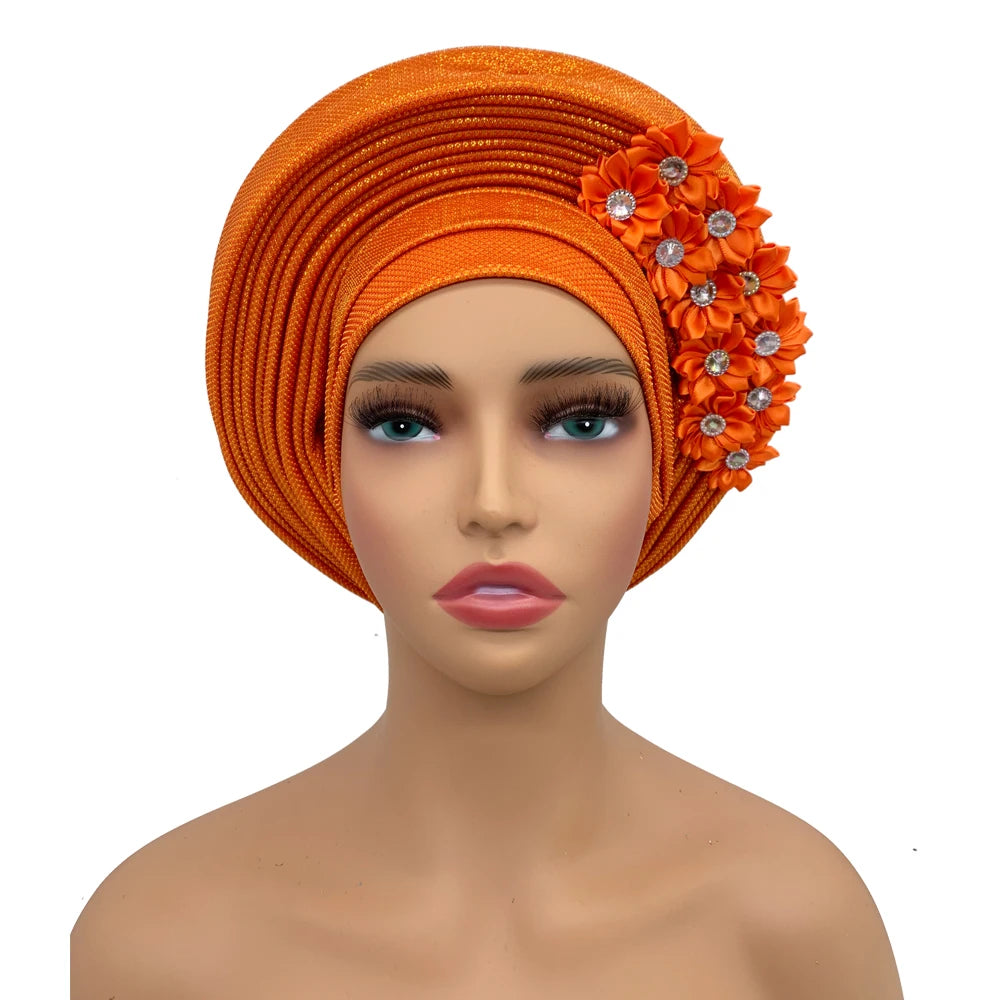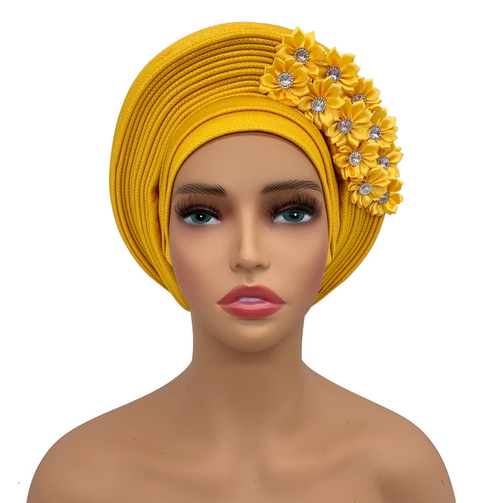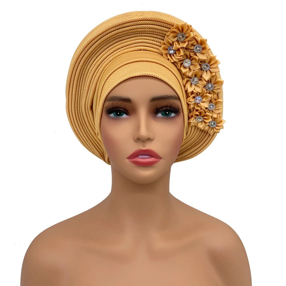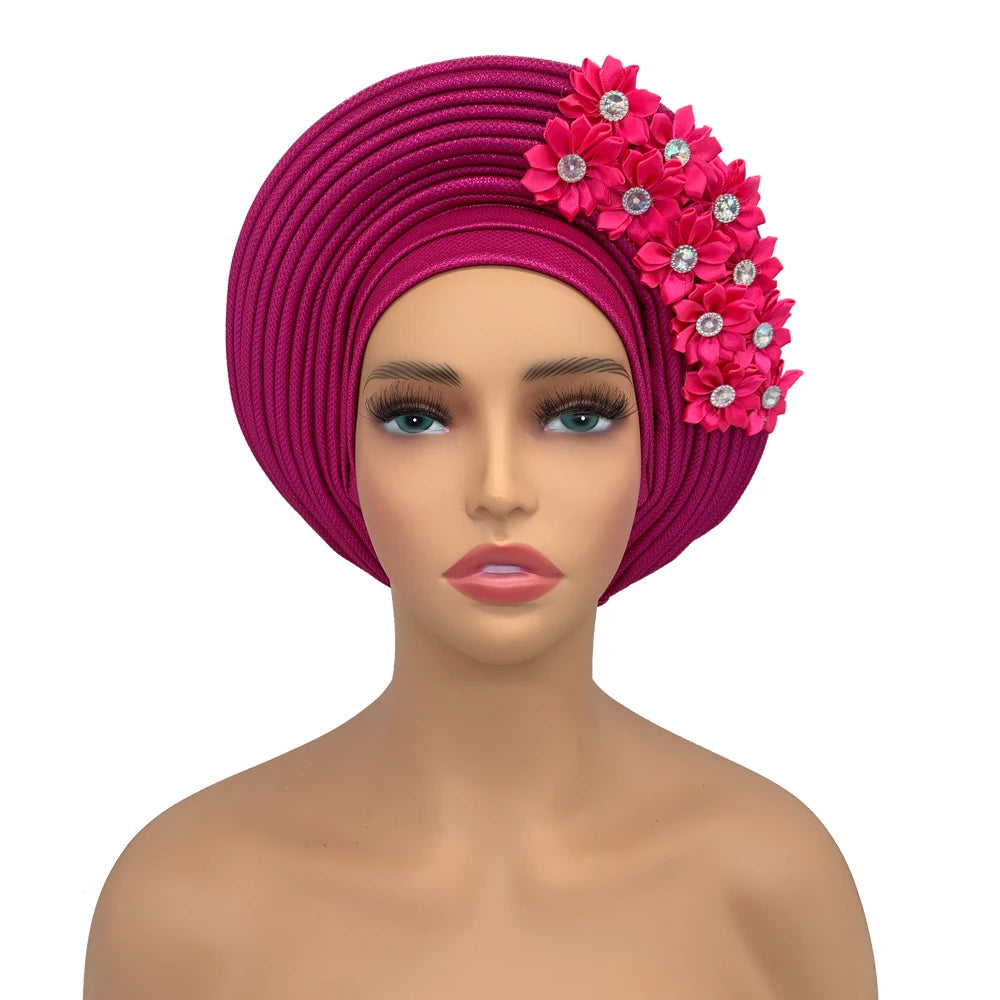2024 African Auto Gele Headtie Turban with Flowers for Women Wedding Party