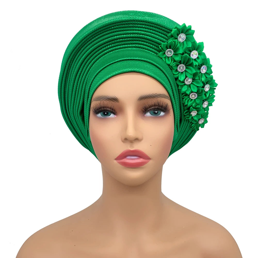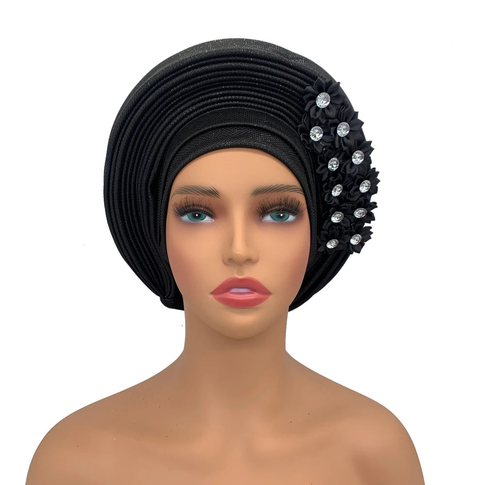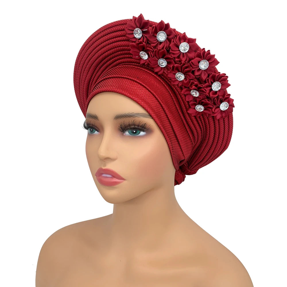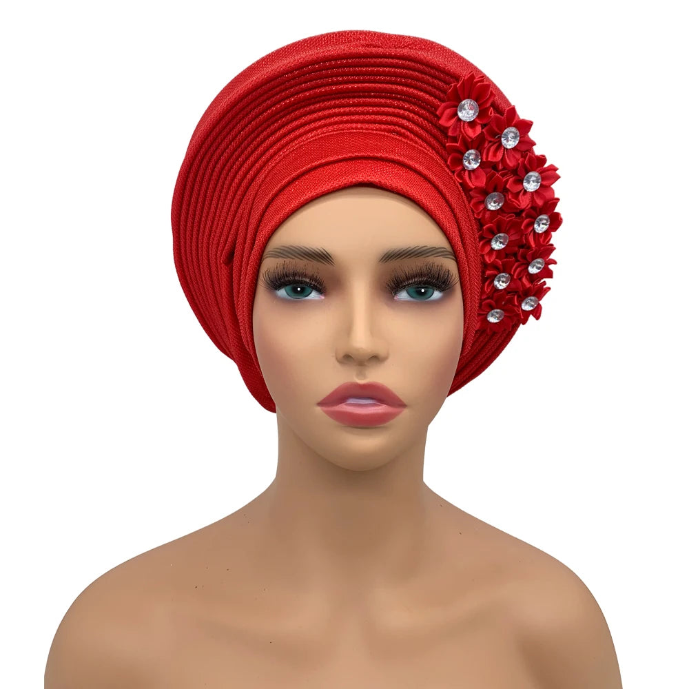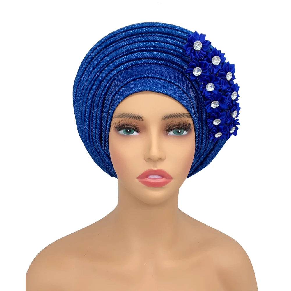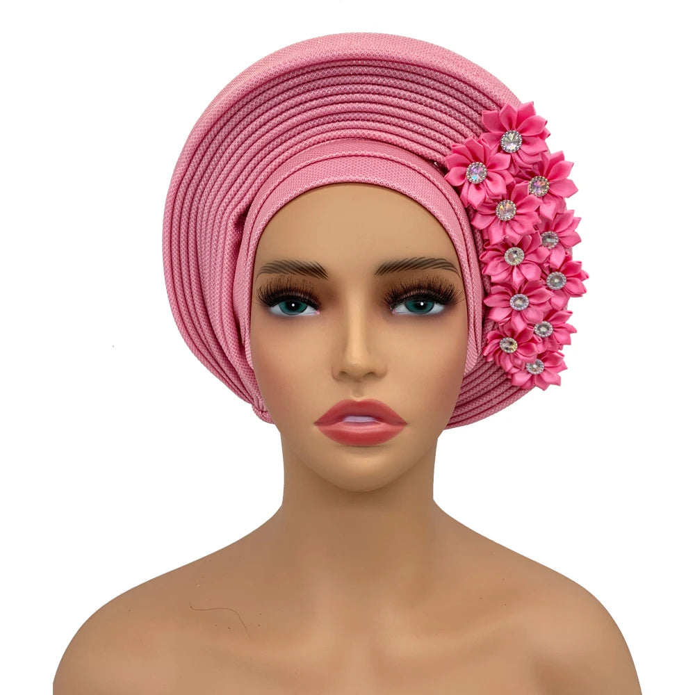 2024 African Auto Gele Headtie Turban with Flowers for Women Wedding Party