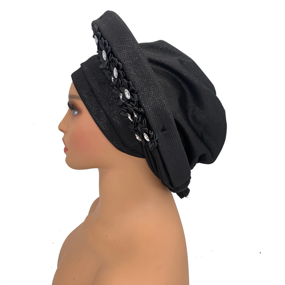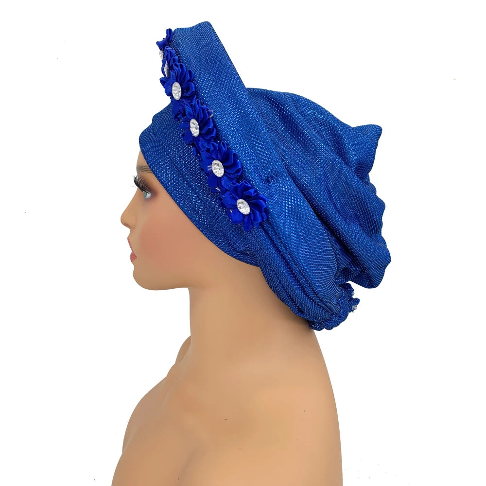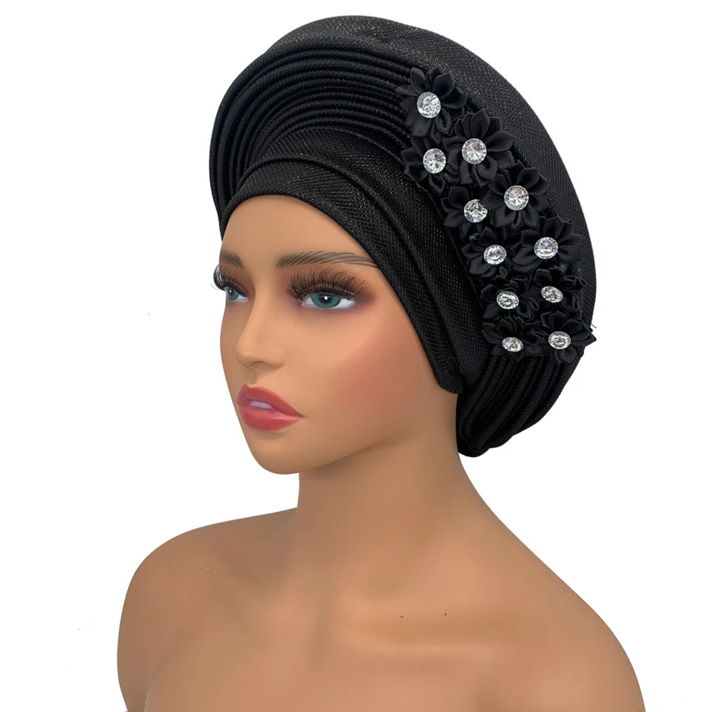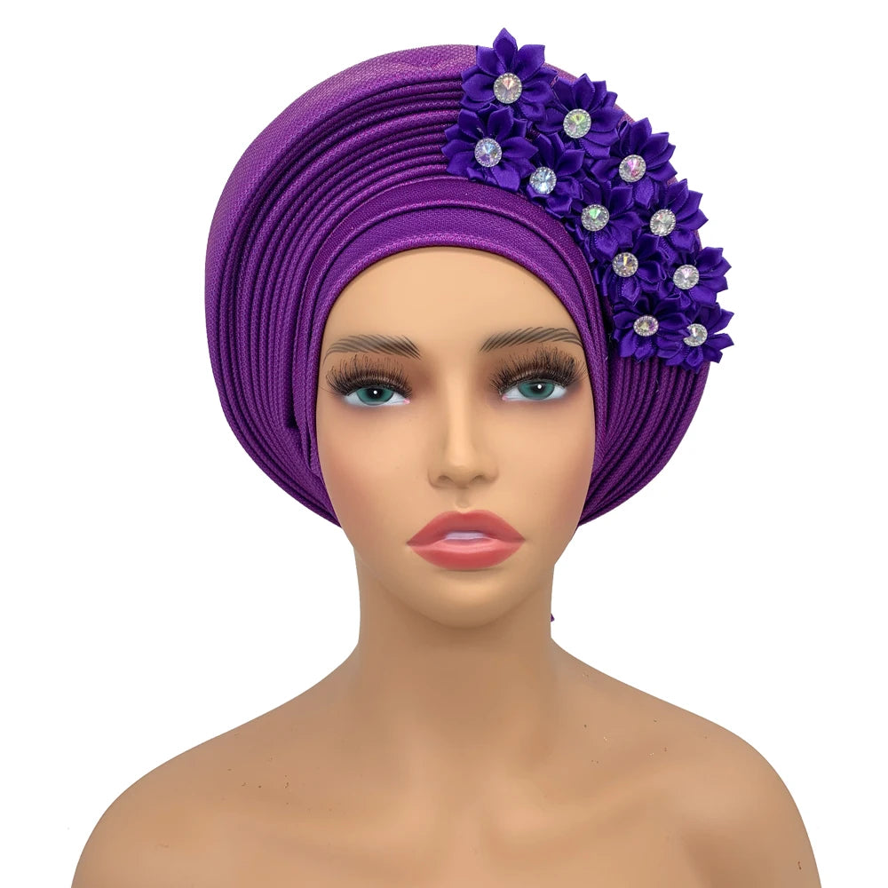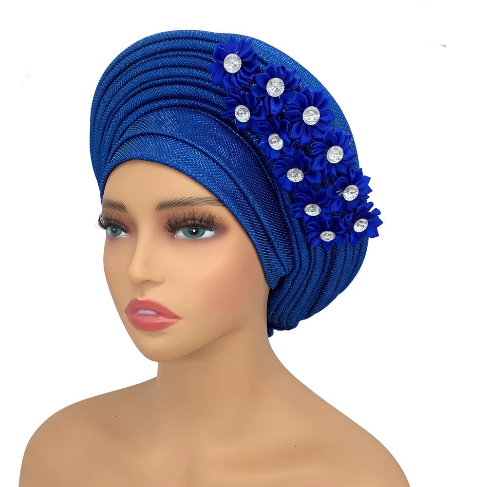 2024 African Auto Gele Headtie Turban with Flowers for Women Wedding Party