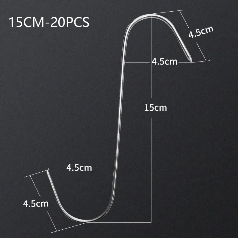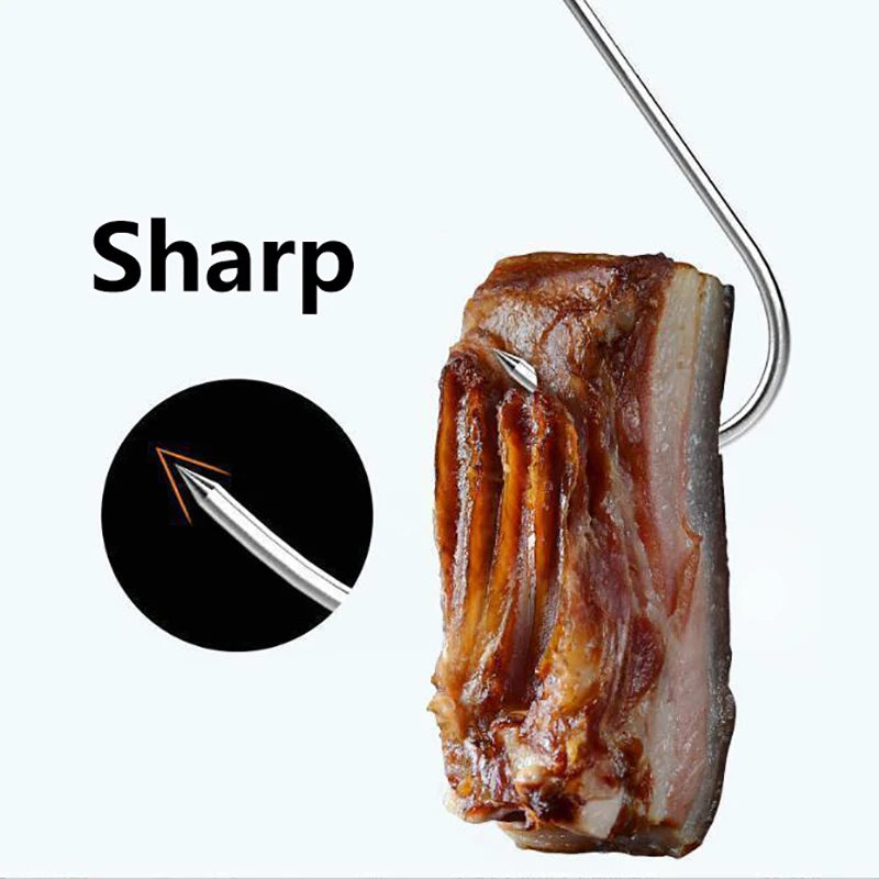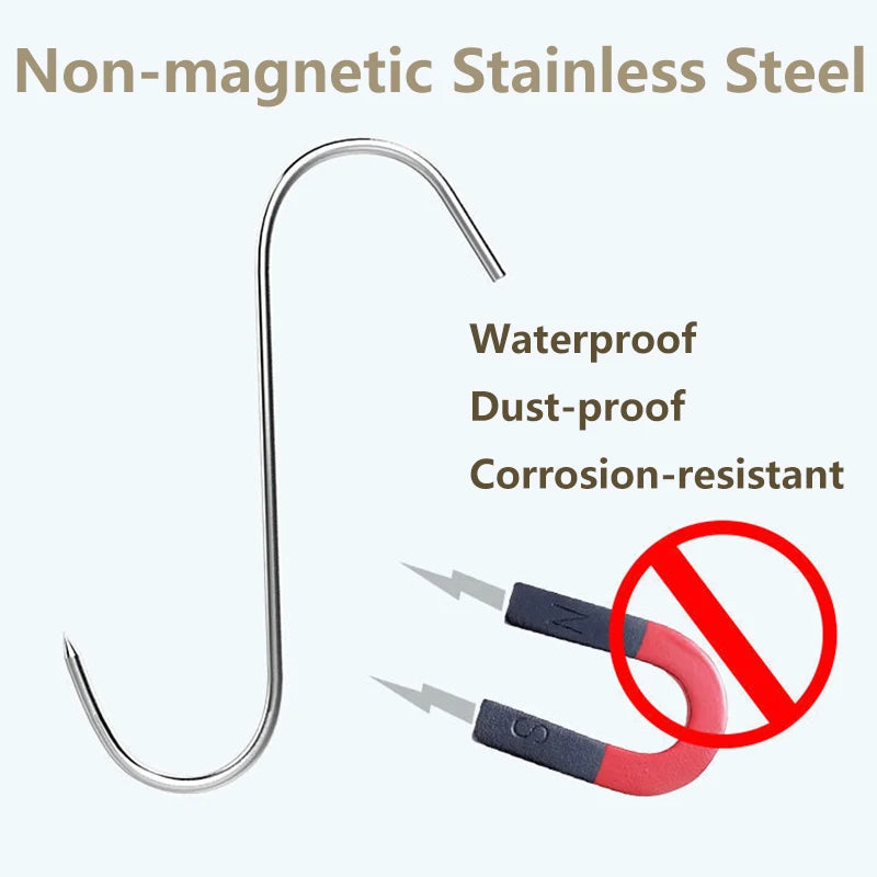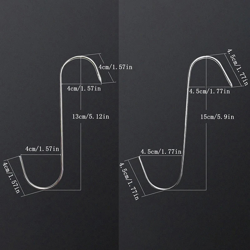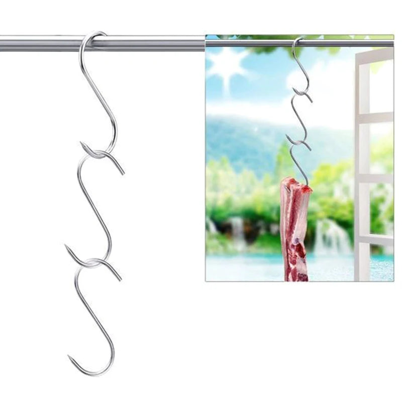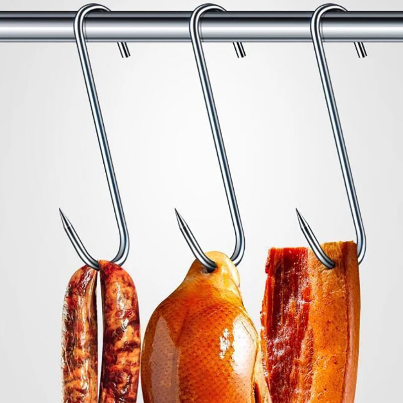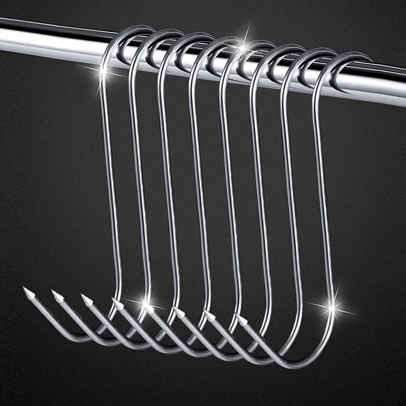 Enhance your kitchen organization with these robust Stainless Steel S-Shaped Hooks, expertly crafted to hang meats, poultry, and a variety of kitchen tools. Made from high-quality 304 stainless steel, they boast exceptional rust resistance for enduring performance. These hooks feature sharp tips for a secure grip and a smooth surface for easy cleaning. Combining functionality with a sleek, modern design, they are an essential addition to any organized kitchen.