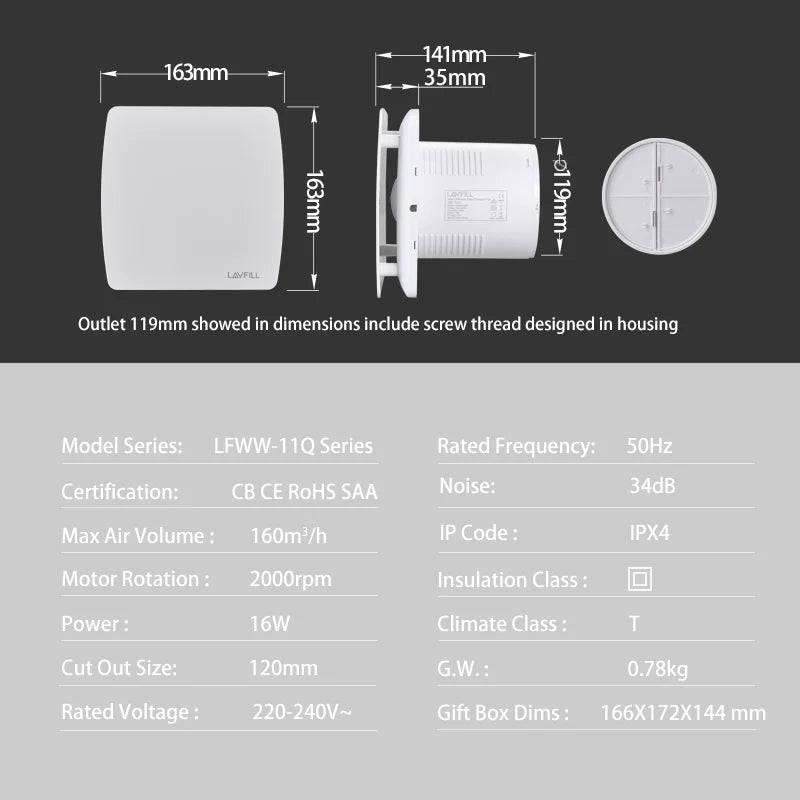 Introducing the new 120mm Bathroom Fan, designed to enhance your ventilation needs with efficiency and style. This fan is available in two models: LFWW-11Q with an ABS White cover, and LFWW-11Q-4B featuring a Matte Aluminum Black cover. Both models provide excellent air circulation with a maximum air volume of 160m³/h, while operating quietly at 34dB to ensure a peaceful environment.