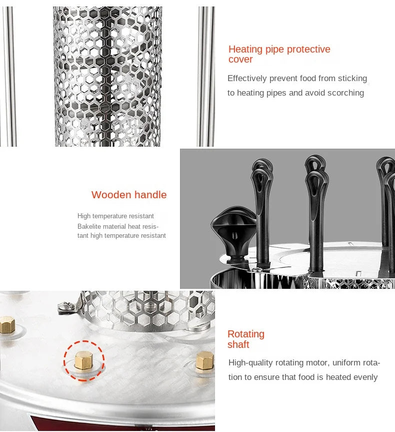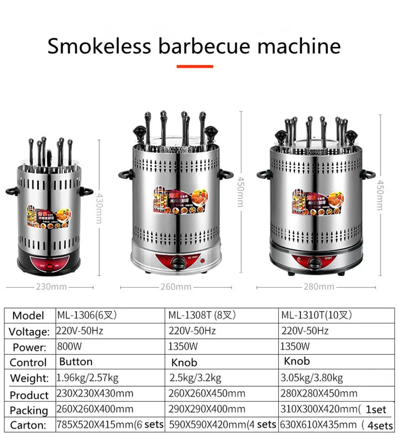 - 6 Forks Model: With a power output of 800W and a compact size of 23x23x43cm, it's perfect for smaller gatherings. Weighs 2kg.