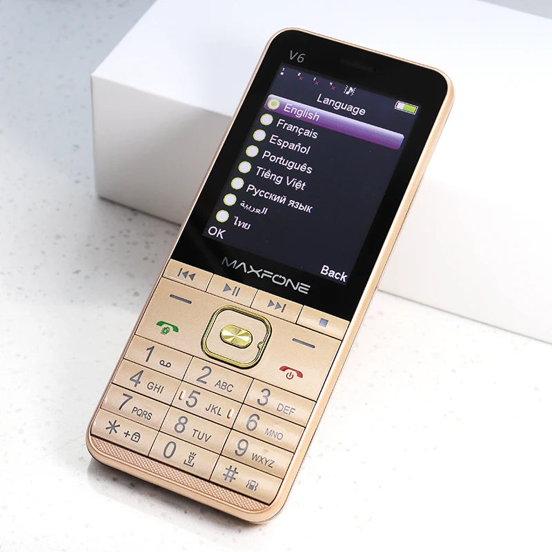 The phone supports multiple languages including English, Russian, French, Spanish, Portuguese, and Arabic, catering to a wide range of users. The TFT screen, although not touch-enabled, offers clear visuals for basic operations.