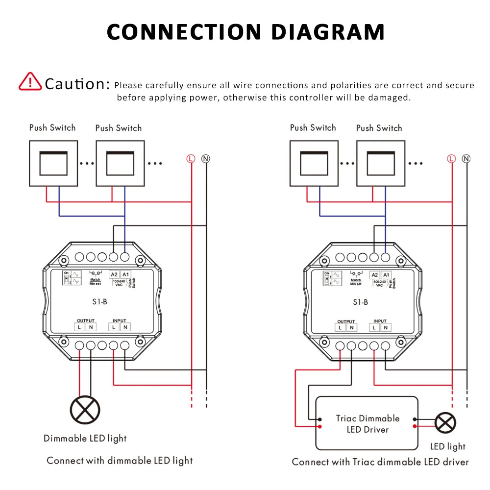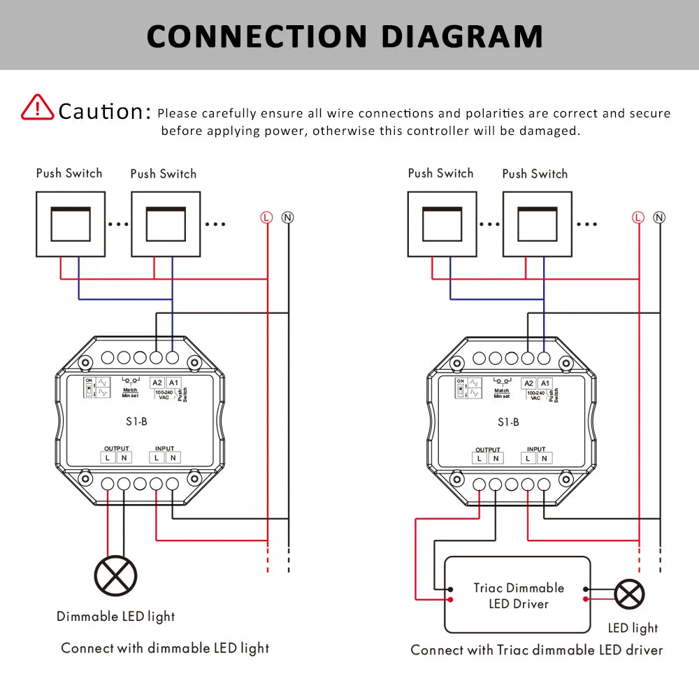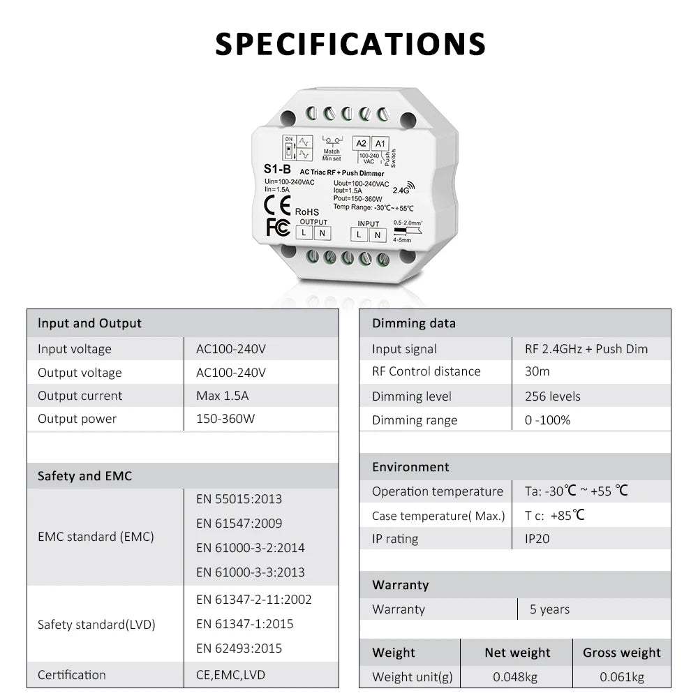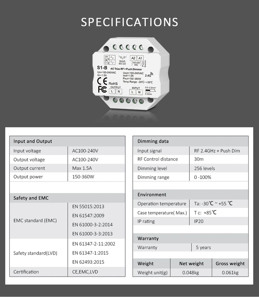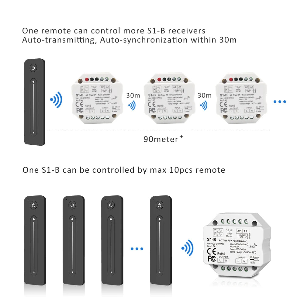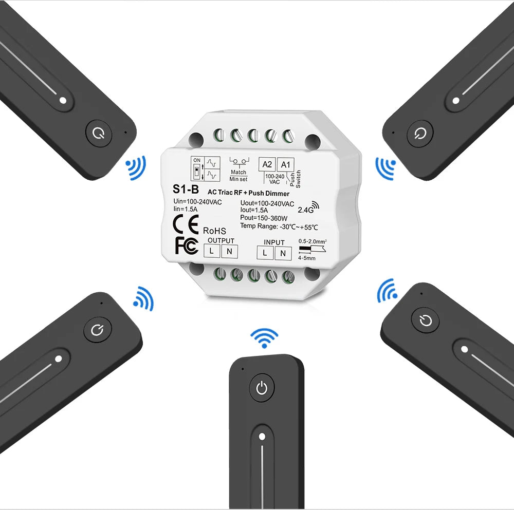 Enhanced with RF 2.4G compatibility, this dimmer can be used with either single-zone or multi-zone remote controls. Easily connect it to an external push switch for on/off functionality and execute dimming adjustments smoothly. Safety is assured with built-in overheat and overload protection, which automatically resets.