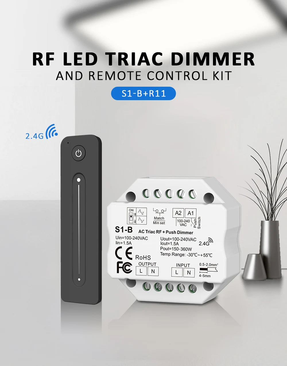 2.4G RF Wireless LED Dimmer Switch, 220V Triac Adjustable with Remote, Push Control for LED Lamps and Bulbs