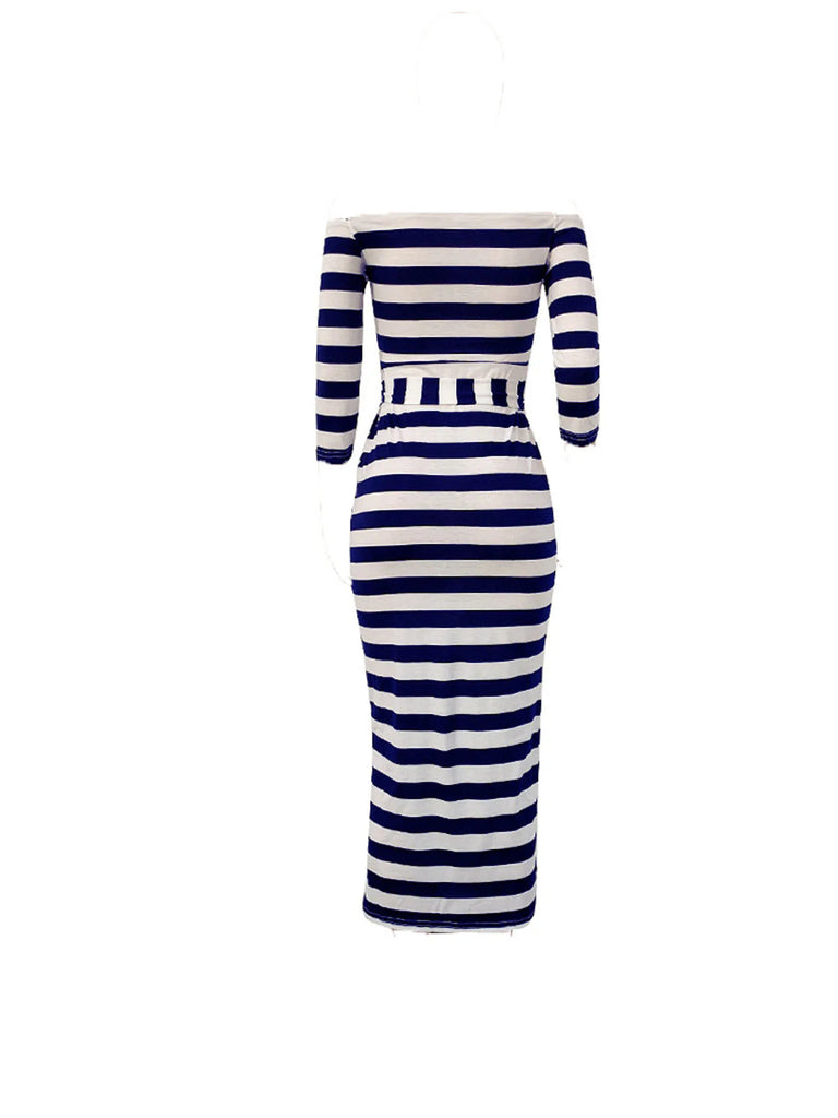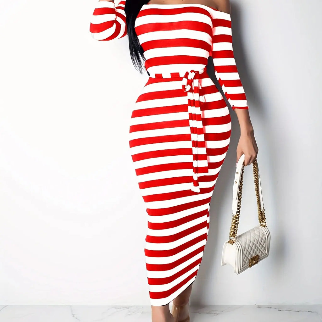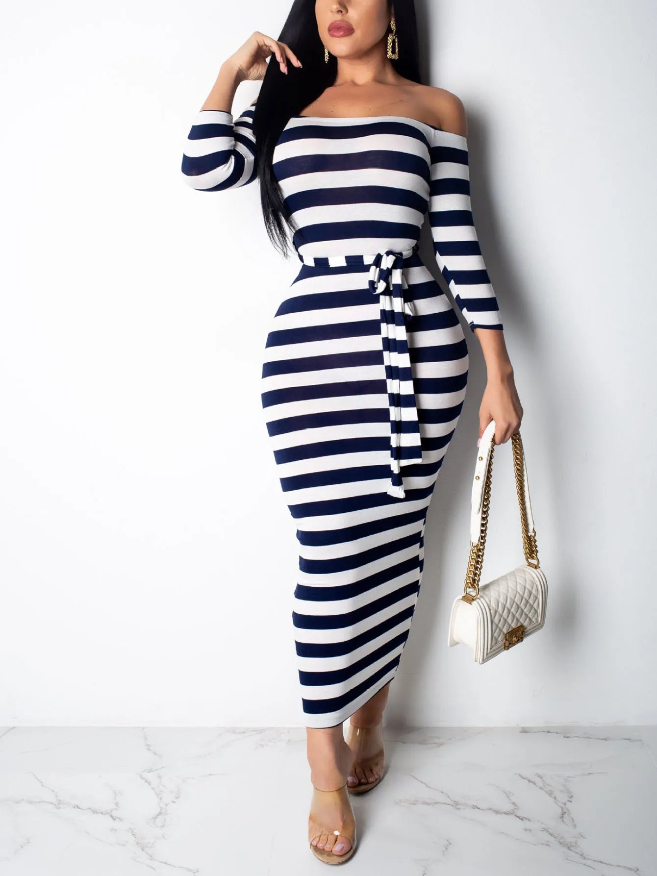 2024 Striped Summer Bodycon Midi Dress for Women, Slash Neck, Lace Up, 3/4 Sleeve, Casual Pencil Style