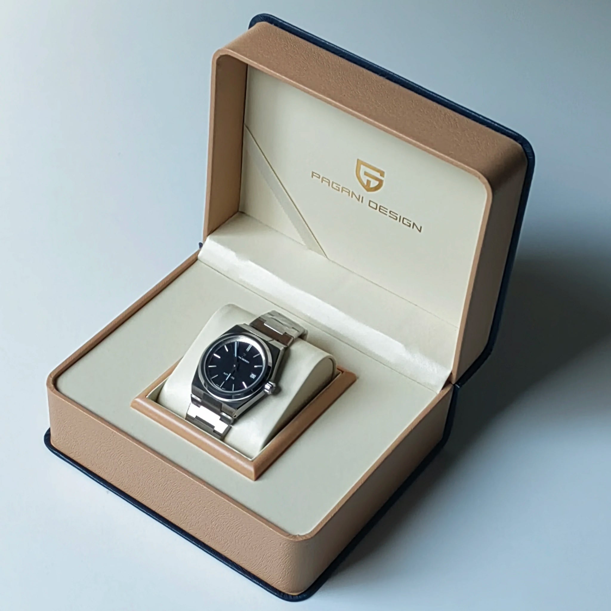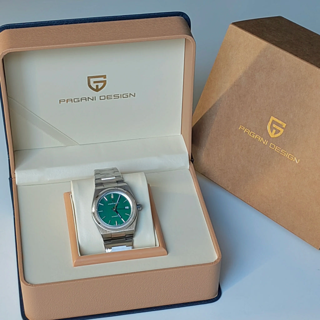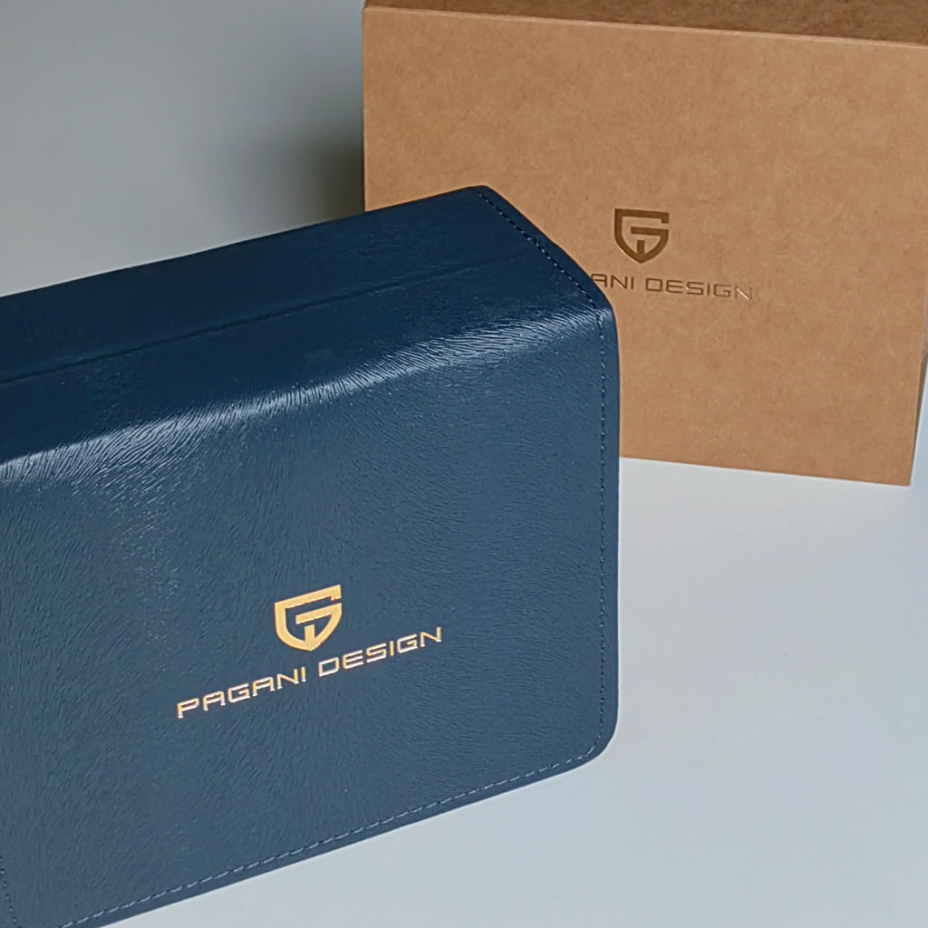 Choose from three classic dial colors: Black, Blue, or Green, each with a folding clasp featuring the distinctive Pagani Design logo. With a maximum circumference of 240mm and a case thickness of 12mm, this watch provides a comfortable fit and striking presence. Packaged in a stylish paper box, it makes for a perfect gift or personal indulgence.