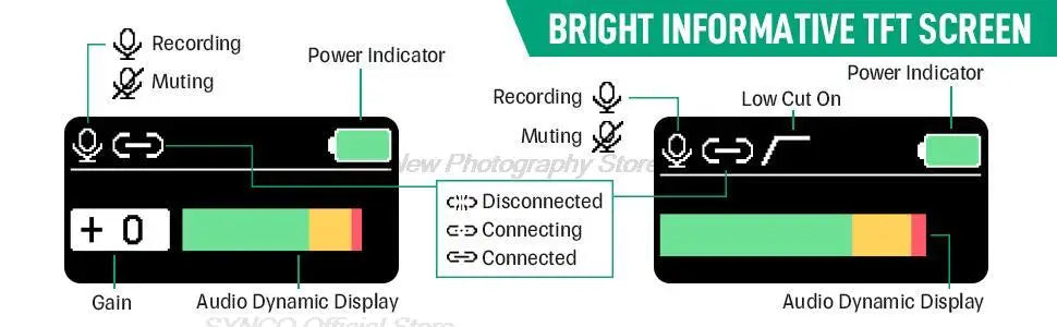- User-Friendly Display: TFT screen shows battery status, audio gain, and recording mode.