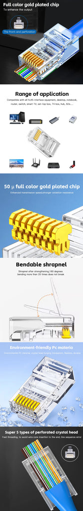 Enhance your networking setup with this pack of 50 Cat6 RJ45 connectors. Engineered for optimal performance, these connectors facilitate high-speed data transmission for both home and office environments. The unshielded design ensures straightforward installation, while the perforated crystal head guarantees a secure connection. Ideal for various applications, these connectors enable reliable, consistent networking.