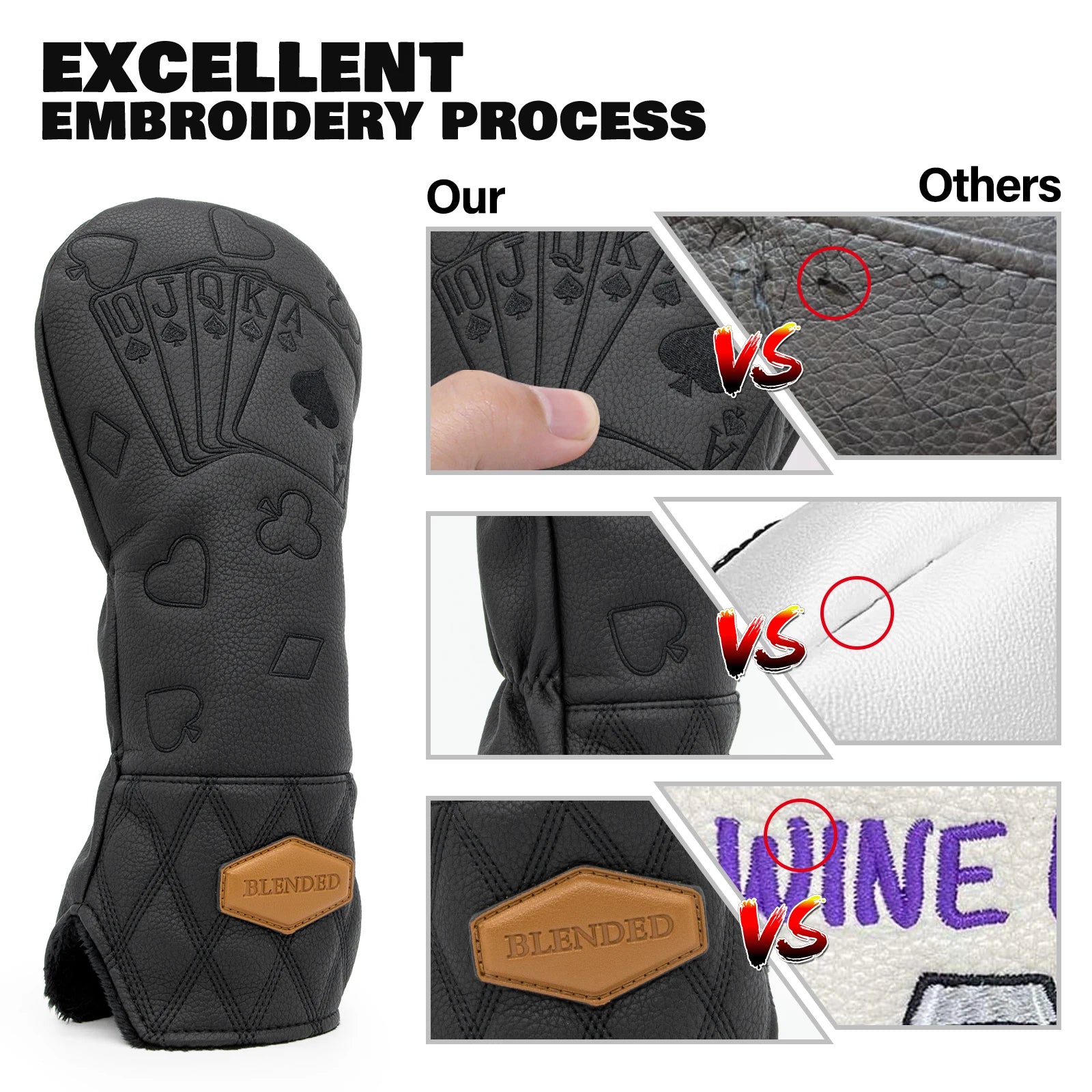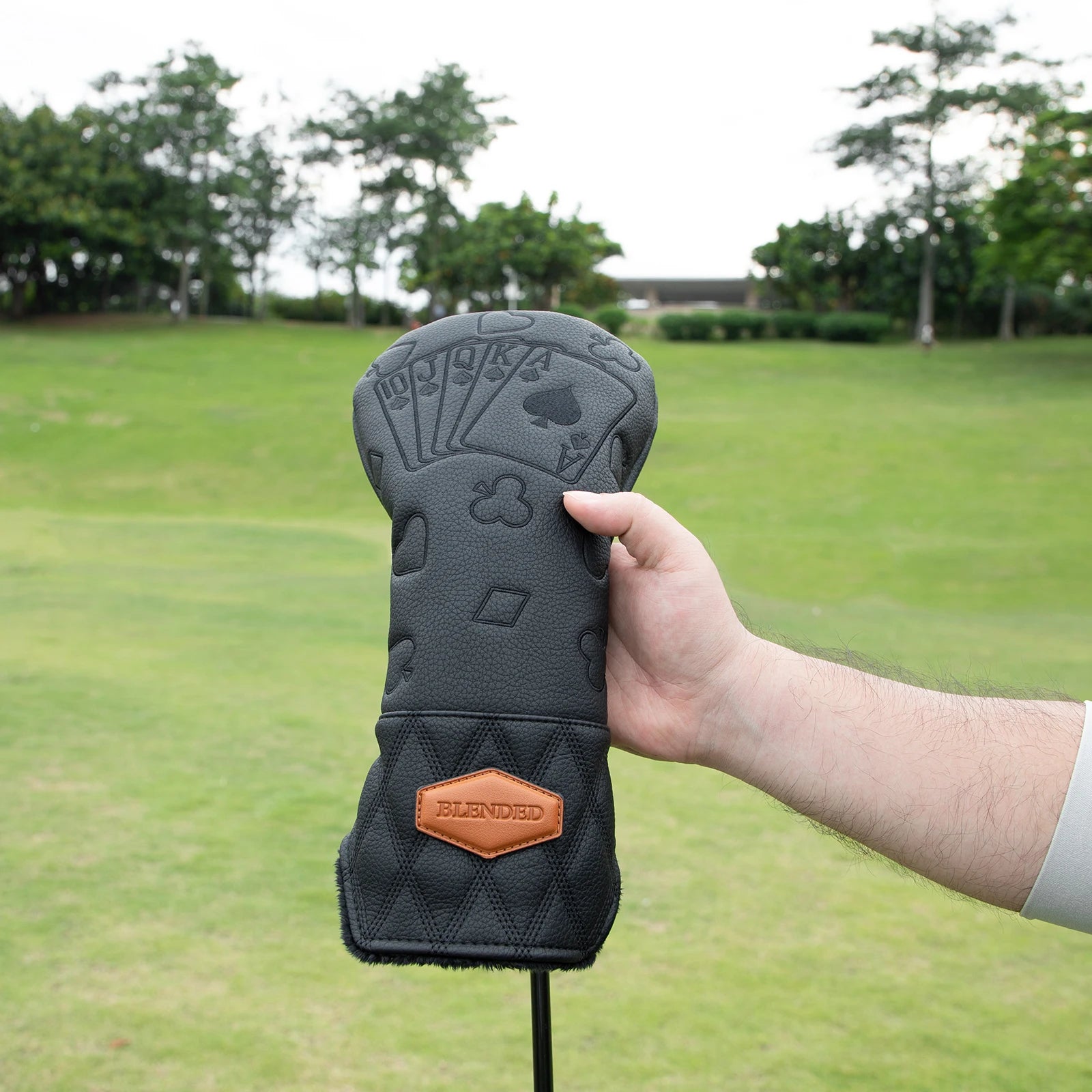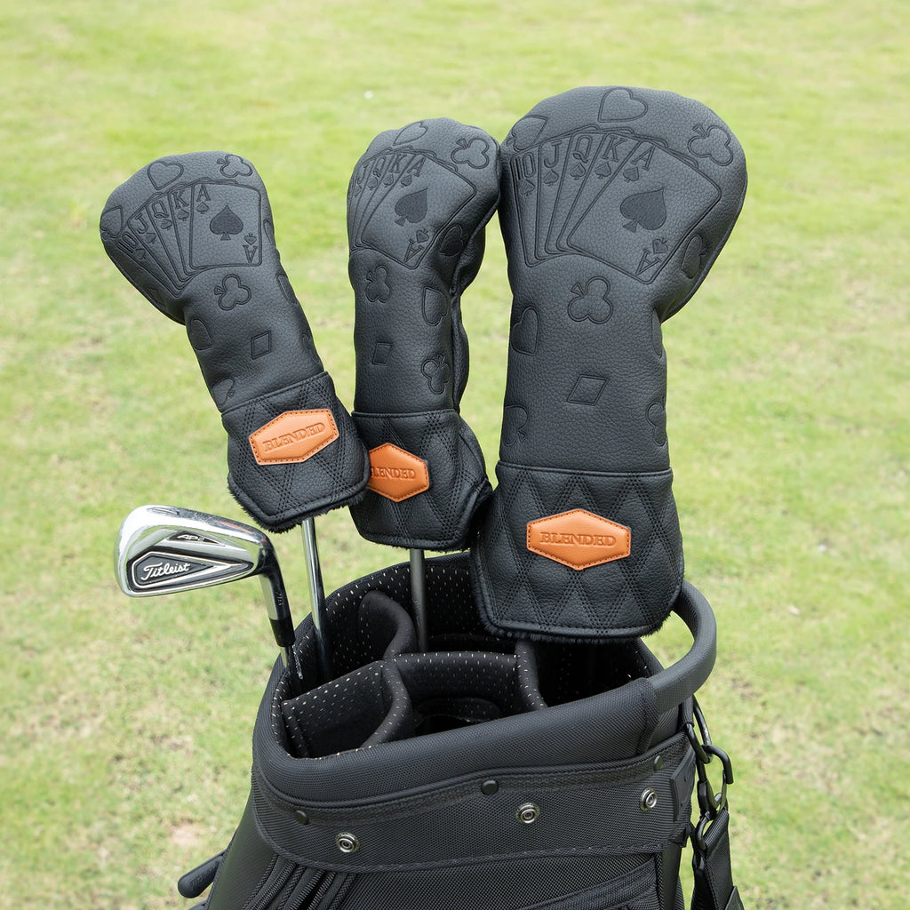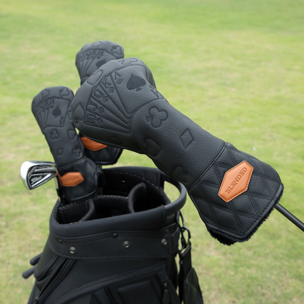 Black Poker Golf Headcovers Set - Driver, Fairway, Hybrid, 3 Wood Covers, Embroidered Design