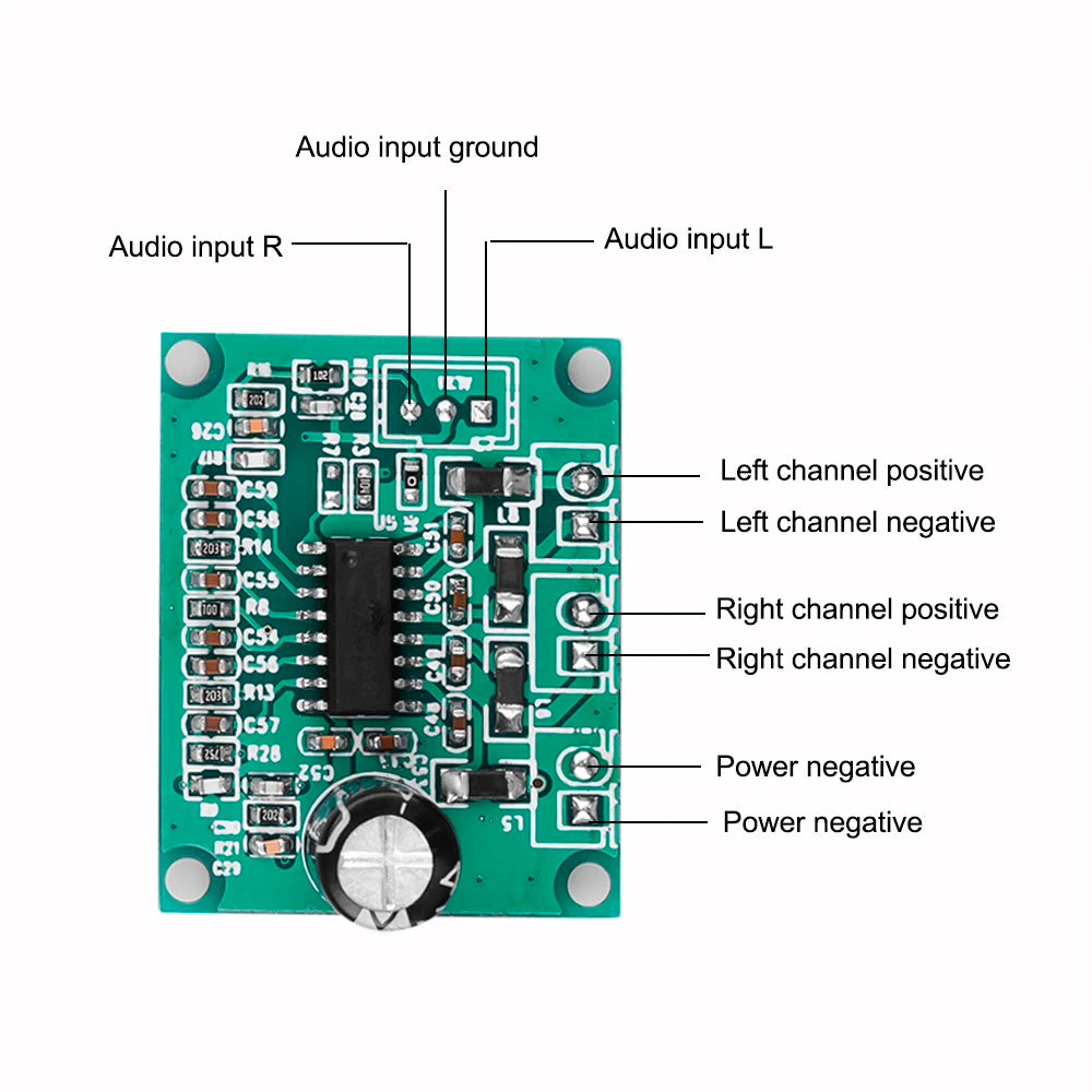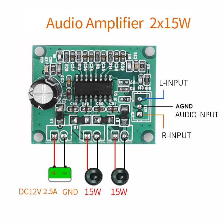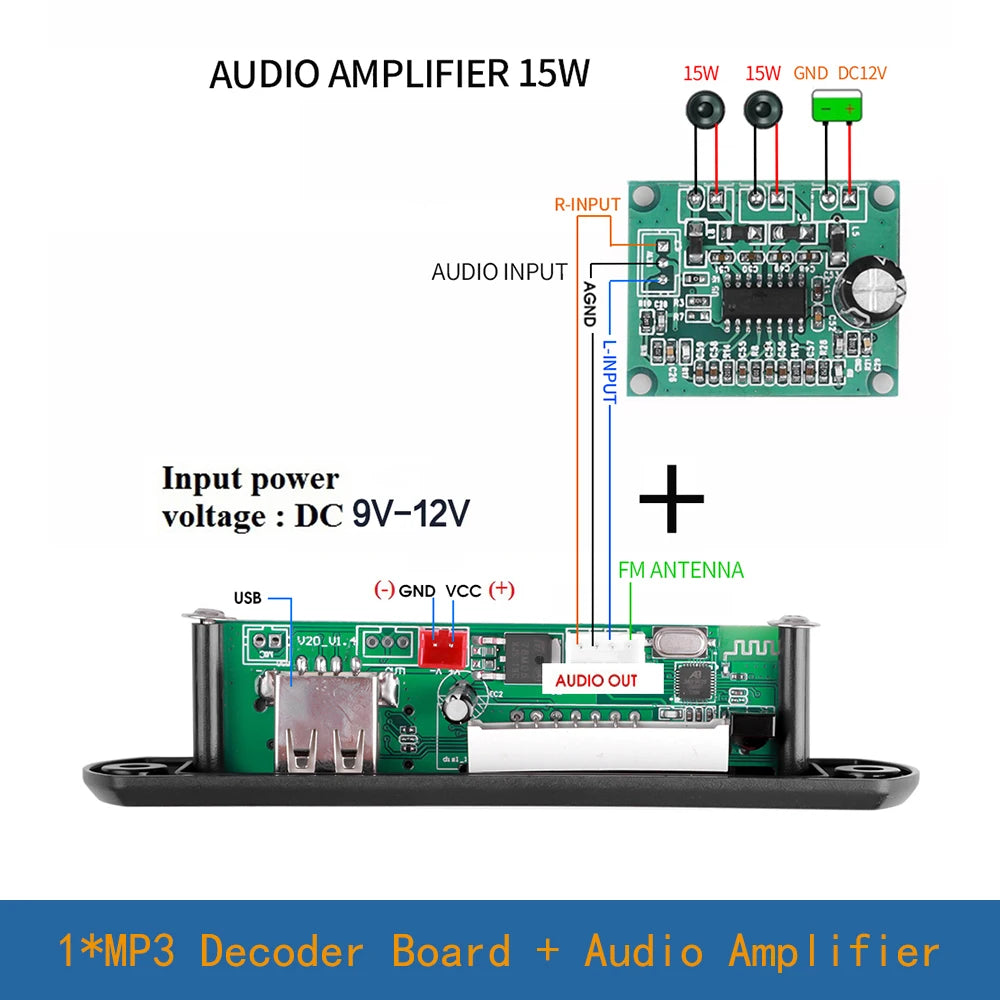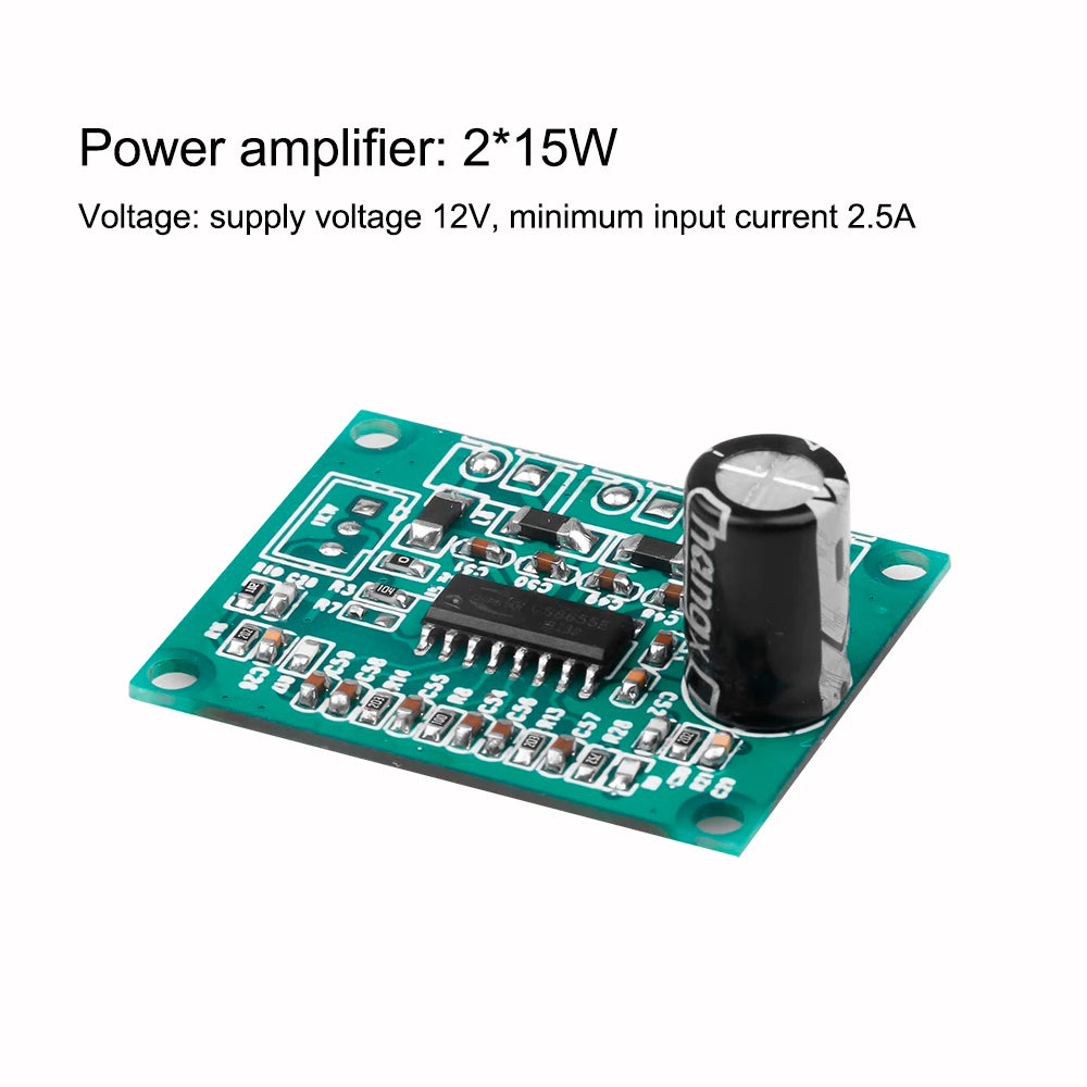 Designed for convenience, the decoder board comes with an AUX input for broader compatibility and infrared remote control for effortless operation. It operates on a power amplifier board with 2*15W output, powered by a 12V supply.