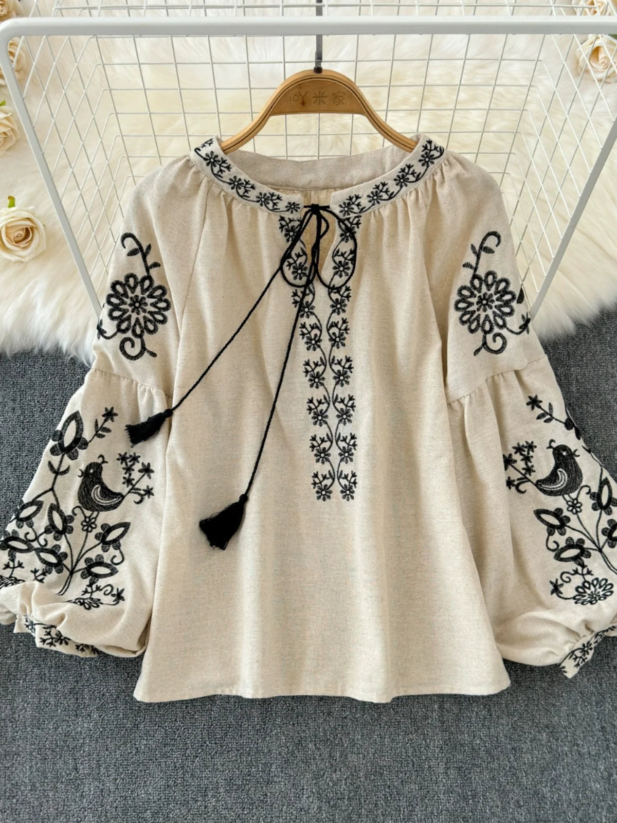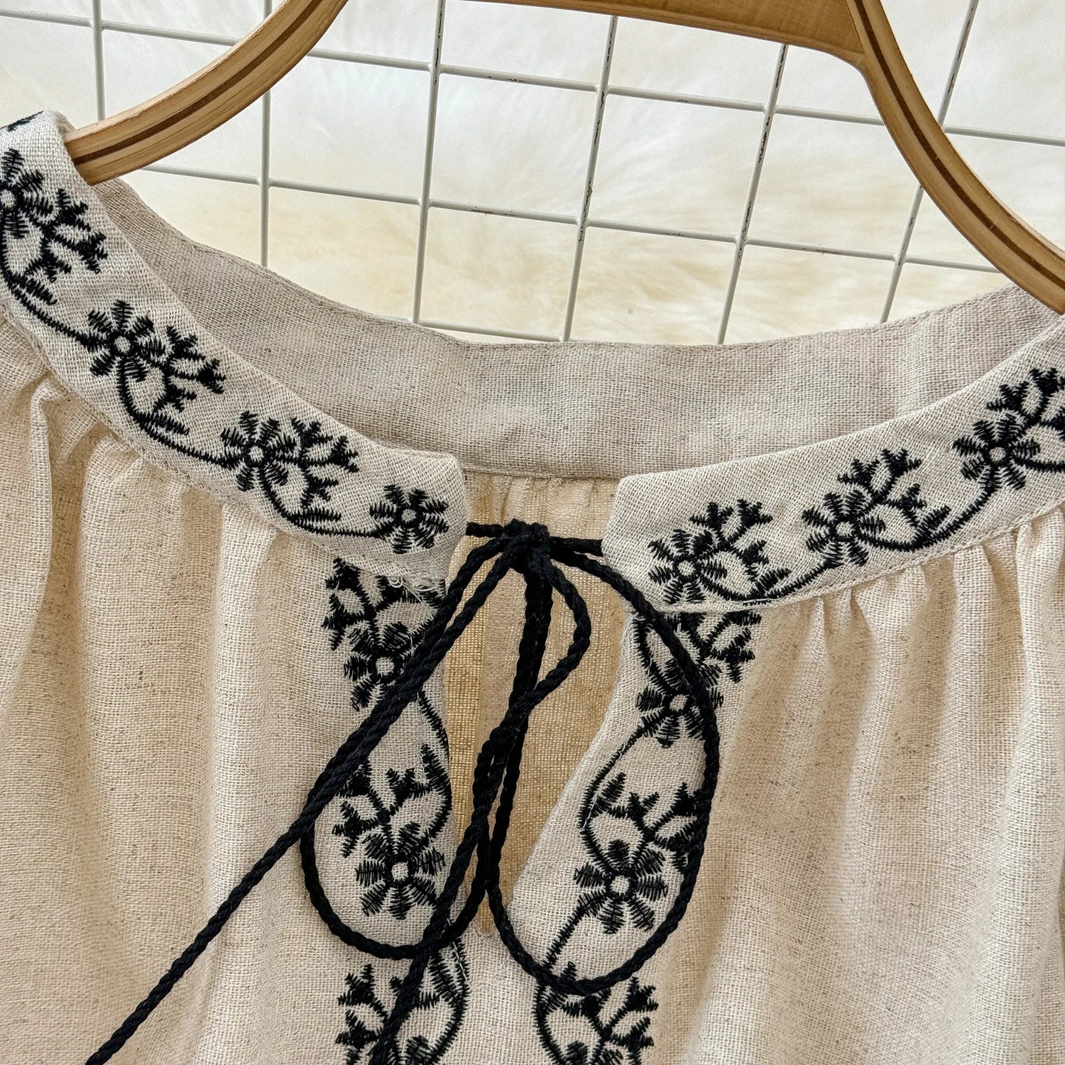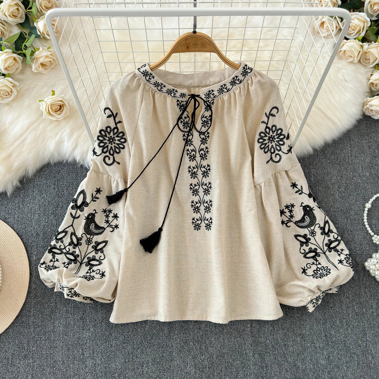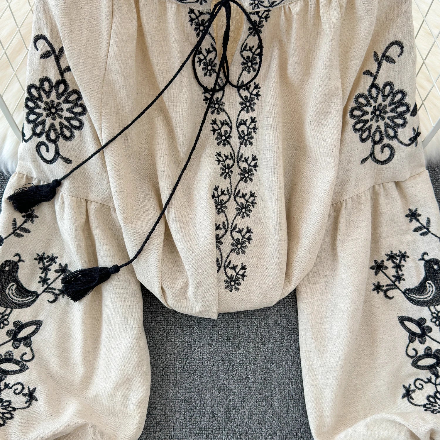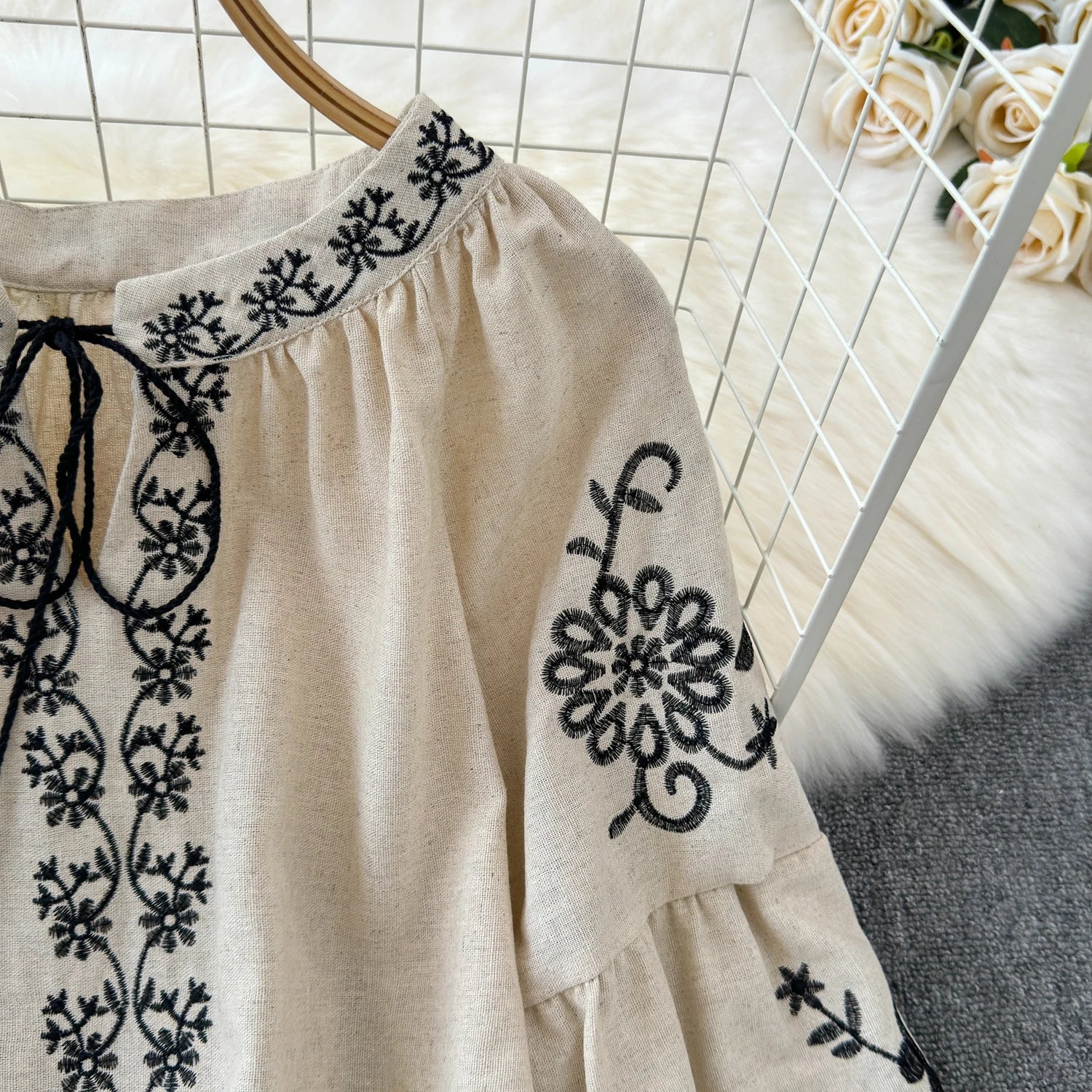 Boho Summer Blouse Lace-up O-neck Puff Sleeve Floral Embroidered Casual Women's Top