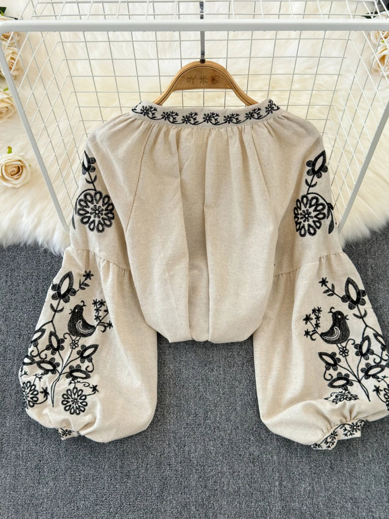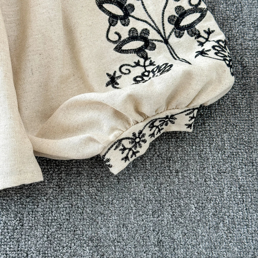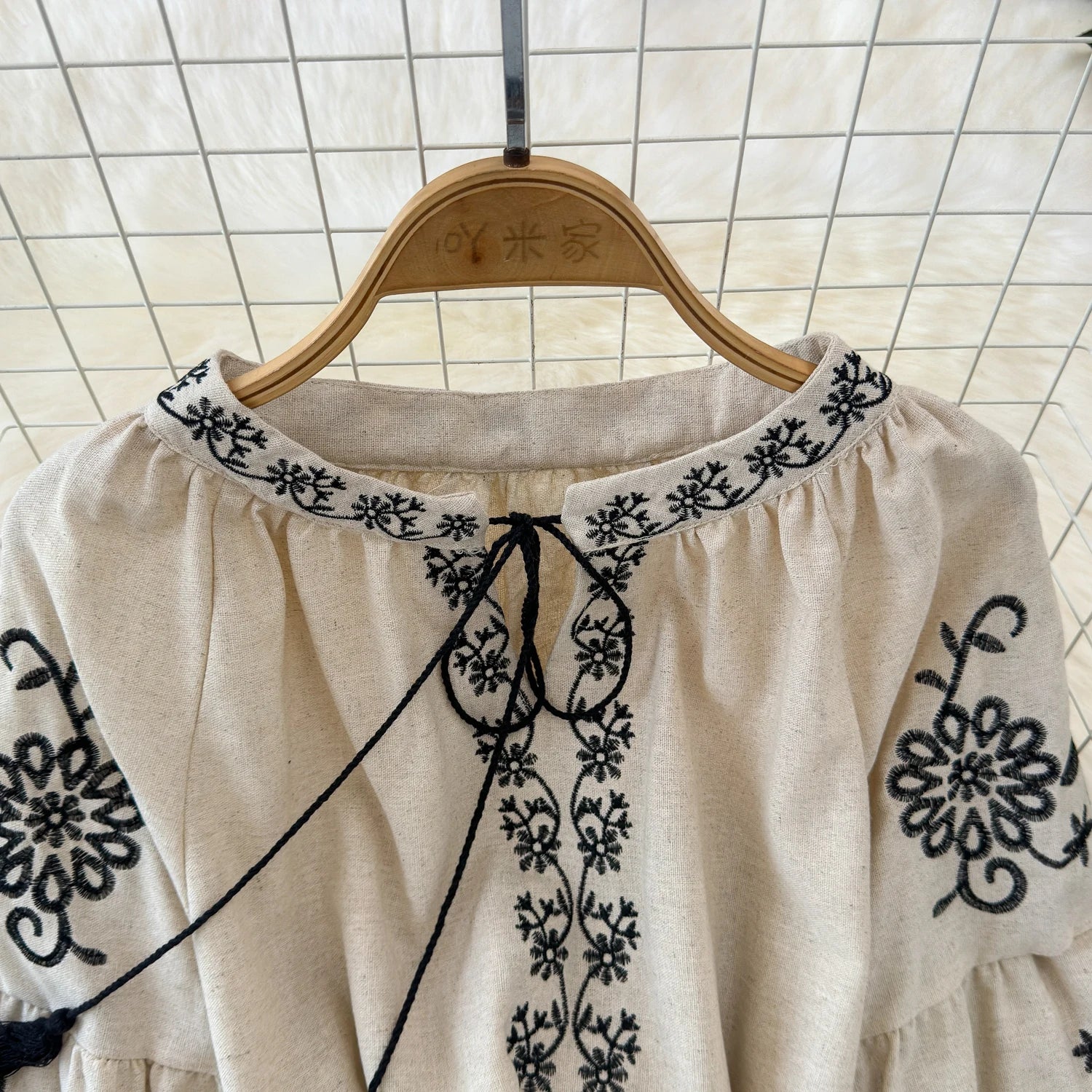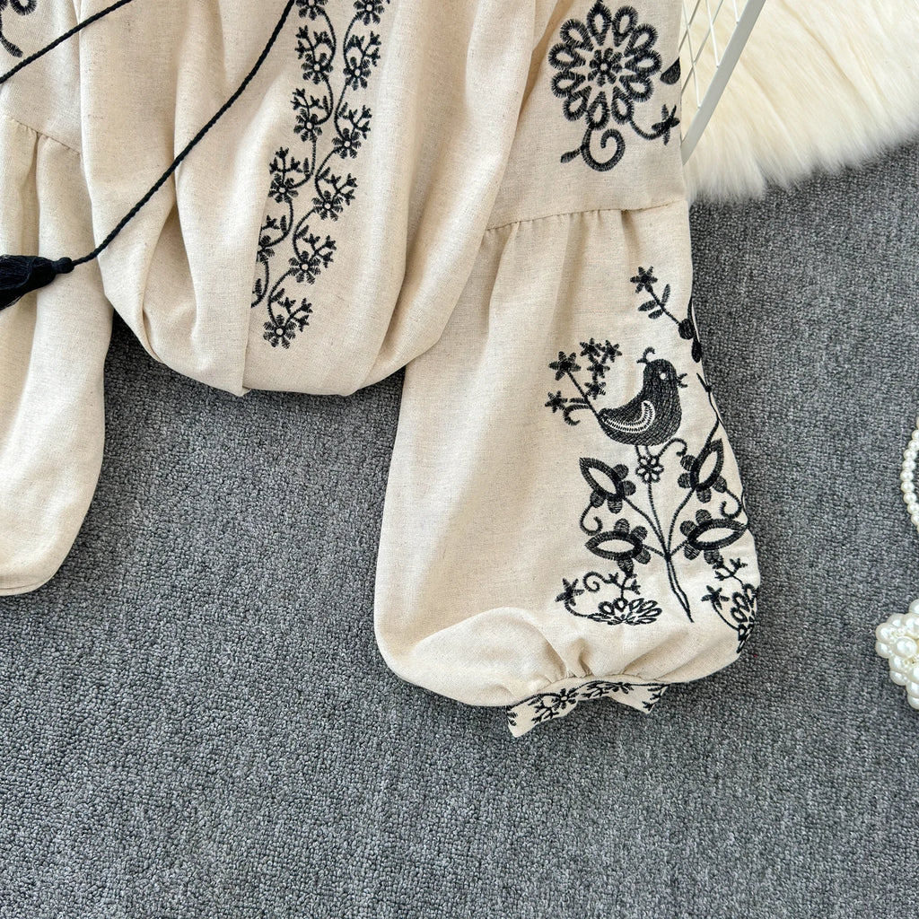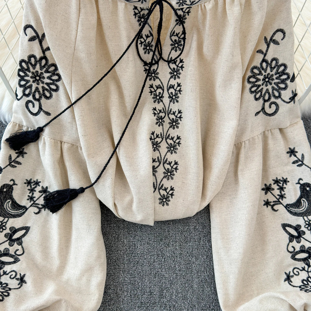 Boho Summer Blouse Lace-up O-neck Puff Sleeve Floral Embroidered Casual Women's Top