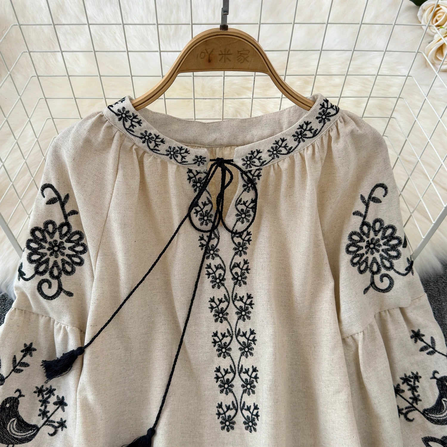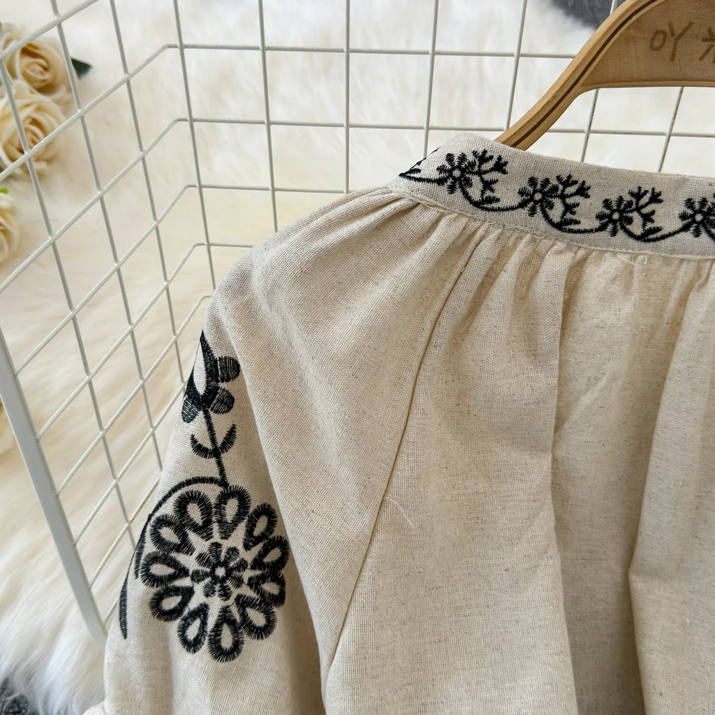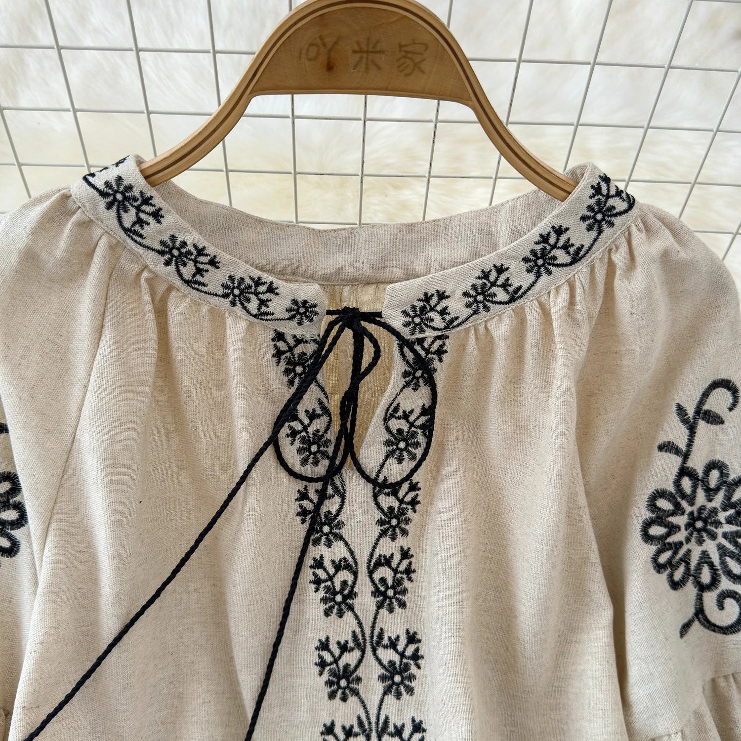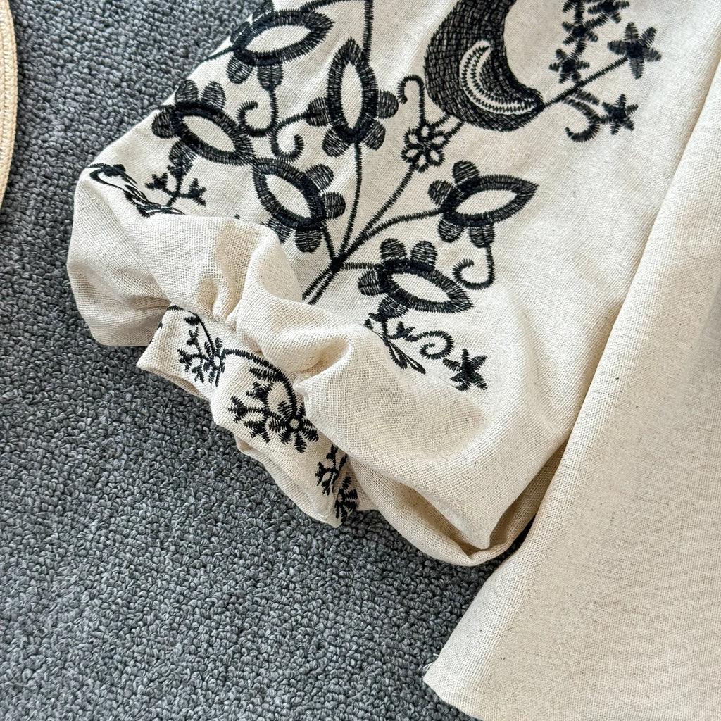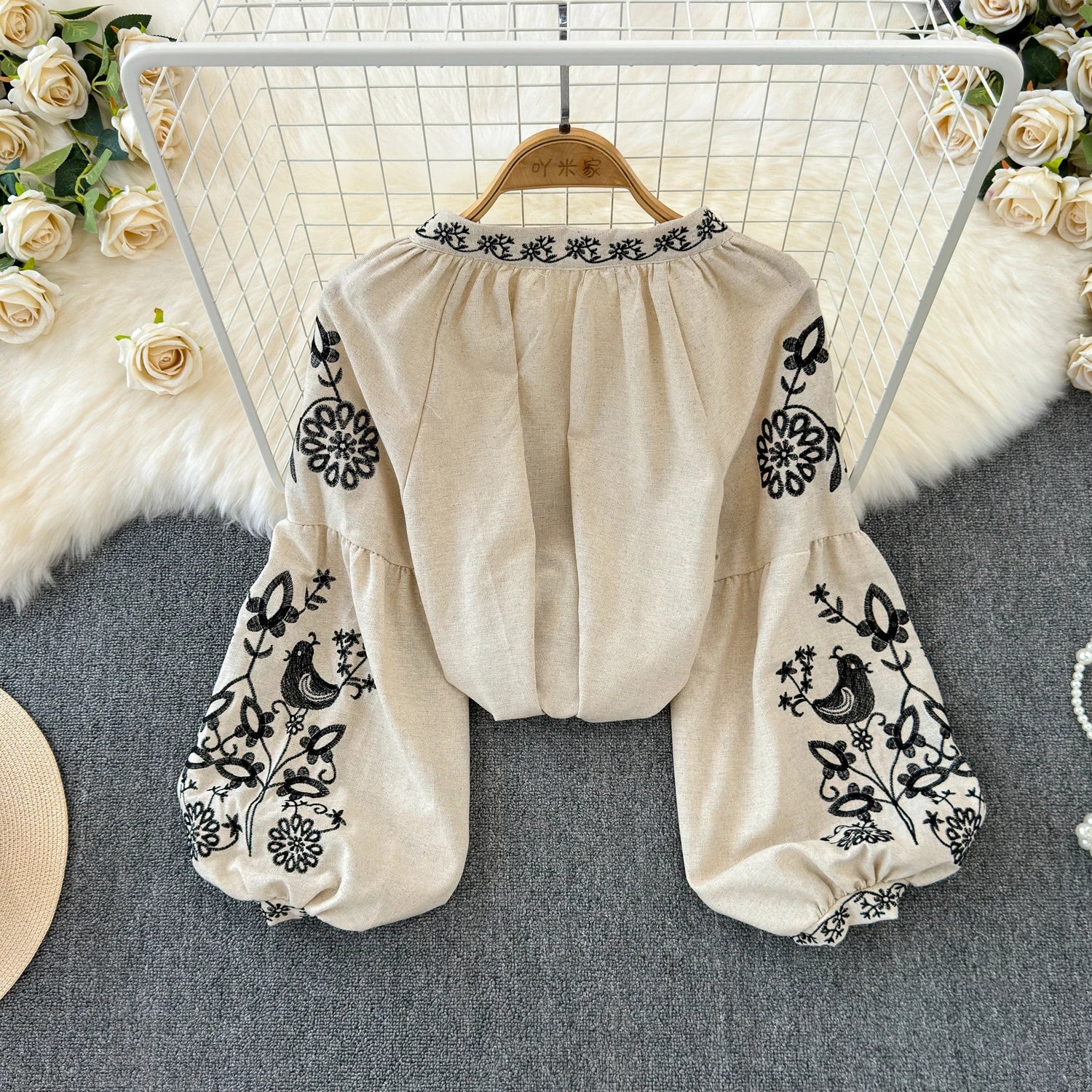 Boho Summer Blouse Lace-up O-neck Puff Sleeve Floral Embroidered Casual Women's Top