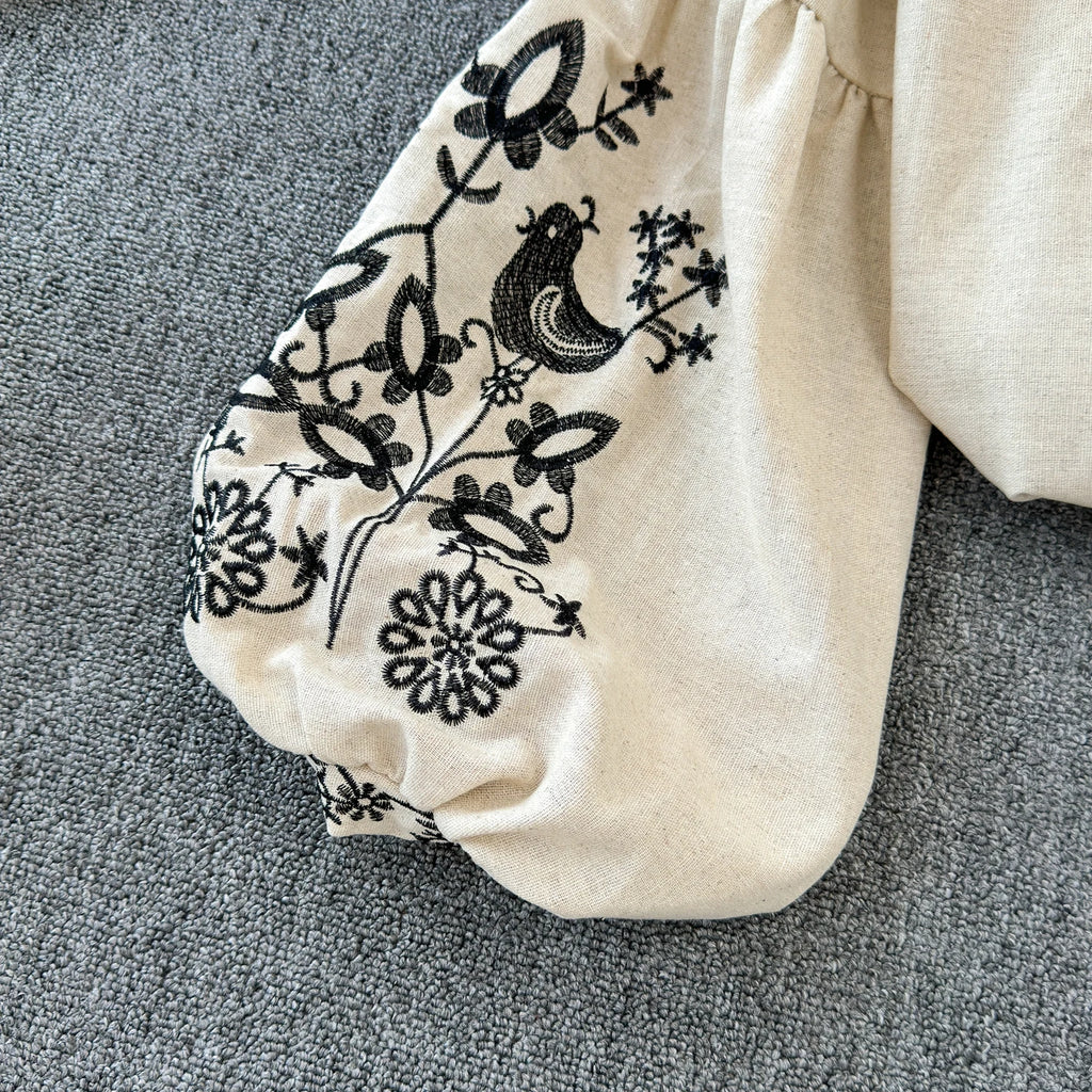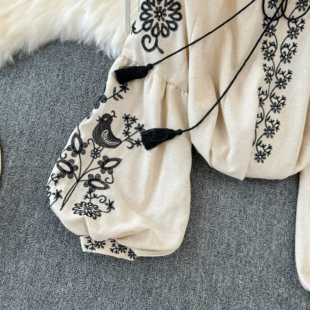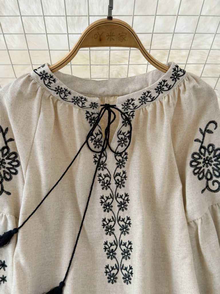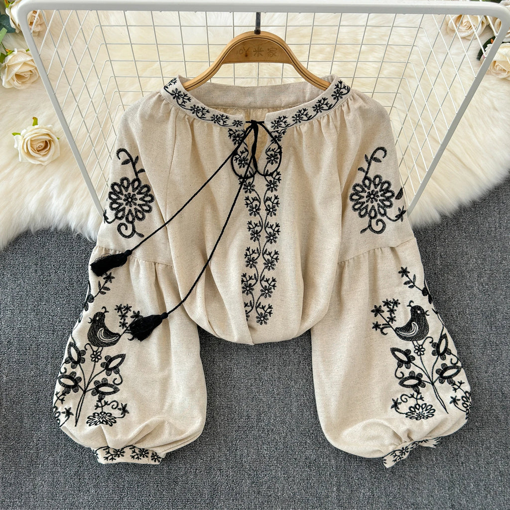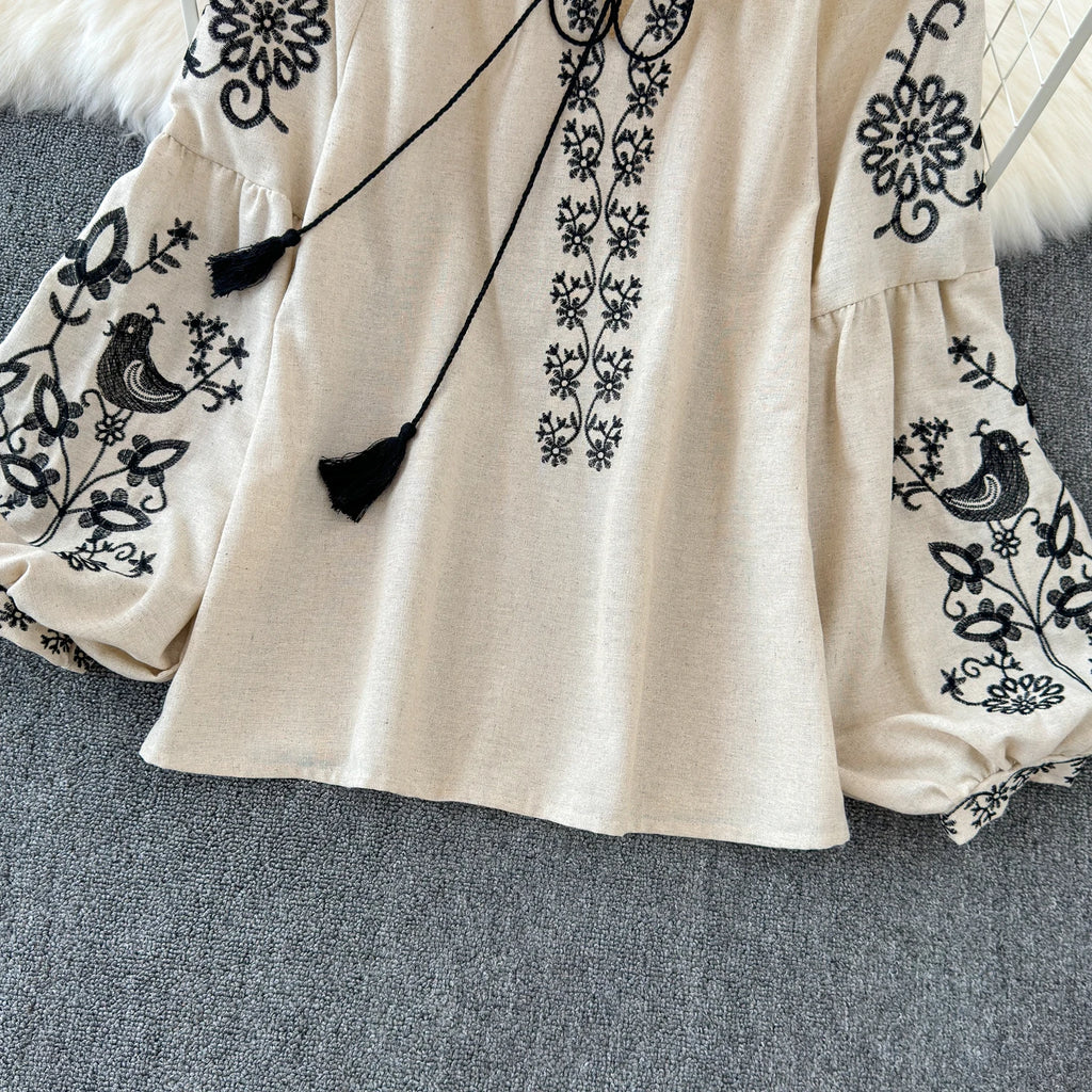 Boho Summer Blouse Lace-up O-neck Puff Sleeve Floral Embroidered Casual Women's Top