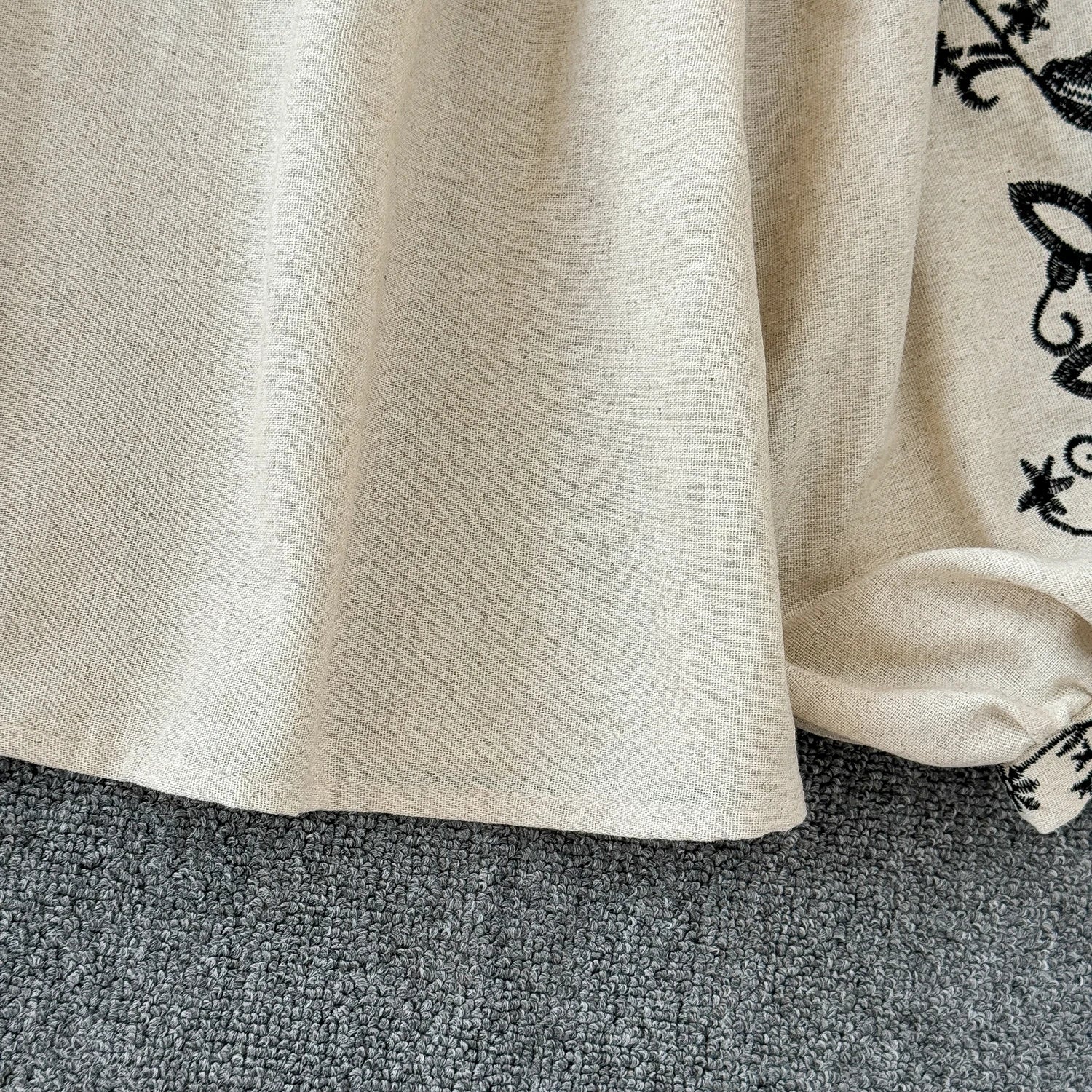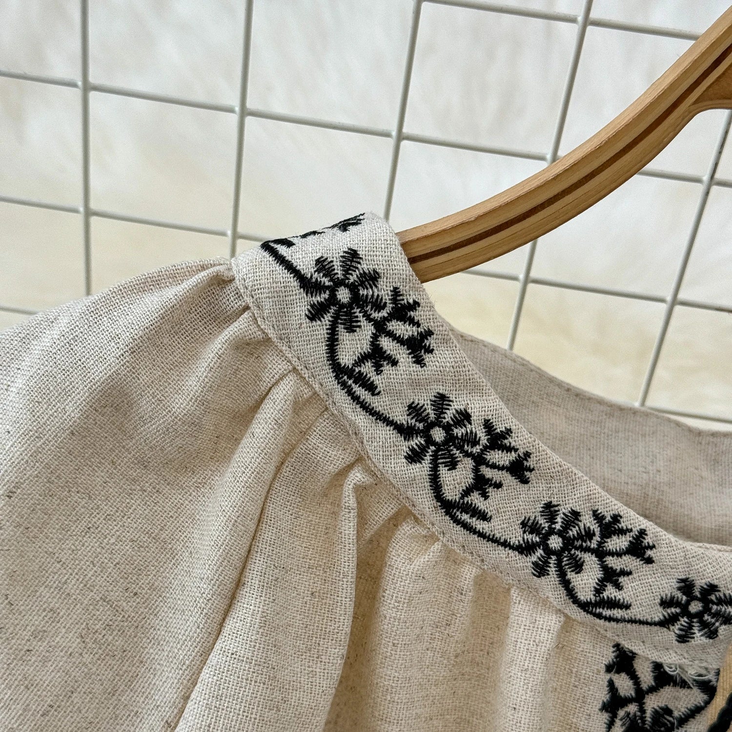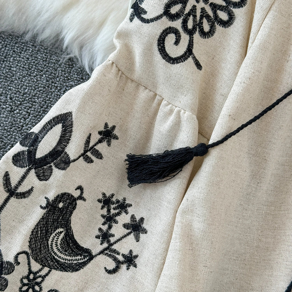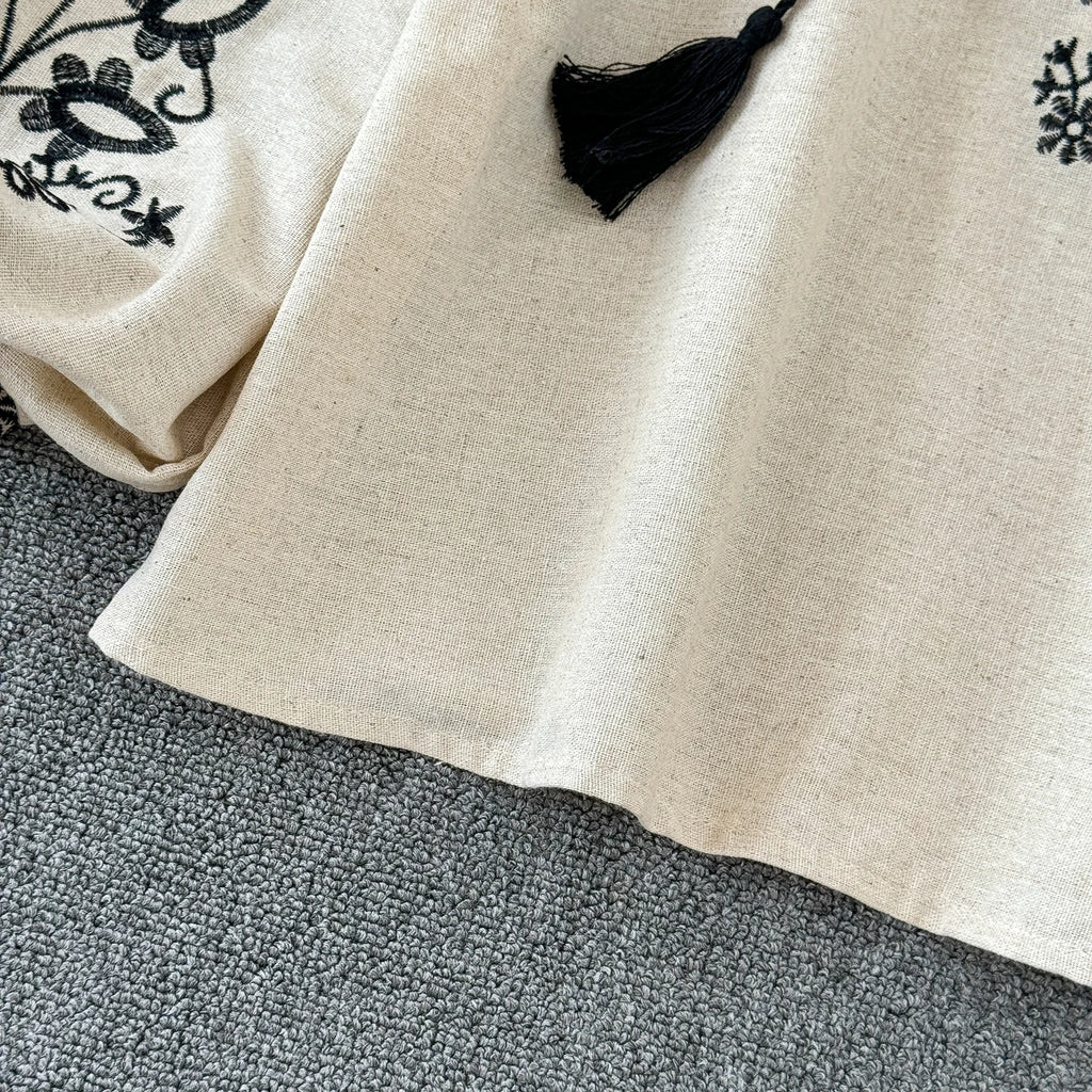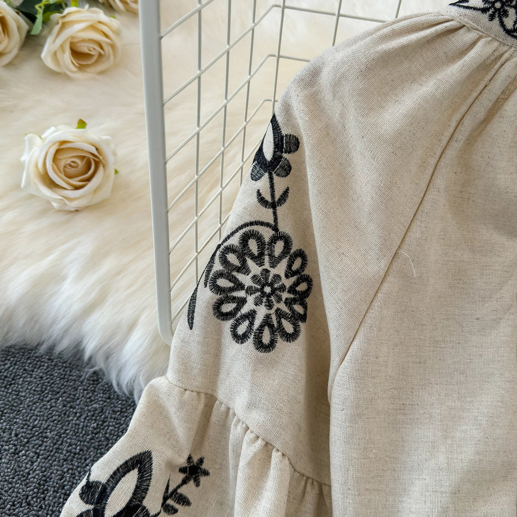 Boho Summer Blouse Lace-up O-neck Puff Sleeve Floral Embroidered Casual Women's Top