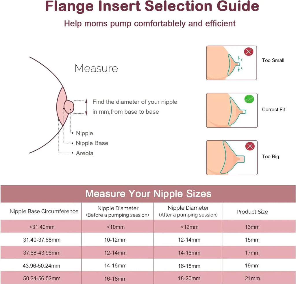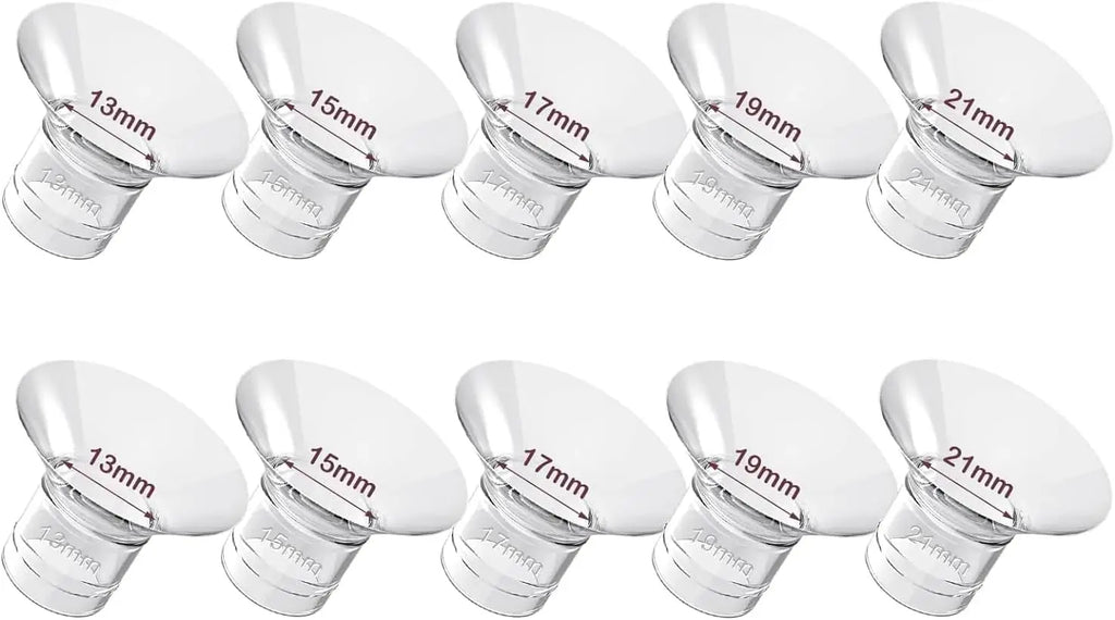 Our flange inserts come in four different sizes (15mm, 17mm, 19mm, 21mm), ensuring a perfect fit and preventing nipple trauma or irritation for mothers with smaller nipples using larger pumps. With a lightweight and practical design, they make milk expression more comfortable.