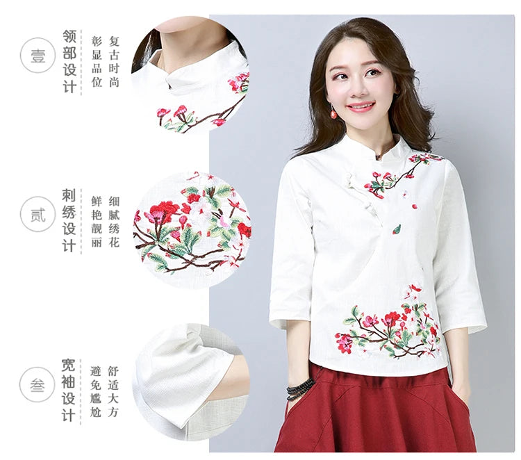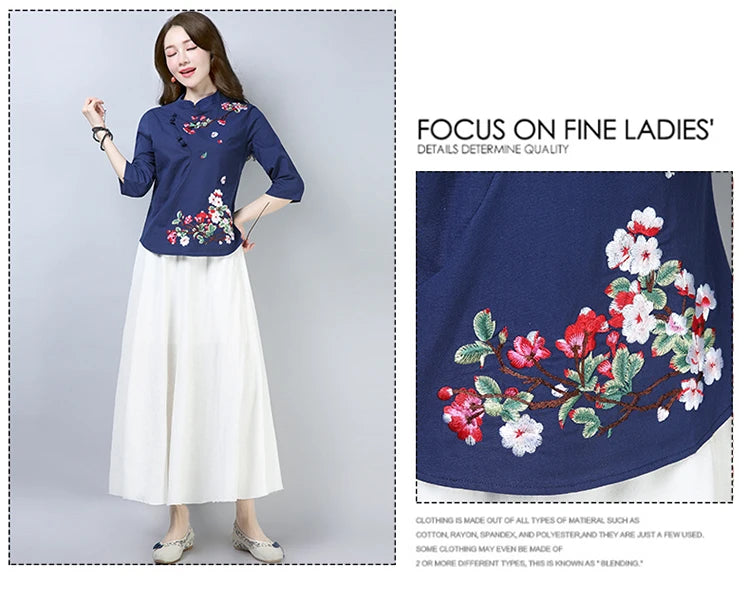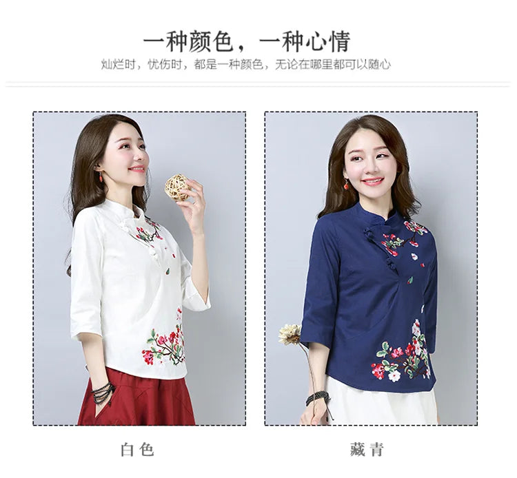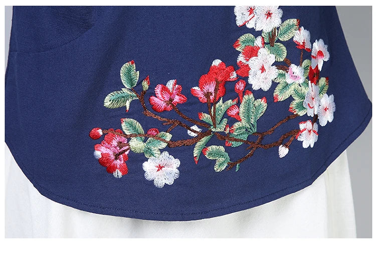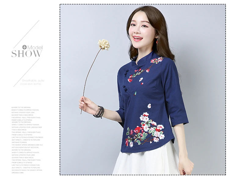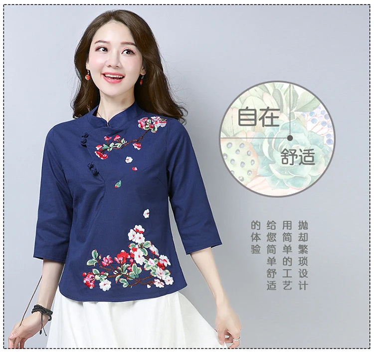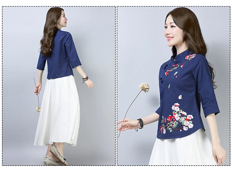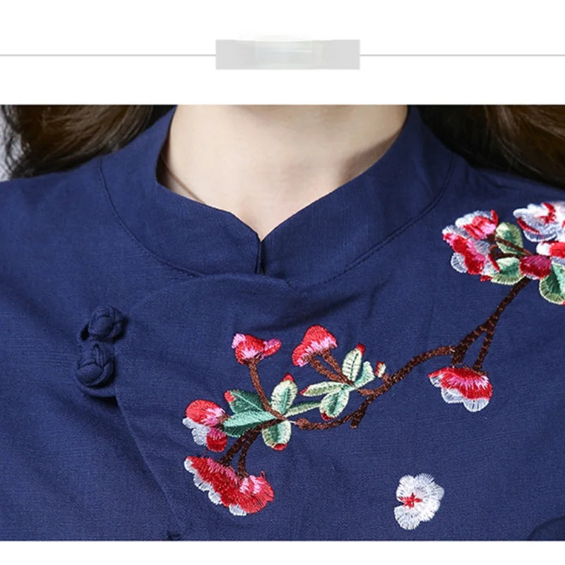 Blue White Embroidered Cotton Linen Qipao Shirt for Women - Retro Loose Hanfu Blouse Summer Top