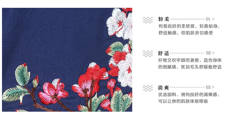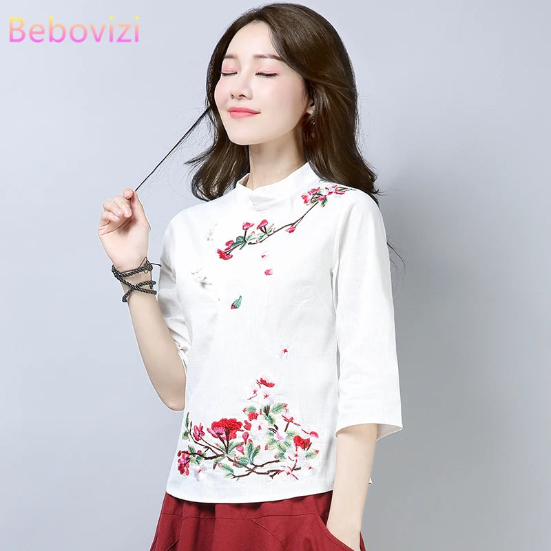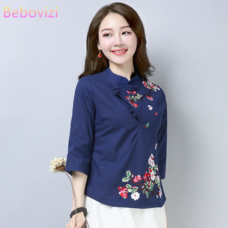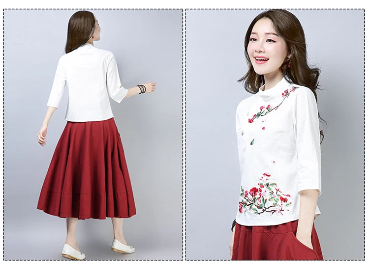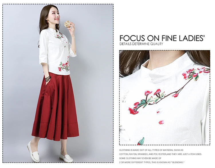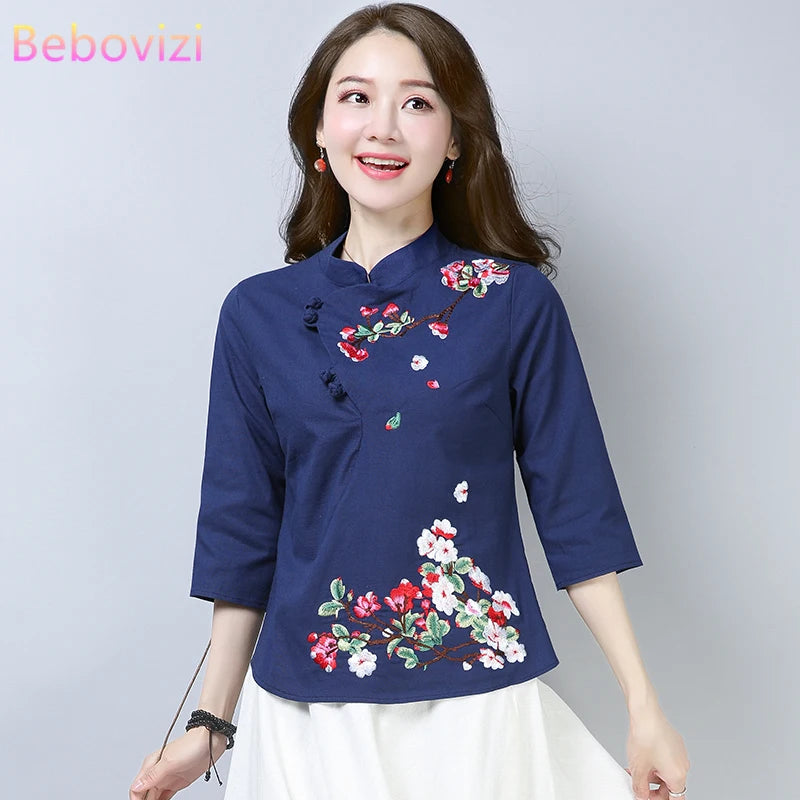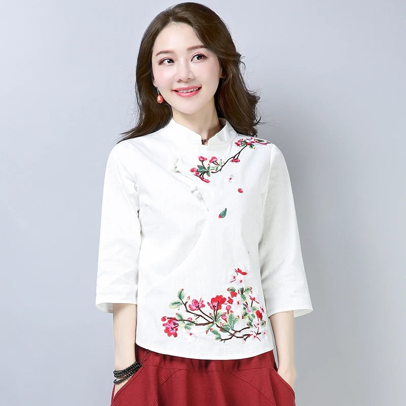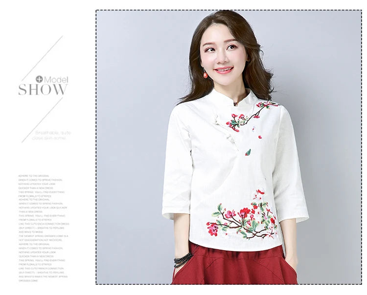 Blue White Embroidered Cotton Linen Qipao Shirt for Women - Retro Loose Hanfu Blouse Summer Top