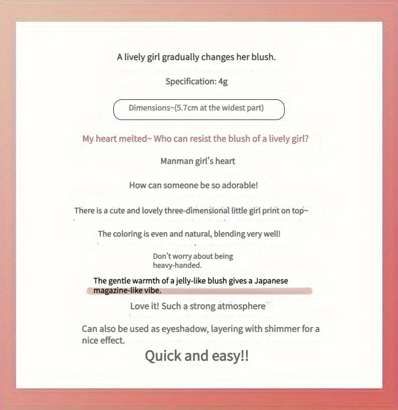 Enhance your beauty routine with this luxurious dual-gradient blusher, crafted to illuminate your cheeks with a stunning, radiant finish. Its innovative formula revitalizes your skin, offering a fresh, youthful glow that lasts all day.