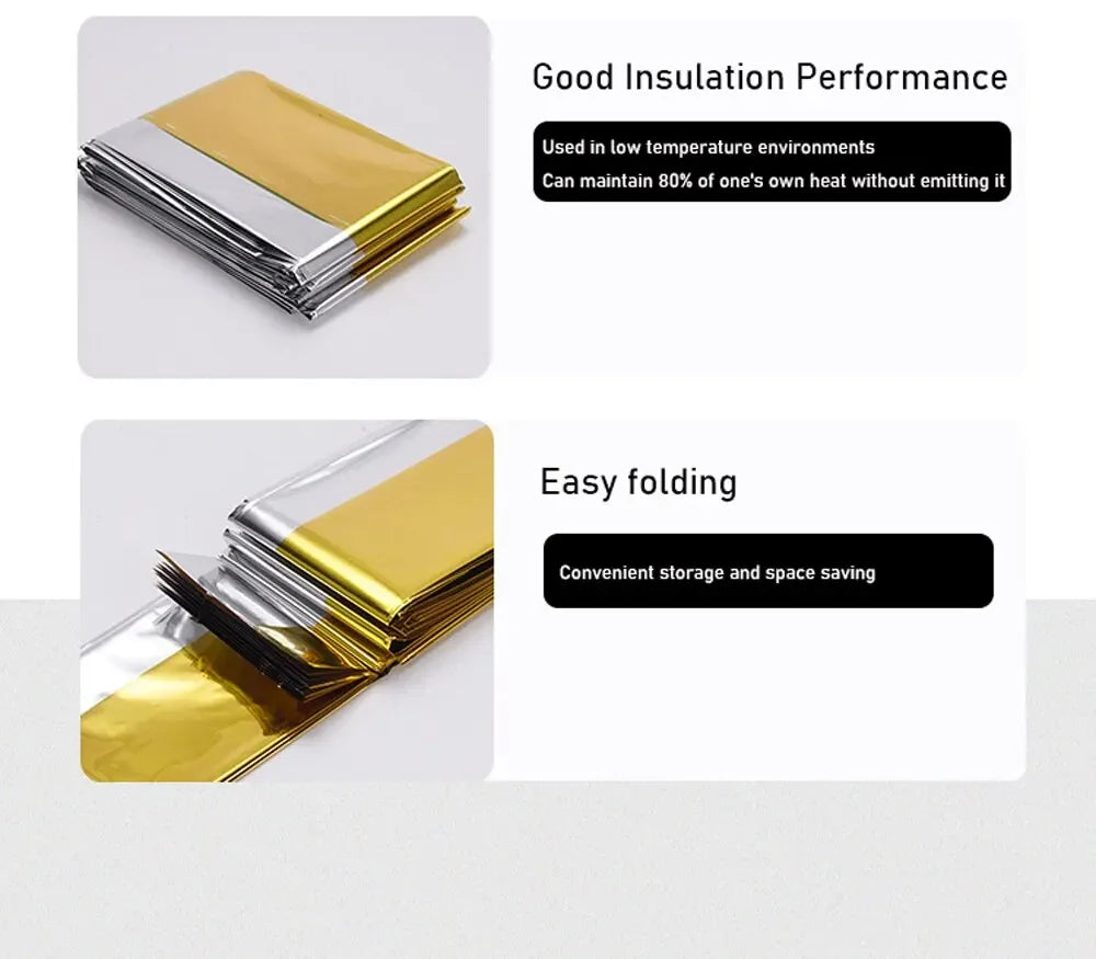 Stay prepared in emergencies with our durable First-Aid Insulation Blanket, an essential addition to your survival gear. Made from premium PET film, this versatile emergency blanket is designed to help maintain body warmth and protect against harsh weather conditions. Available in two sizes and colors—130x210cm in silver and 160x210cm in gold silver—it offers optimal coverage and functionality.