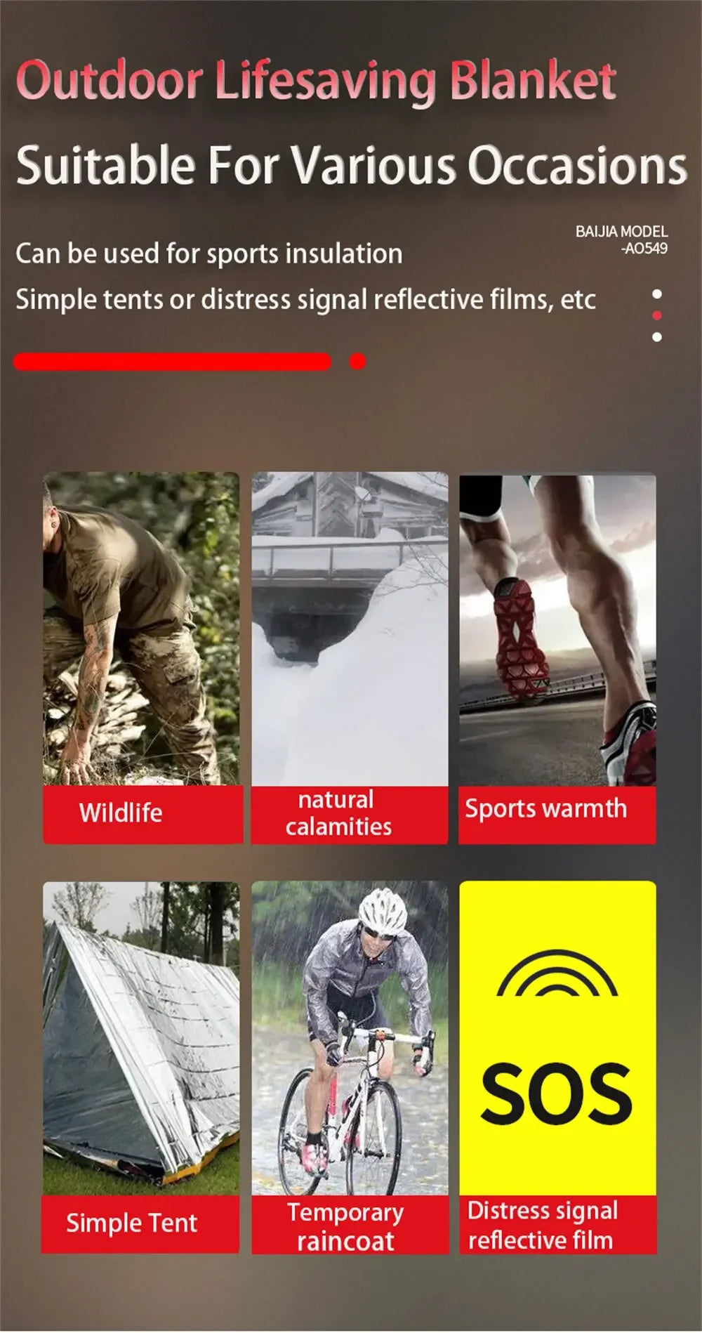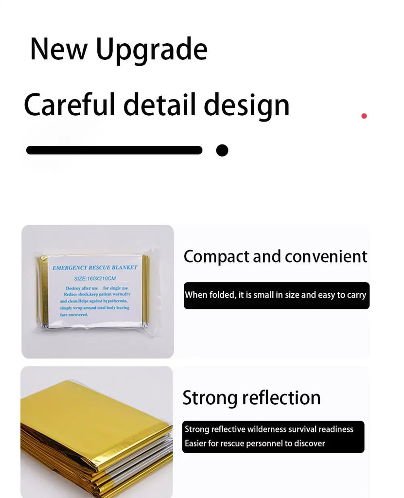 Whether you're facing a sudden drop in temperature after an accident or stranded with a broken-down vehicle in cold conditions, this blanket is your go-to solution for retaining body heat. Its reflective properties can serve as a signal for rescuers, while on rainy days, it doubles as a protective poncho or can be extended to form a canopy. Additionally, it is perfect for shielding your car from heat when parked under direct sunlight—just place it over the front windshield. It's also an invaluable accessory for use inside a sleeping bag to enhance warmth.