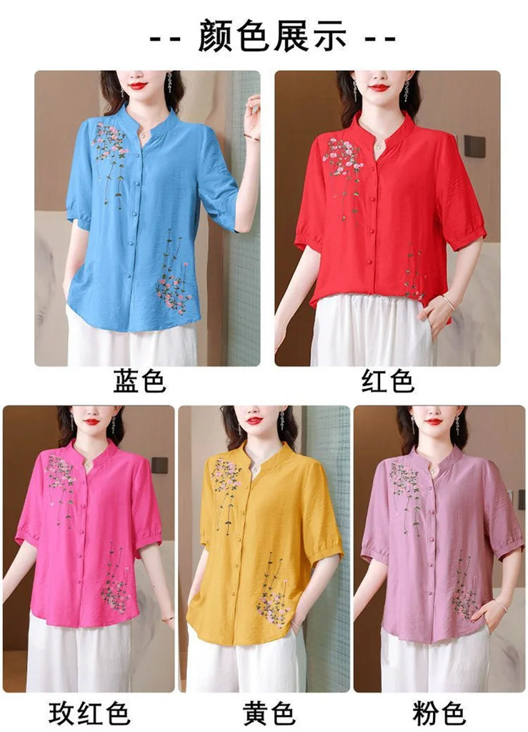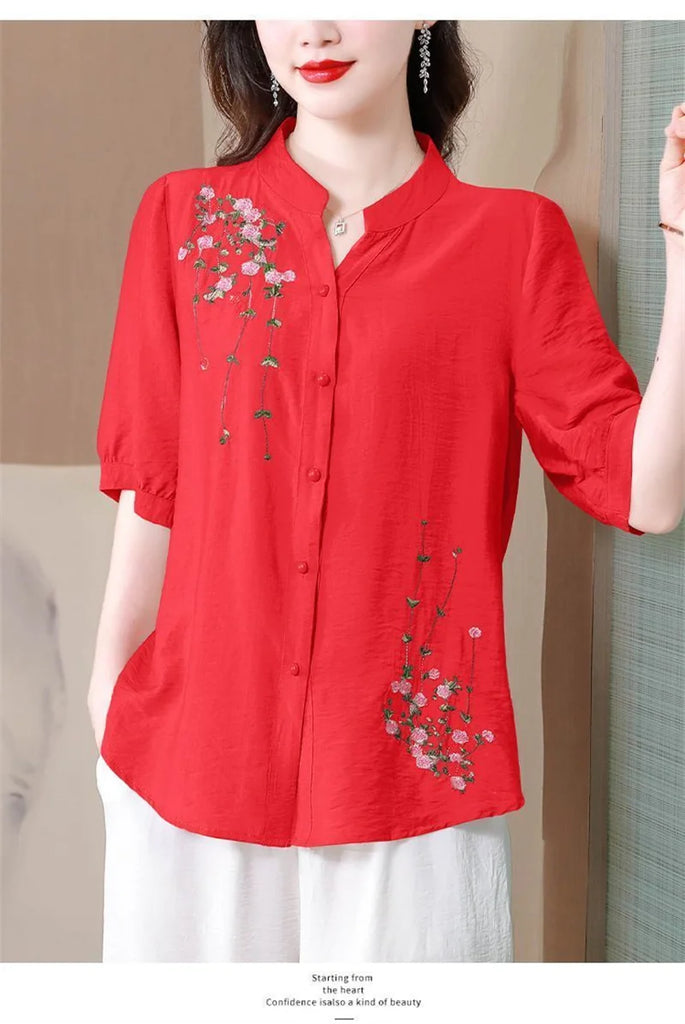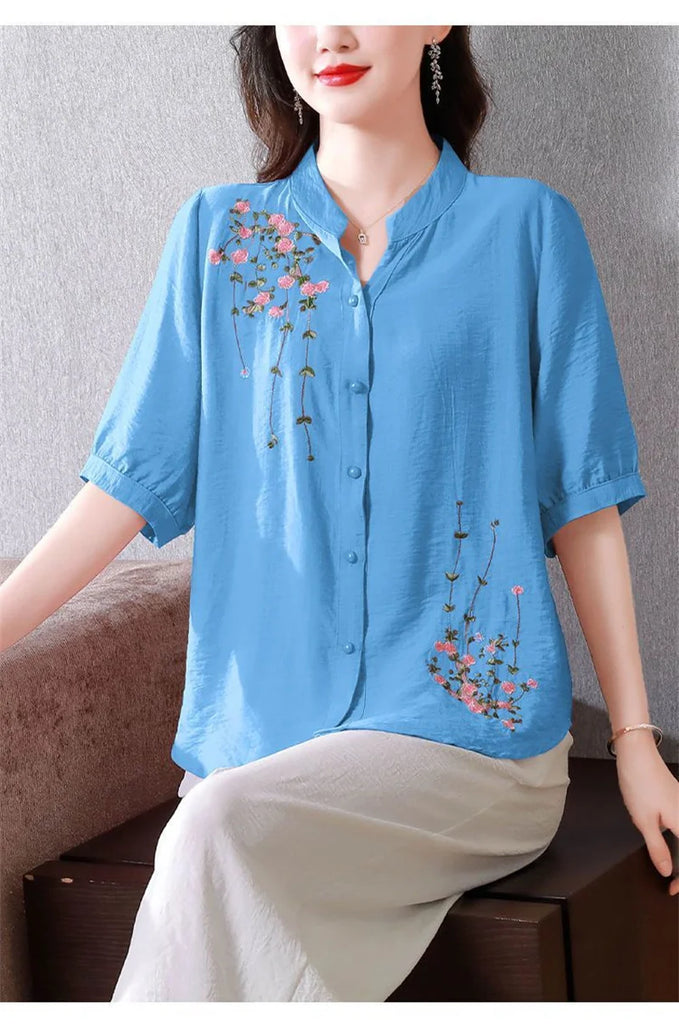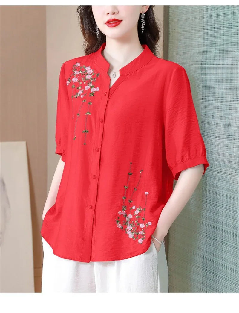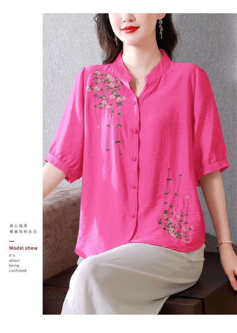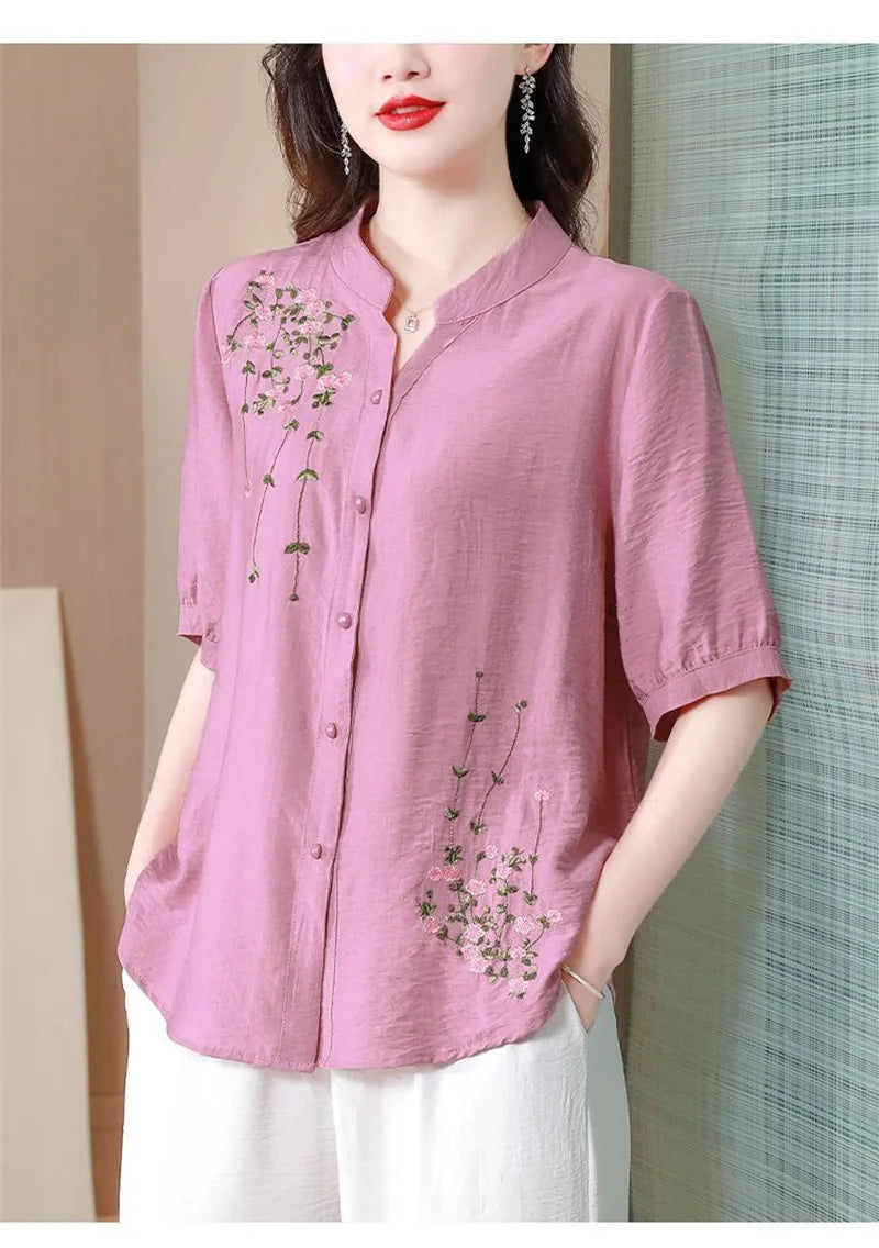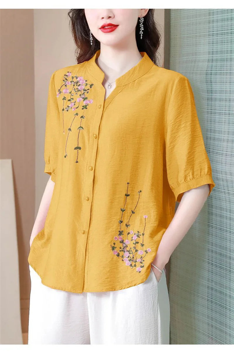 Embroidered V-Neck Summer Cotton Linen Blouse Women’s Short Sleeve Loose Cardigan Top Plus Size 4XL
