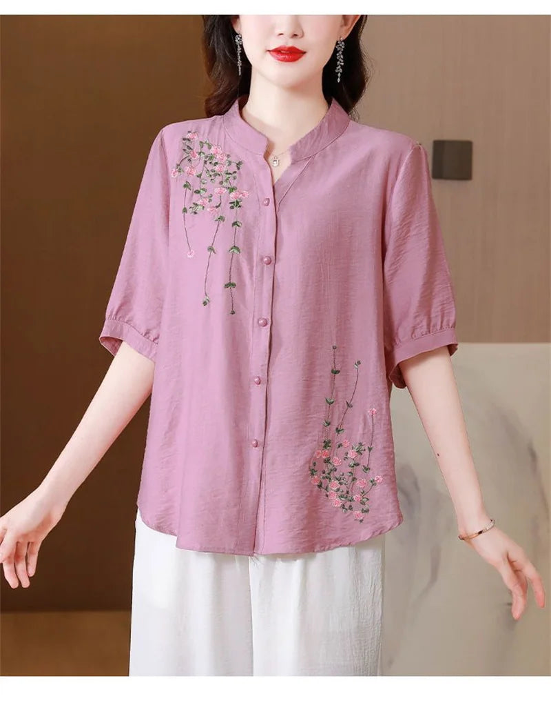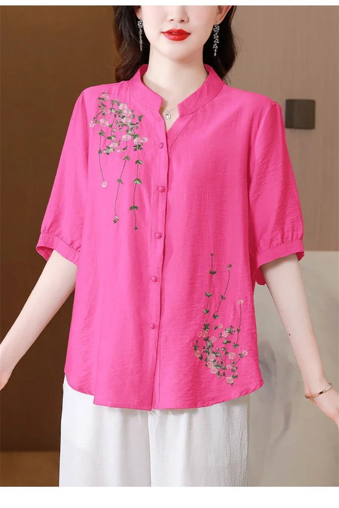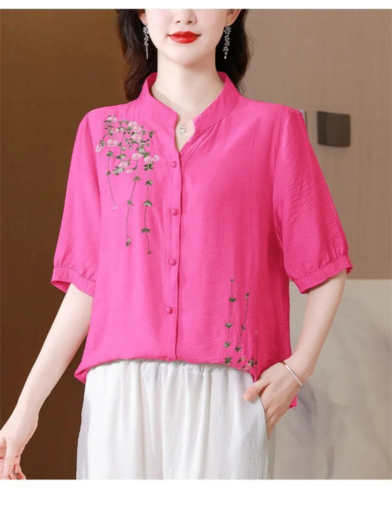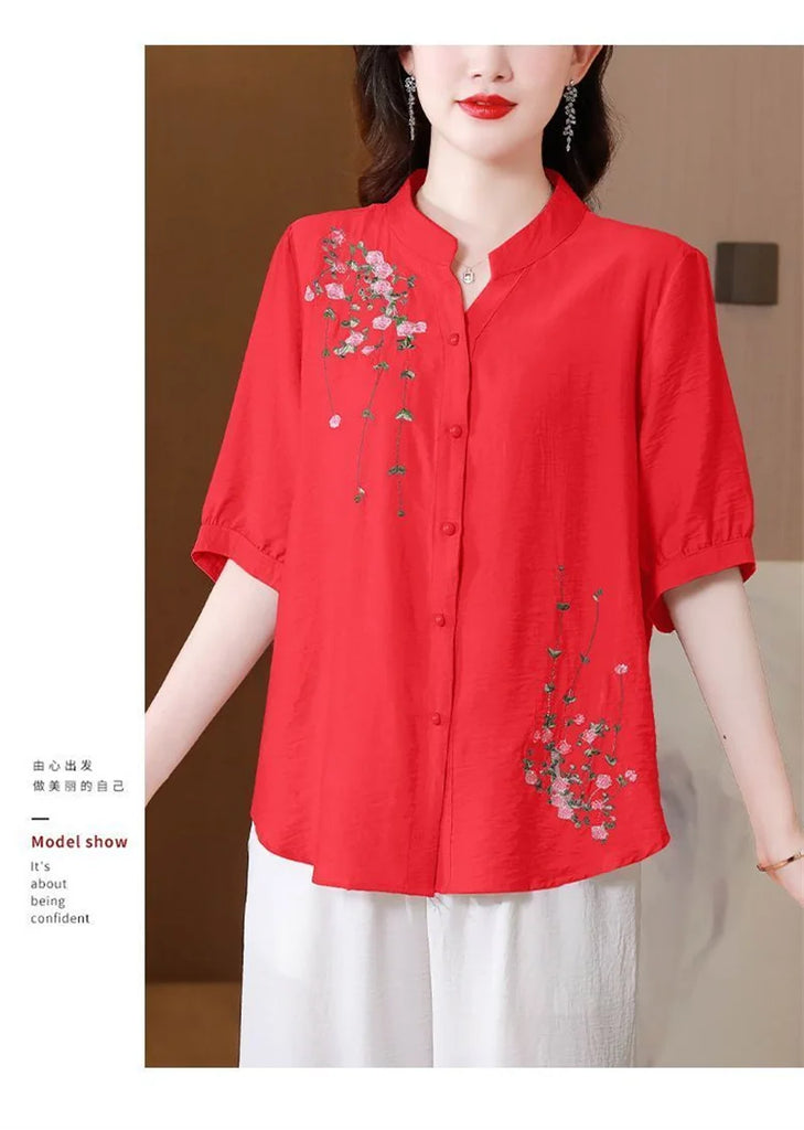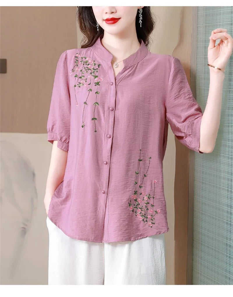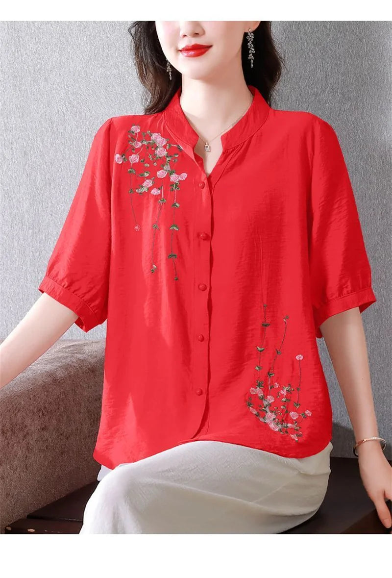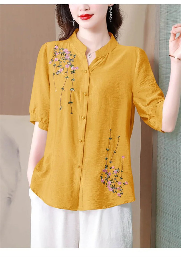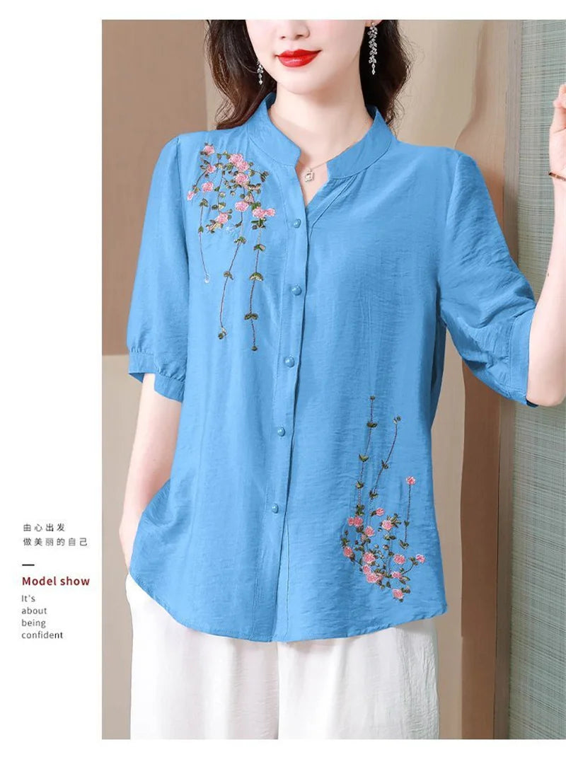 Embroidered V-Neck Summer Cotton Linen Blouse Women’s Short Sleeve Loose Cardigan Top Plus Size 4XL