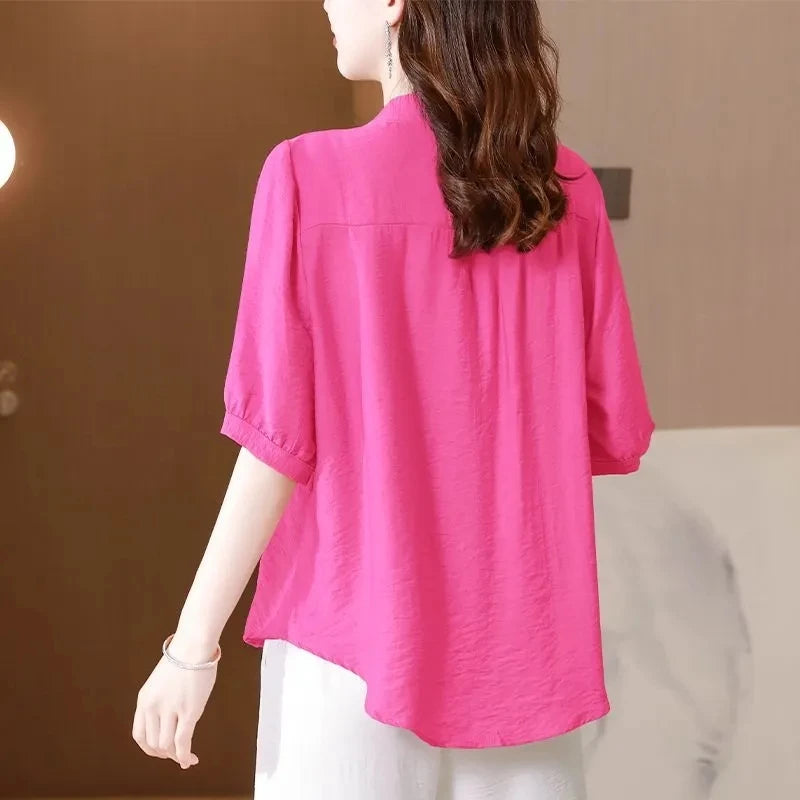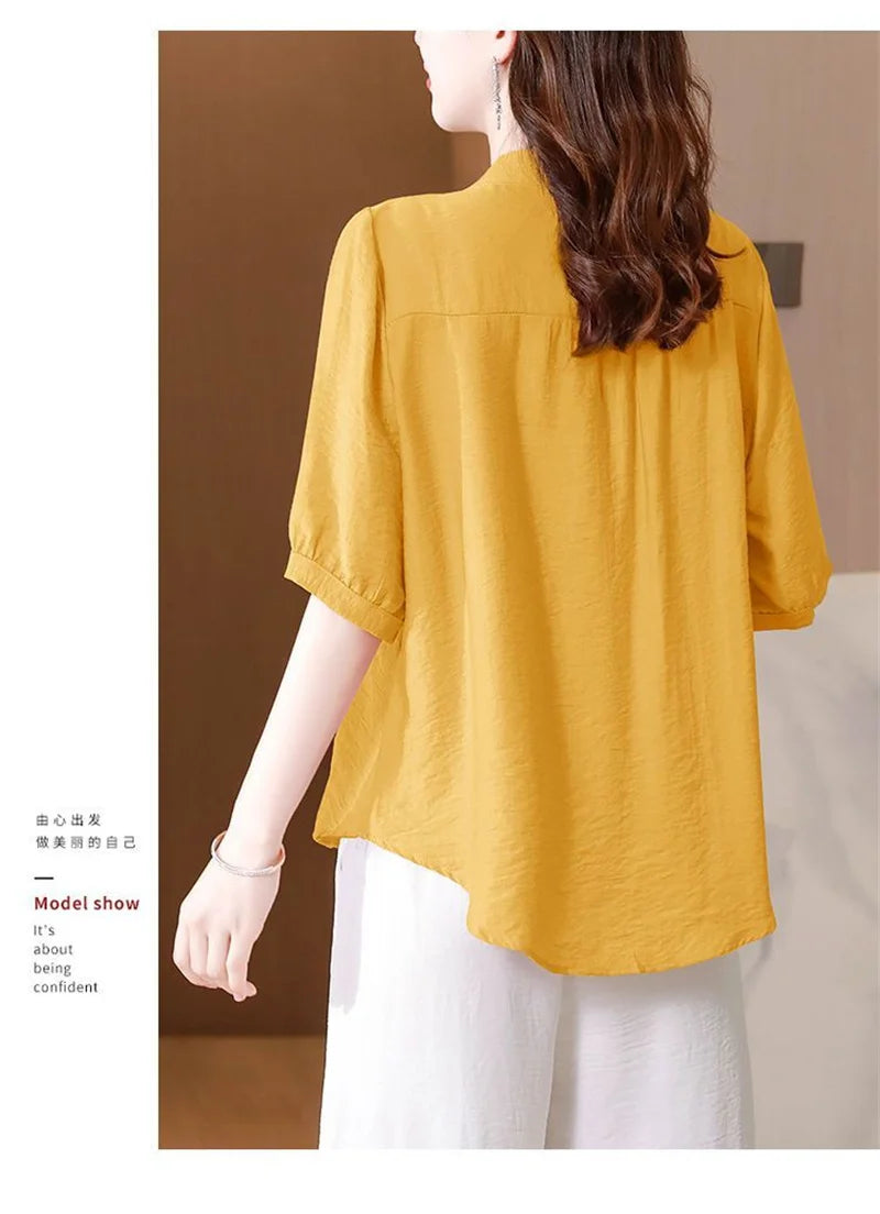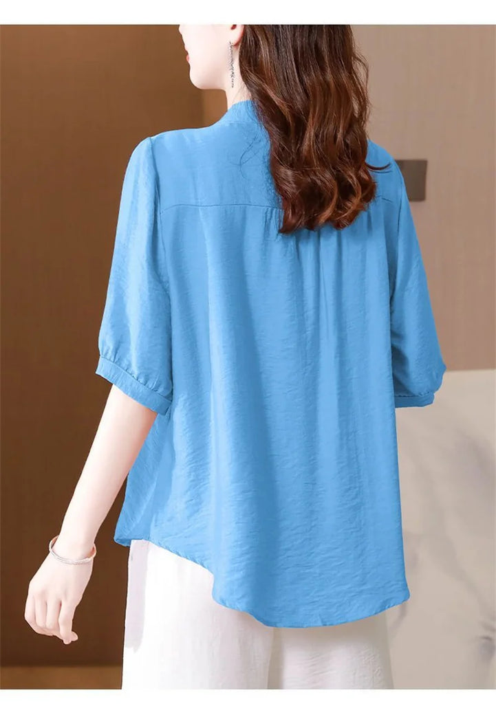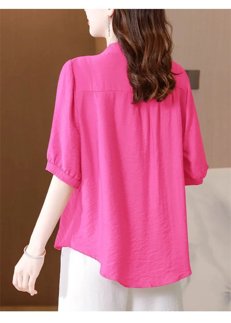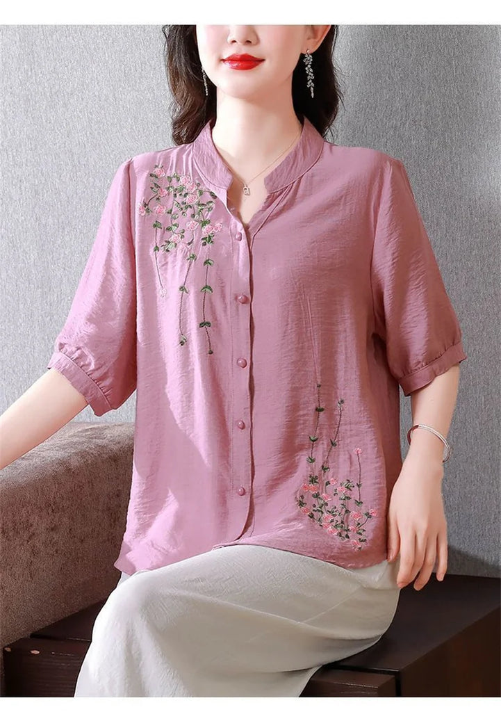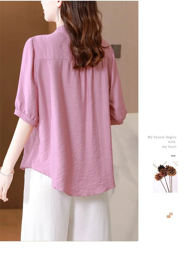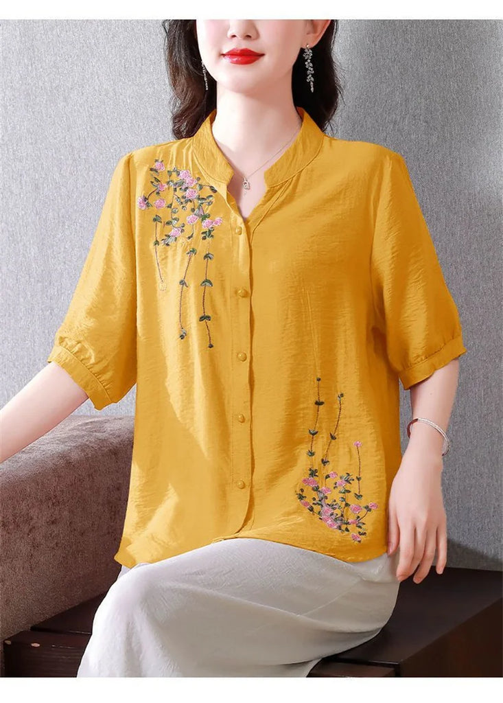 Embroidered V-Neck Summer Cotton Linen Blouse Women’s Short Sleeve Loose Cardigan Top Plus Size 4XL