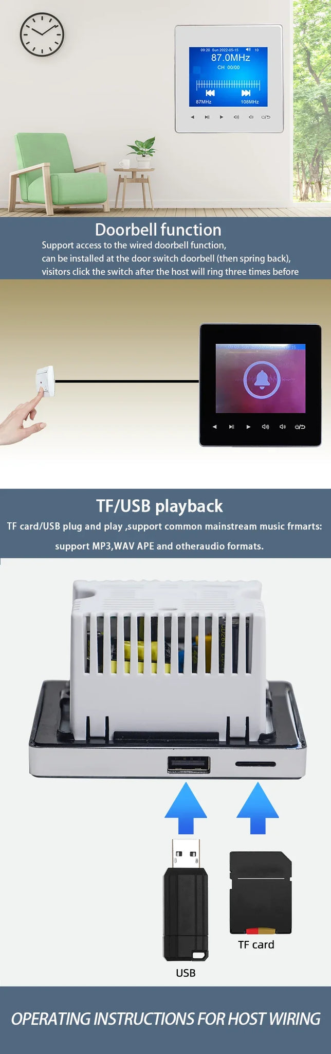 - Installation: 86 standard wire box, front wall