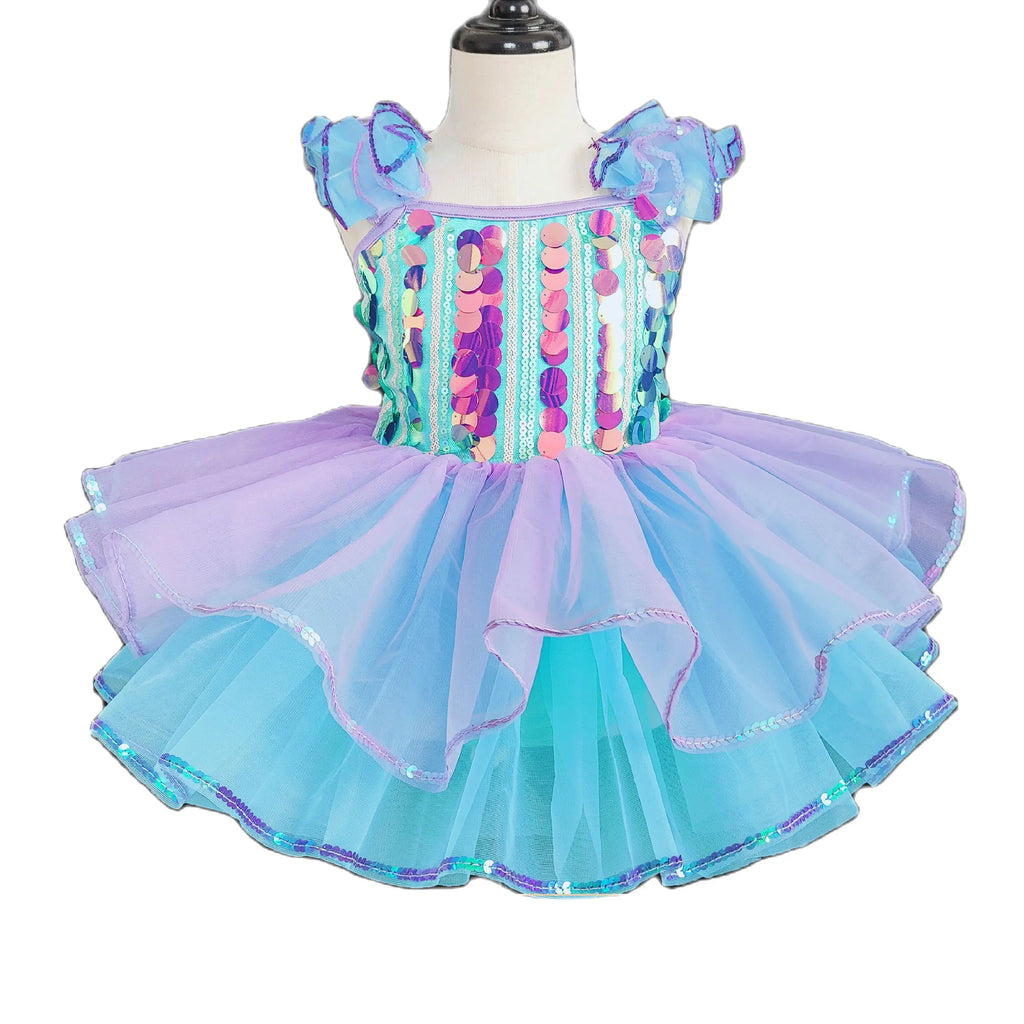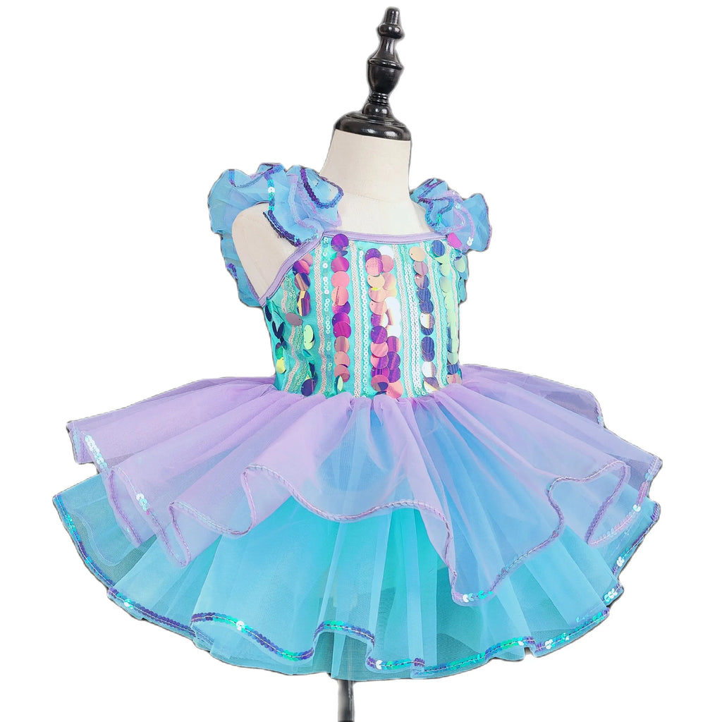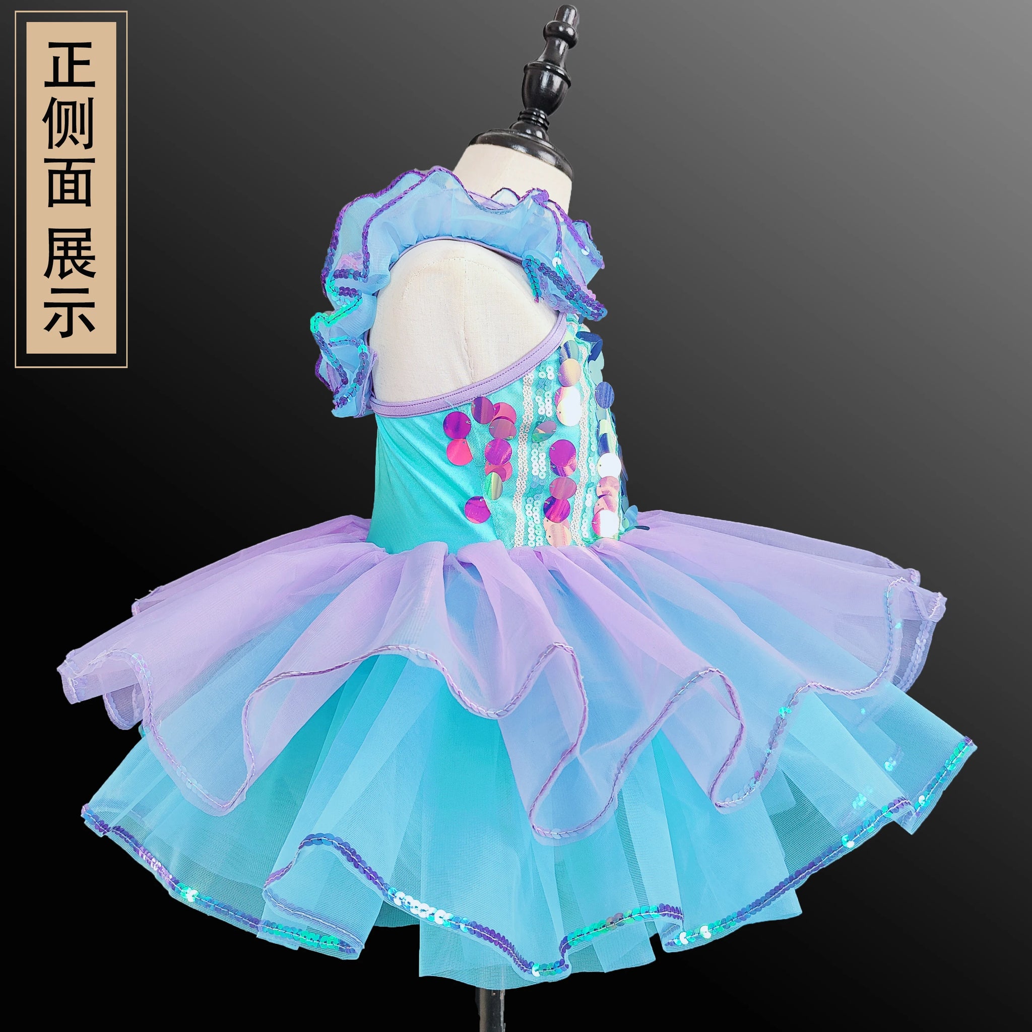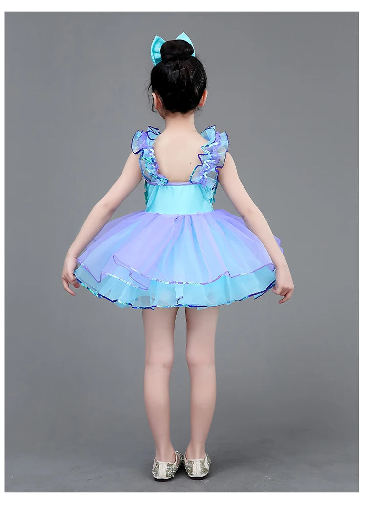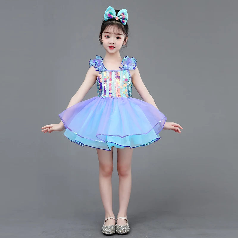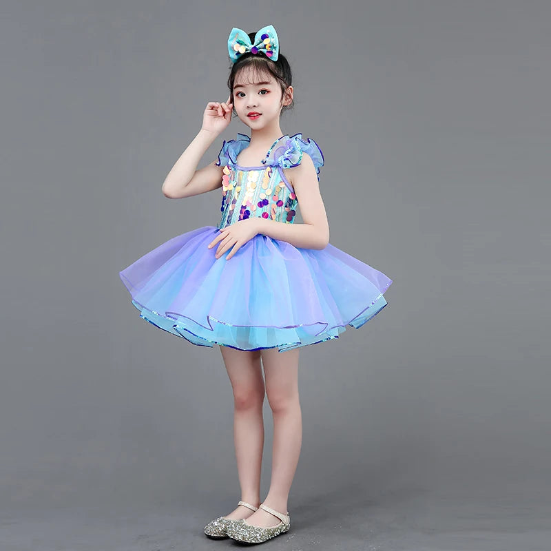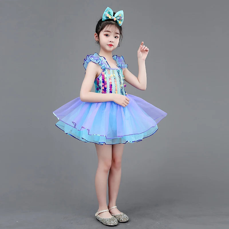 Blue Sequined Ballroom Dance Tutu Dress for Kids - Modern Jazz Party Wear