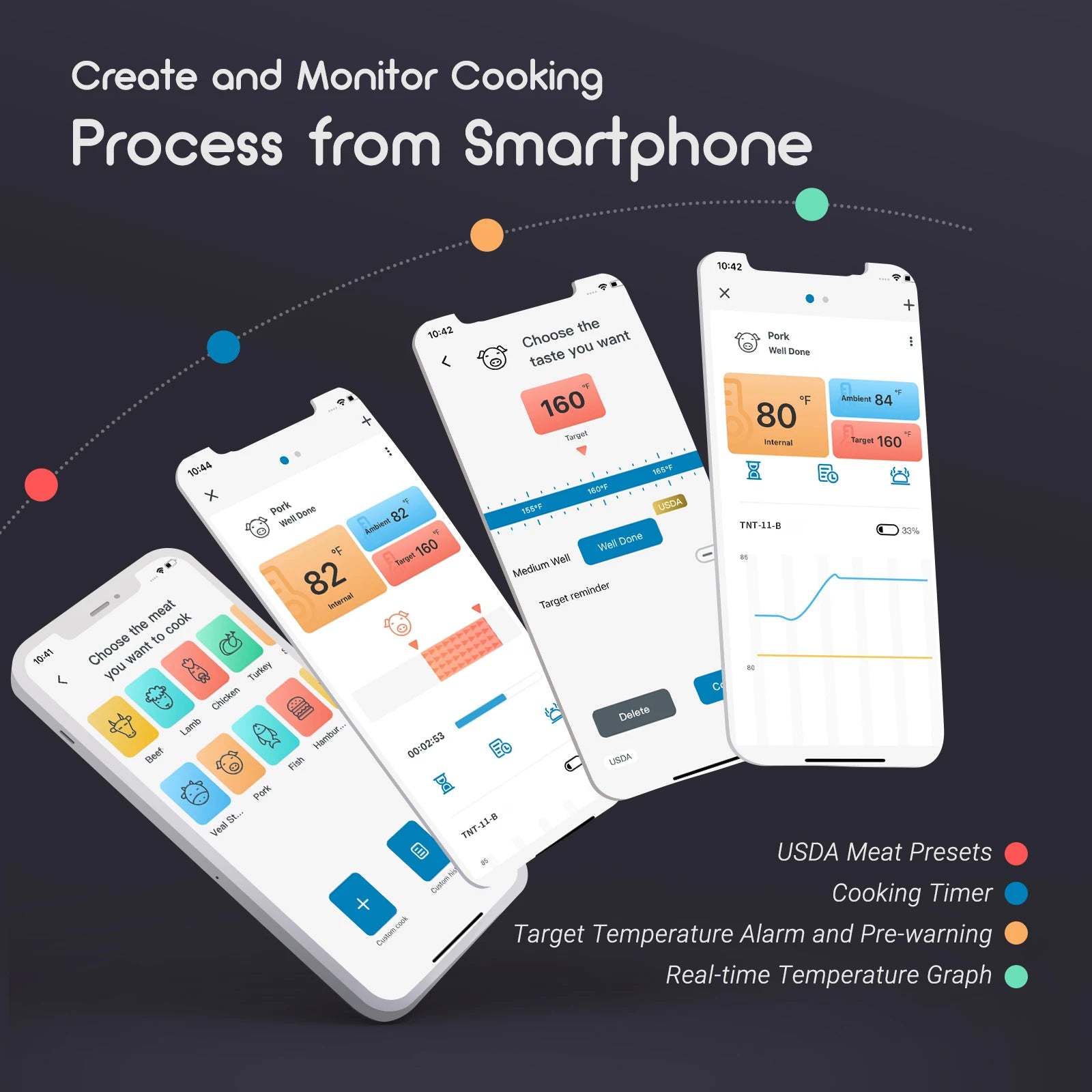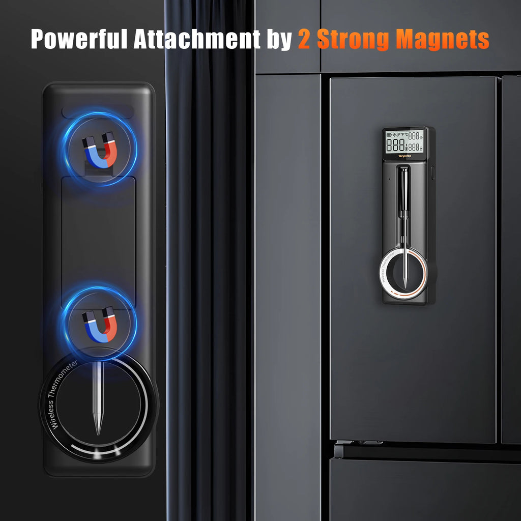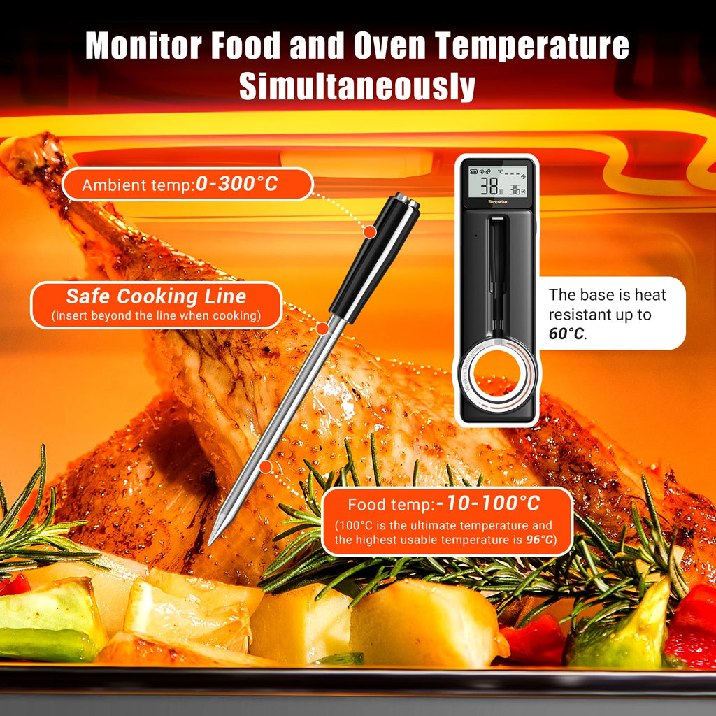 Introducing the advanced Bluetooth Meat Thermometer, designed for precise and convenient cooking. This state-of-the-art thermometer offers Bluetooth 5.4 connectivity with a range of up to 328 feet (100 meters), allowing you to monitor your cooking without obstacles. Its ultra-thin, food-grade stainless steel probe with an alumina ceramic handle ensures minimal damage to meat texture and fast response times within one second.