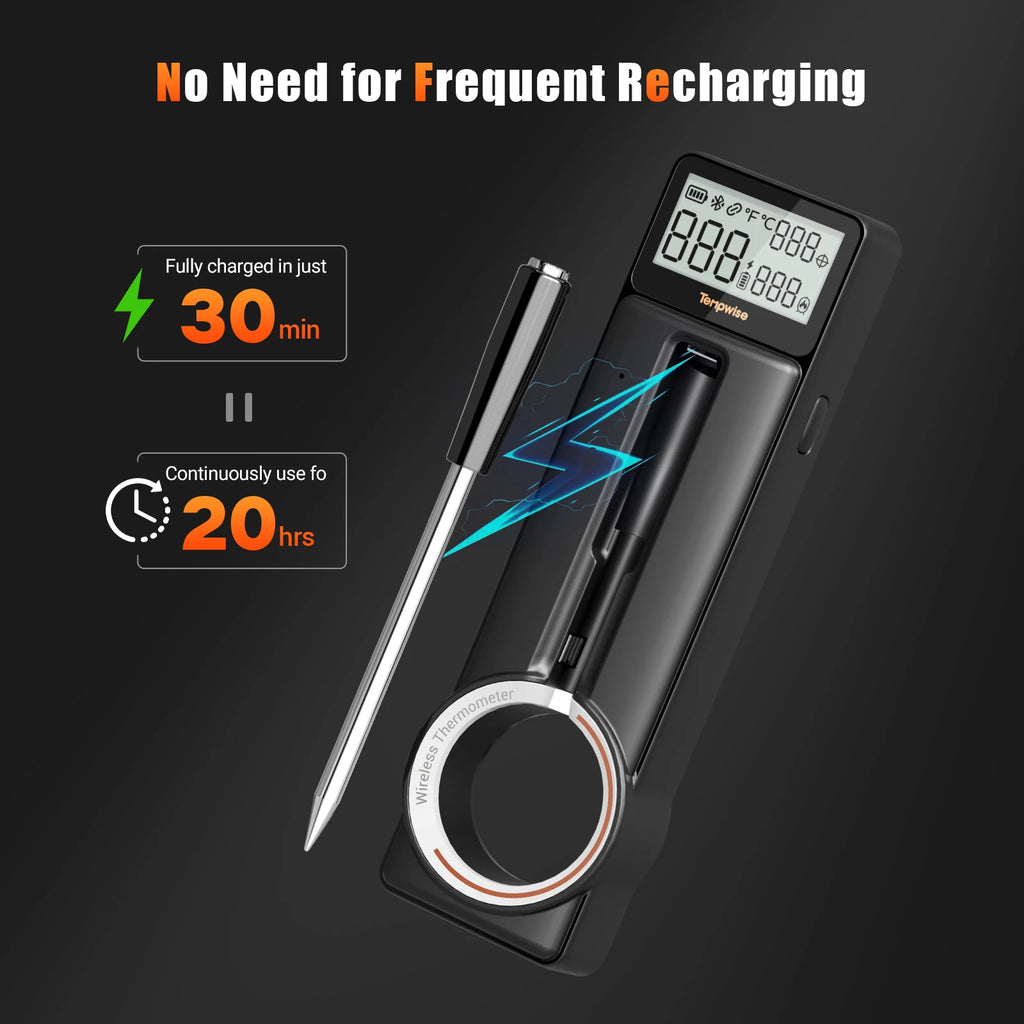 Powered by 2 AAA batteries, the thermometer's base can remain active for up to 120 hours. The probe charges in just 30 minutes and offers continuous use for up to 20 hours. Additionally, it saves 60 minutes of offline temperature data and auto-syncs with the app once connected. Note: Ensure the probe is inserted deep enough when in use, and it’s not suitable for pressure cookers or microwaves.